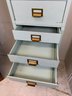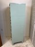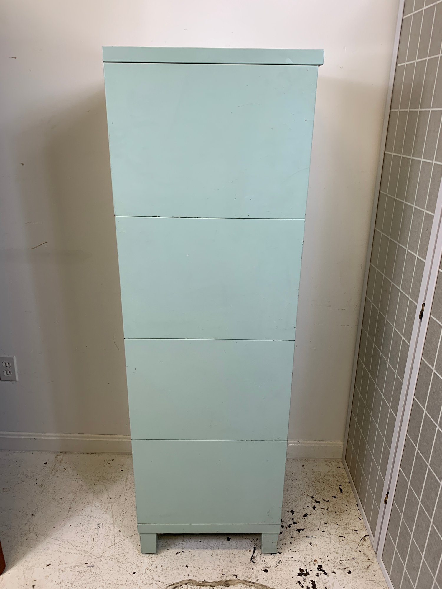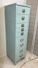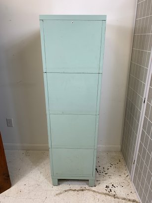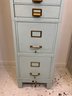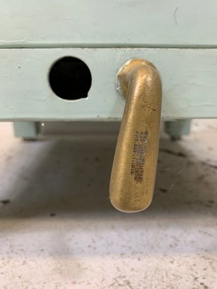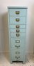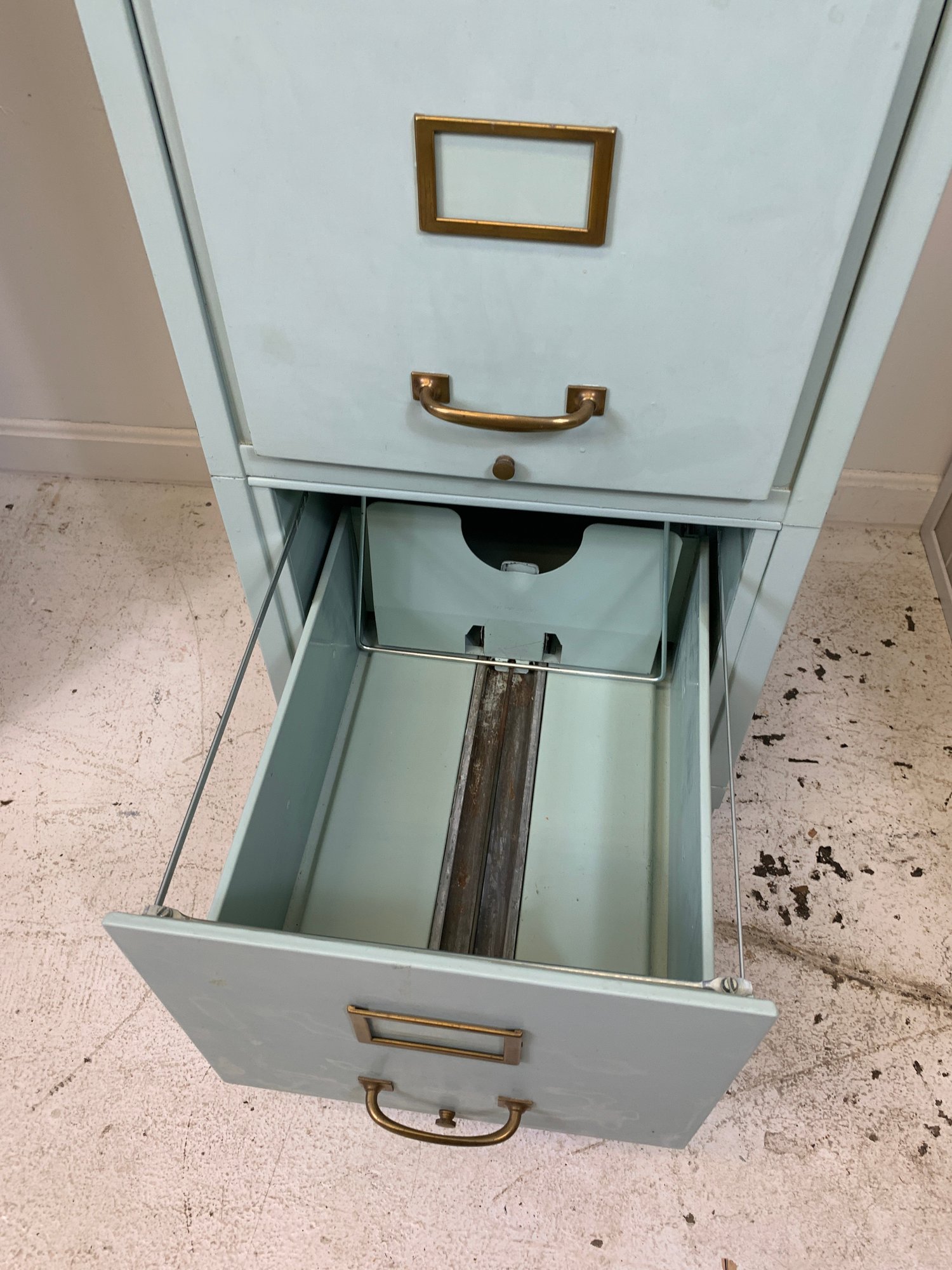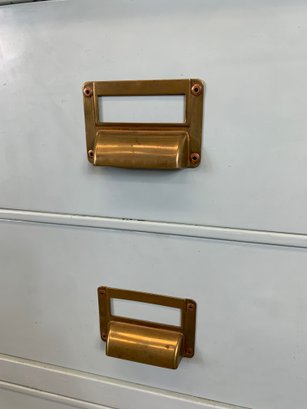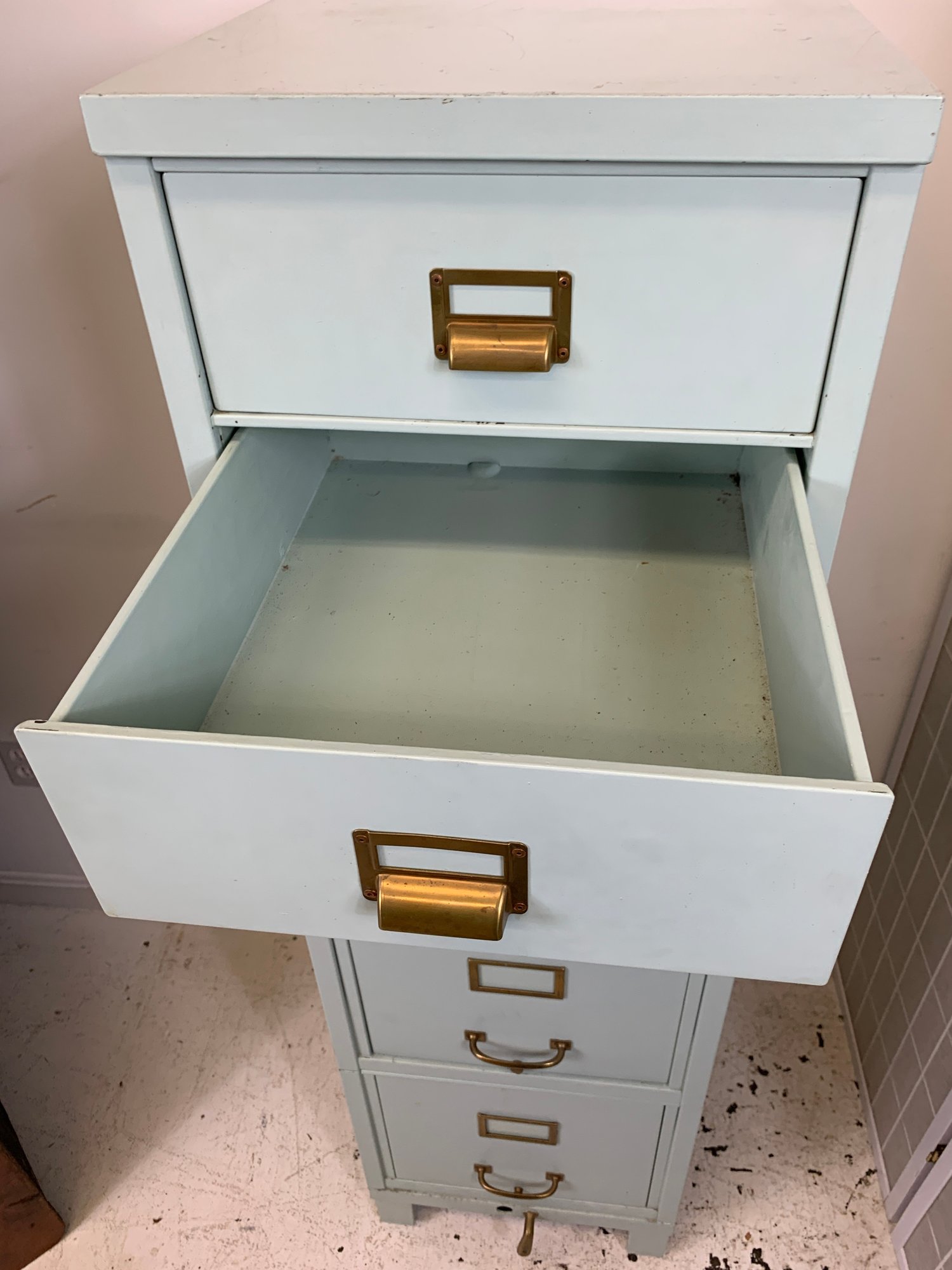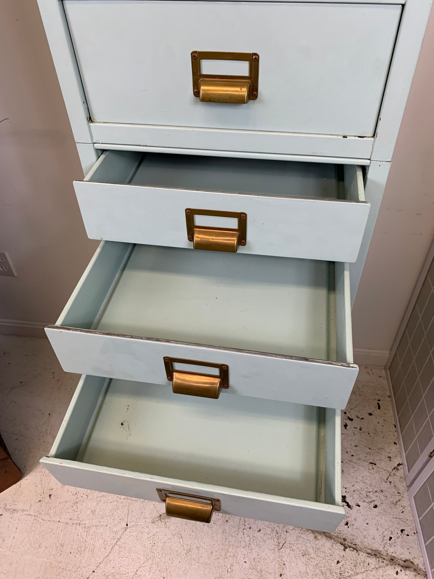 Heavy gauge steel filing cabinet painted in duck egg blue/mint, fitted with brass label holders, bail pulls, and arch handles throughout. Brass anti-tip locking lever at base. Disassembles into 6 stackable sections. Mid-20th century.