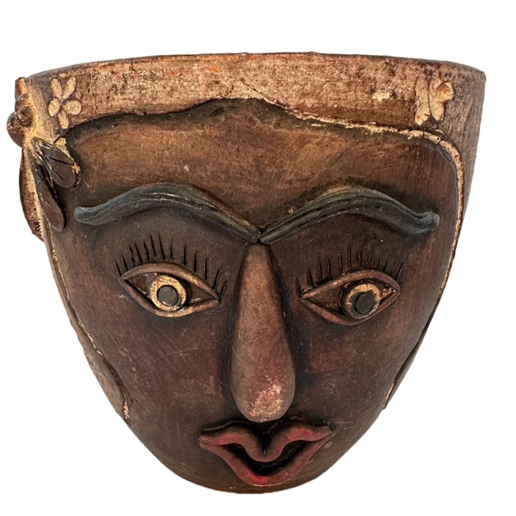 A fun design with a carved floral motif and applied female facial features.