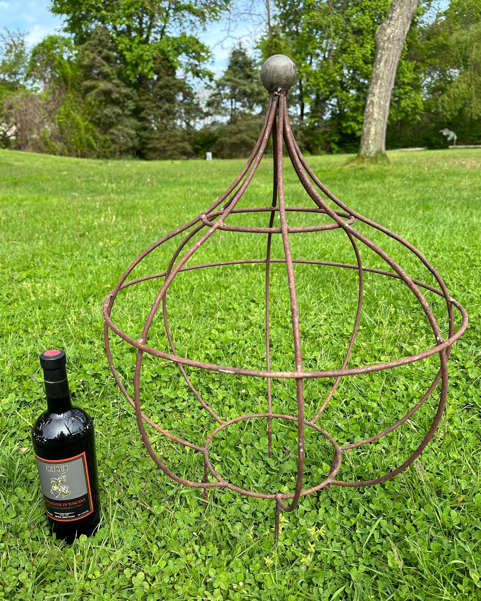 A vintage outdoor metal flower topiary garden element in the form of a bulb.