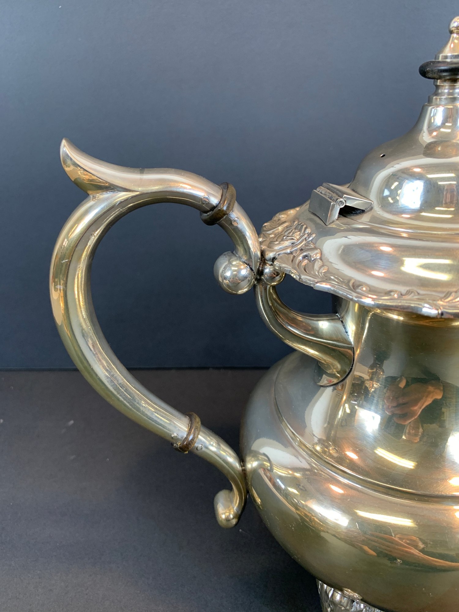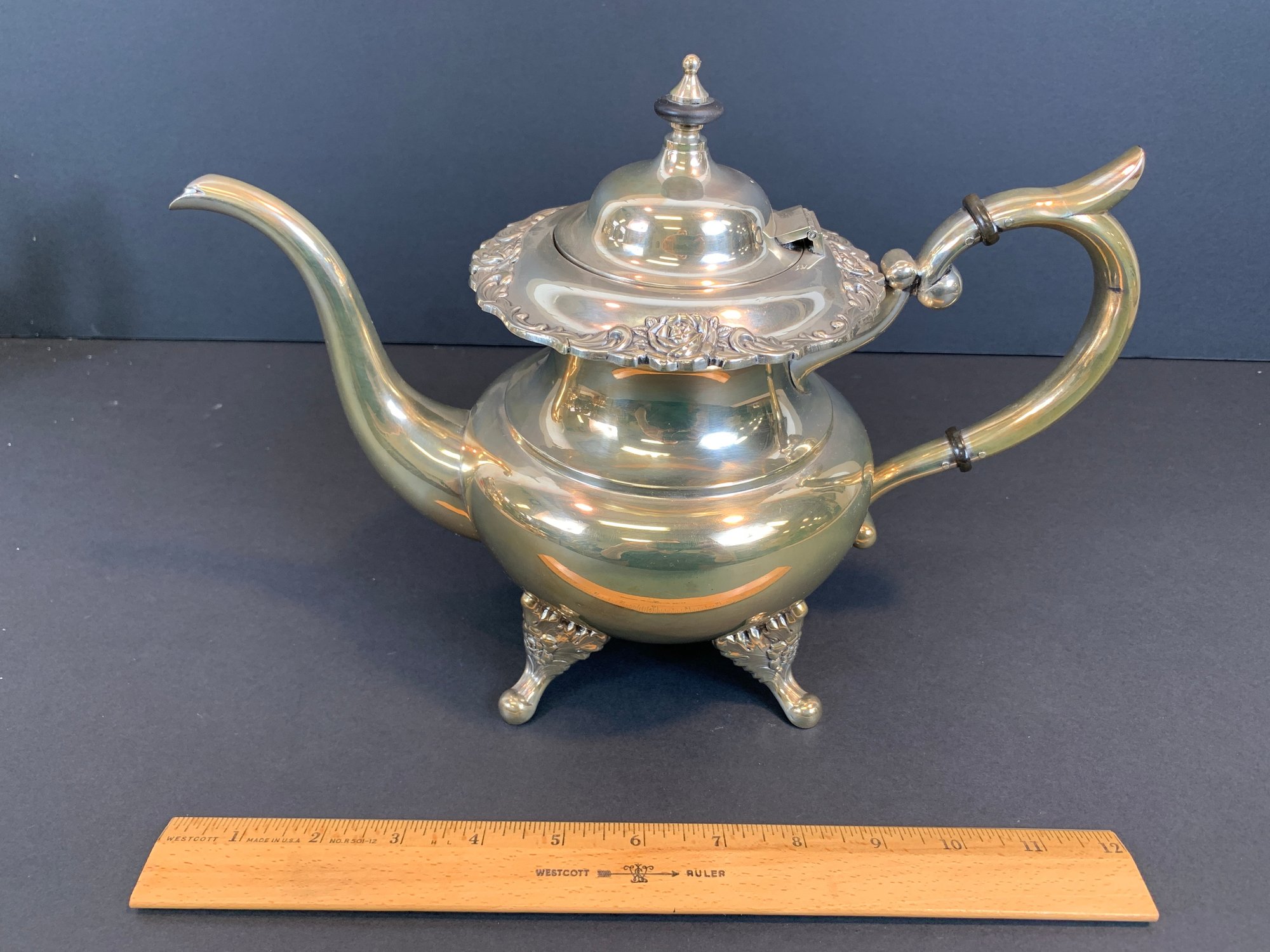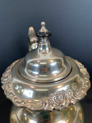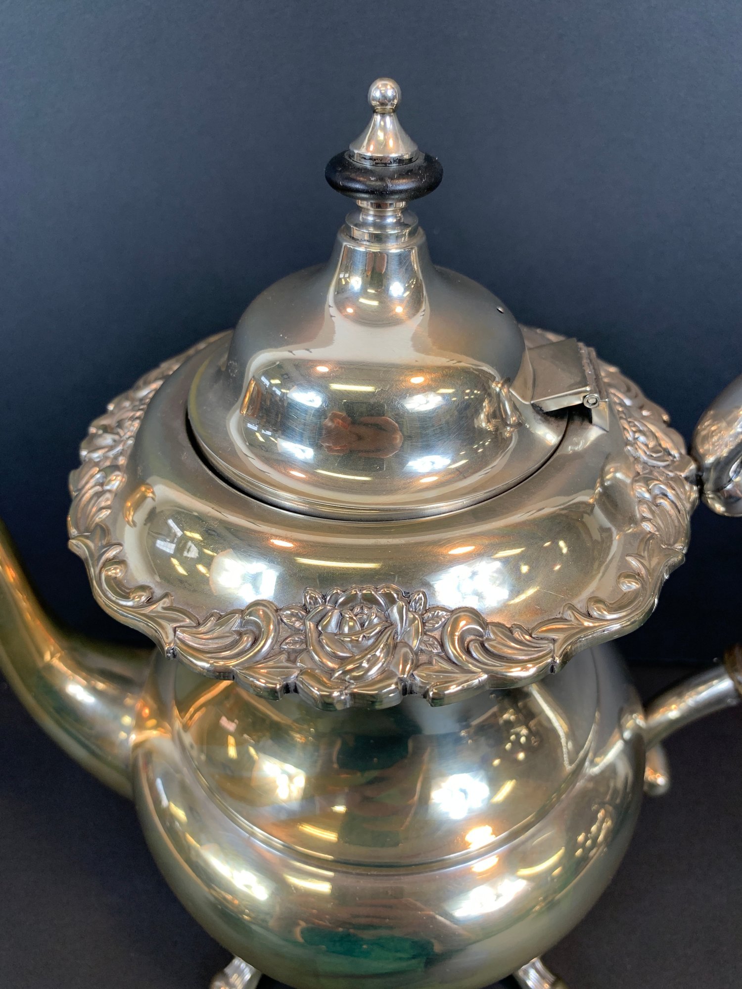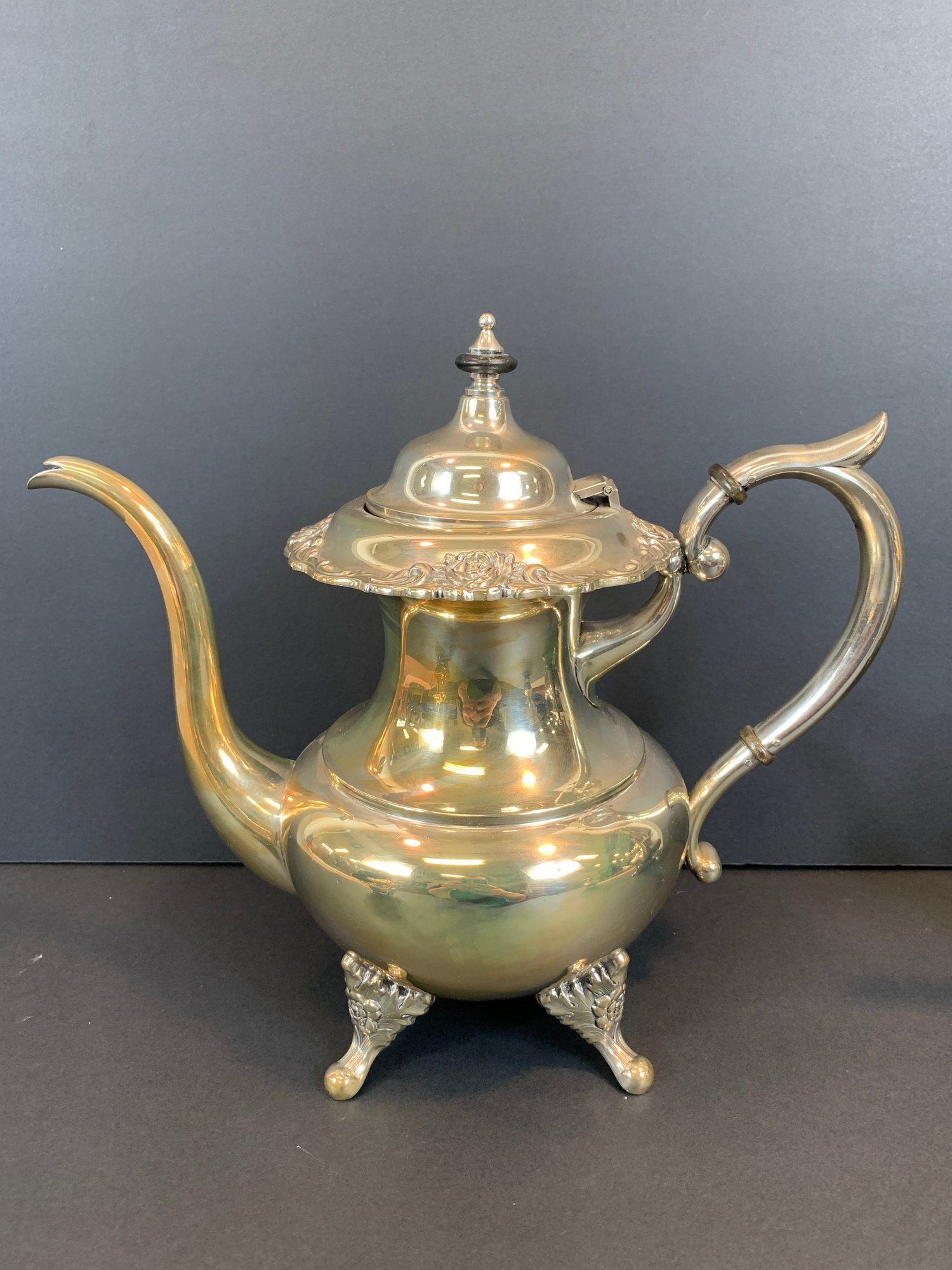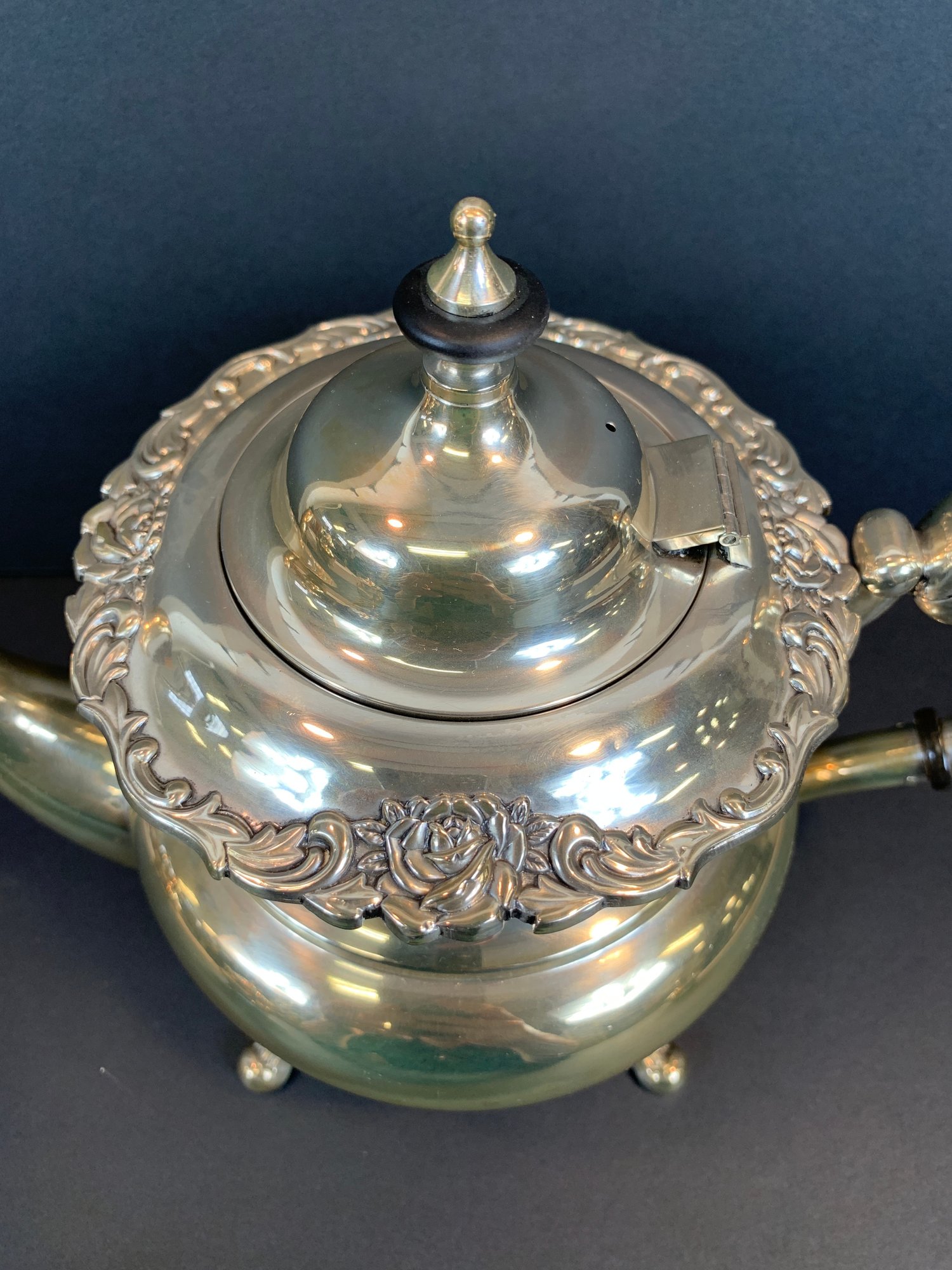 4 piece tea and coffee service with a scrolled floral design and ebonized wood detail on finials , marked on bottom , comprising a coffee pot, teapot, covered sugar bowl and creamer. All solid silver.