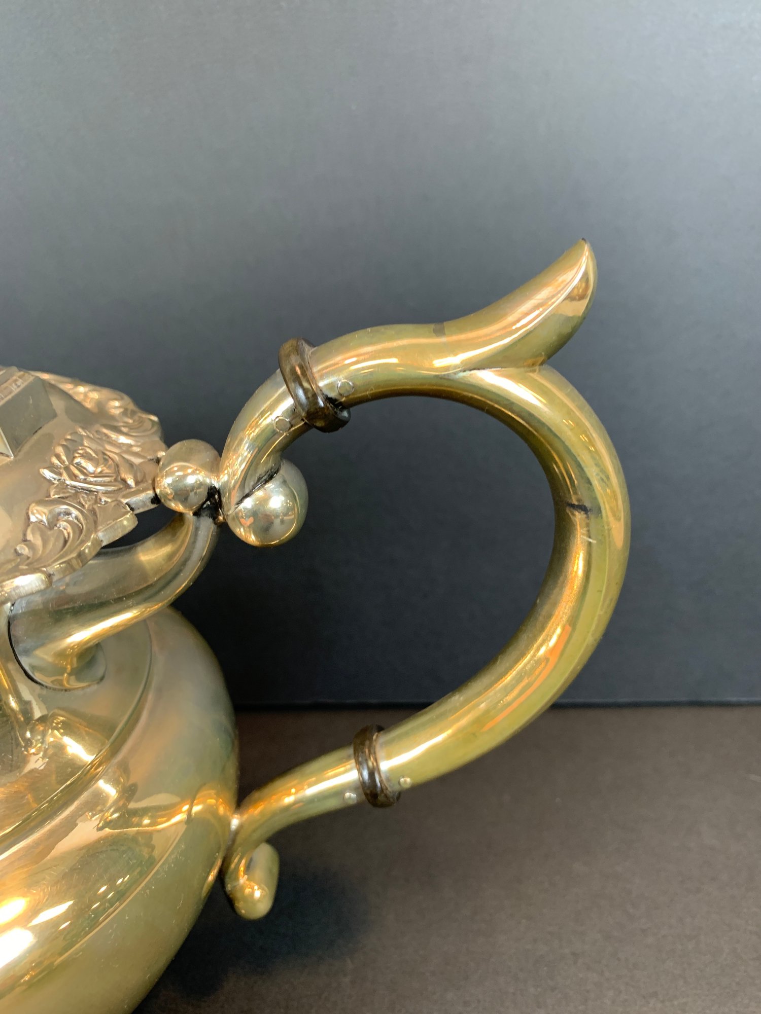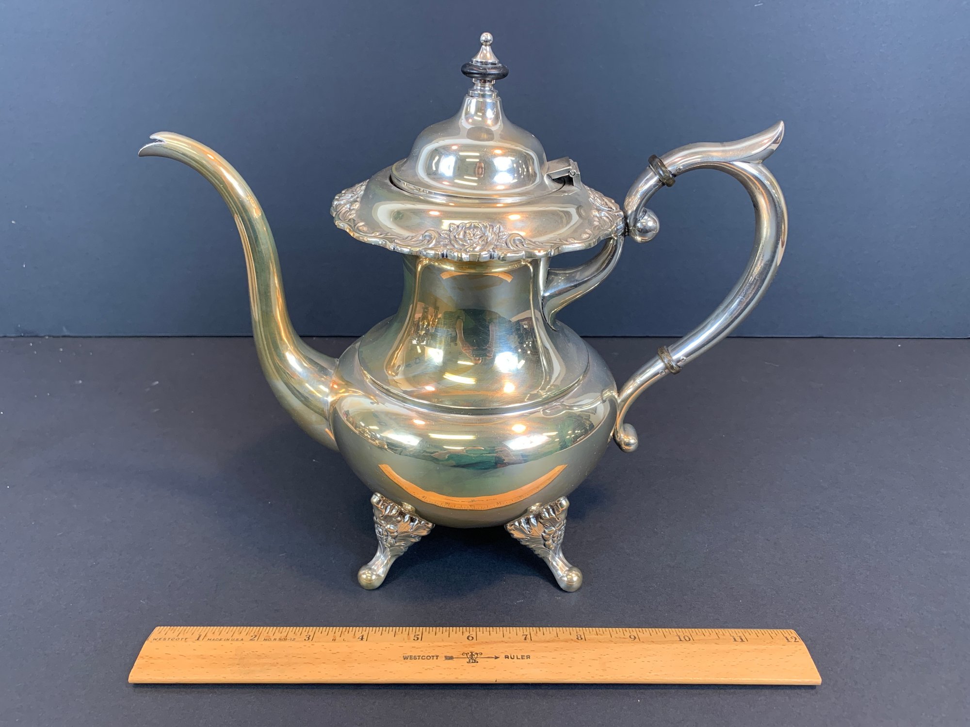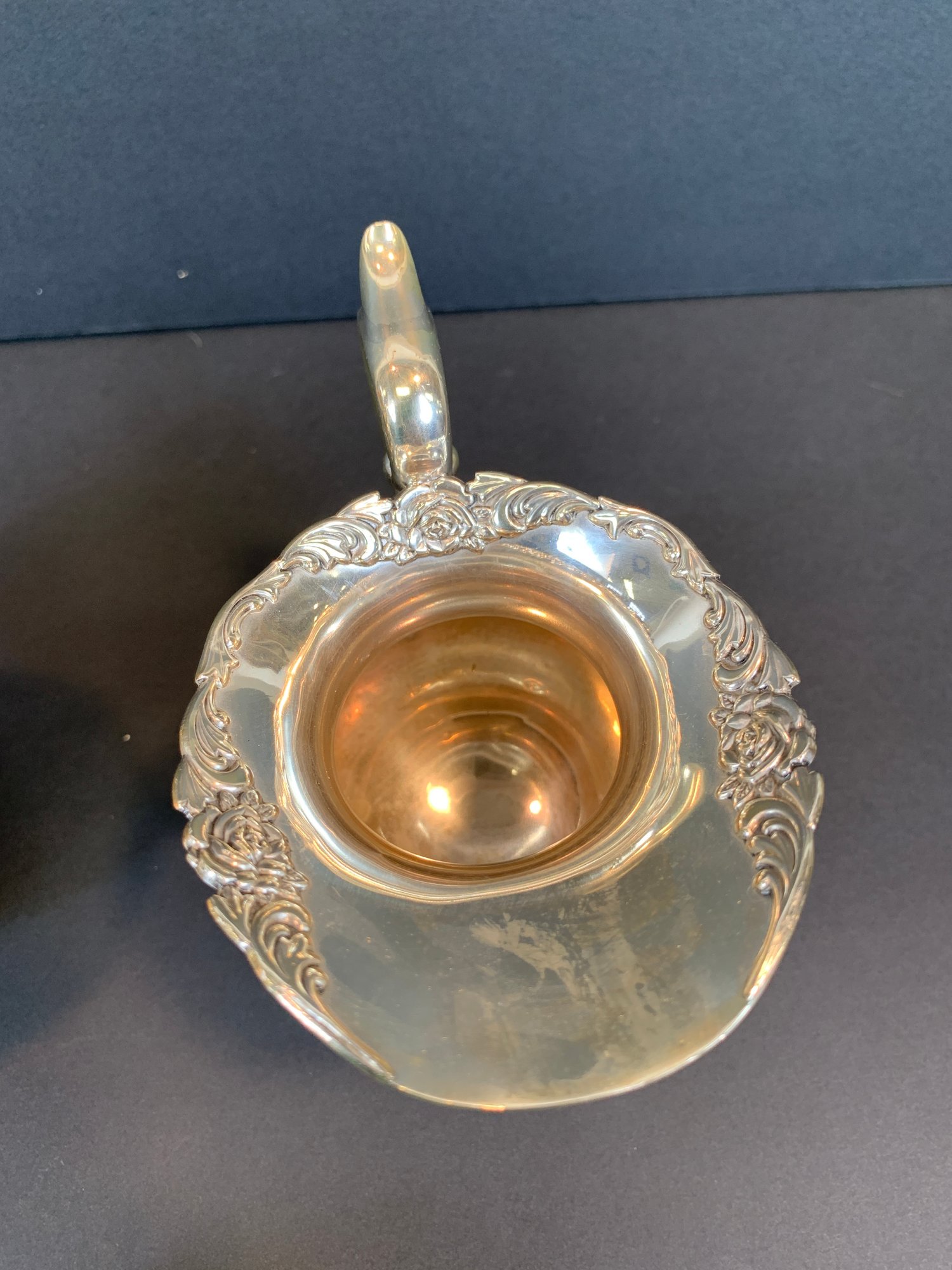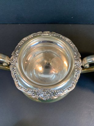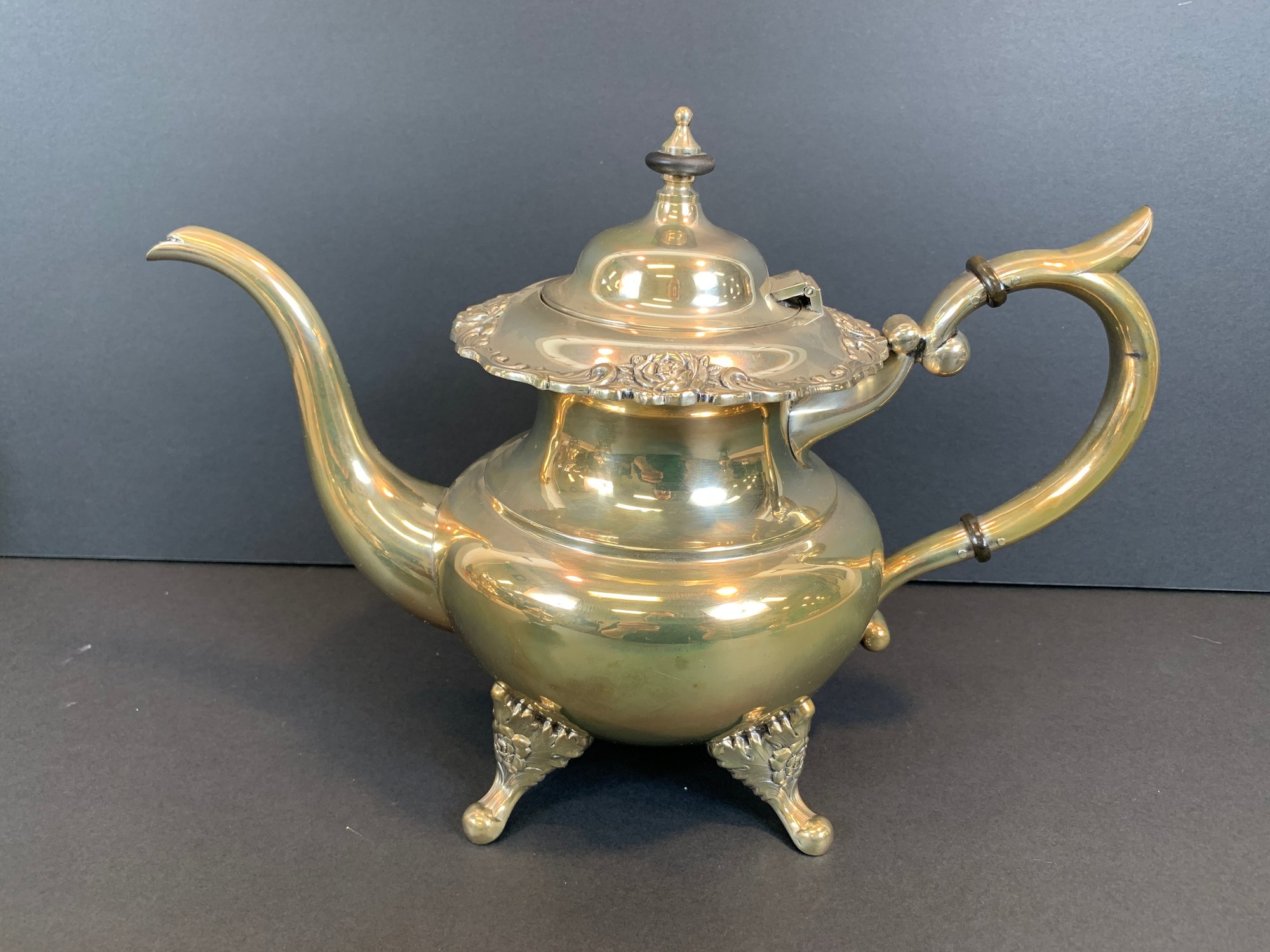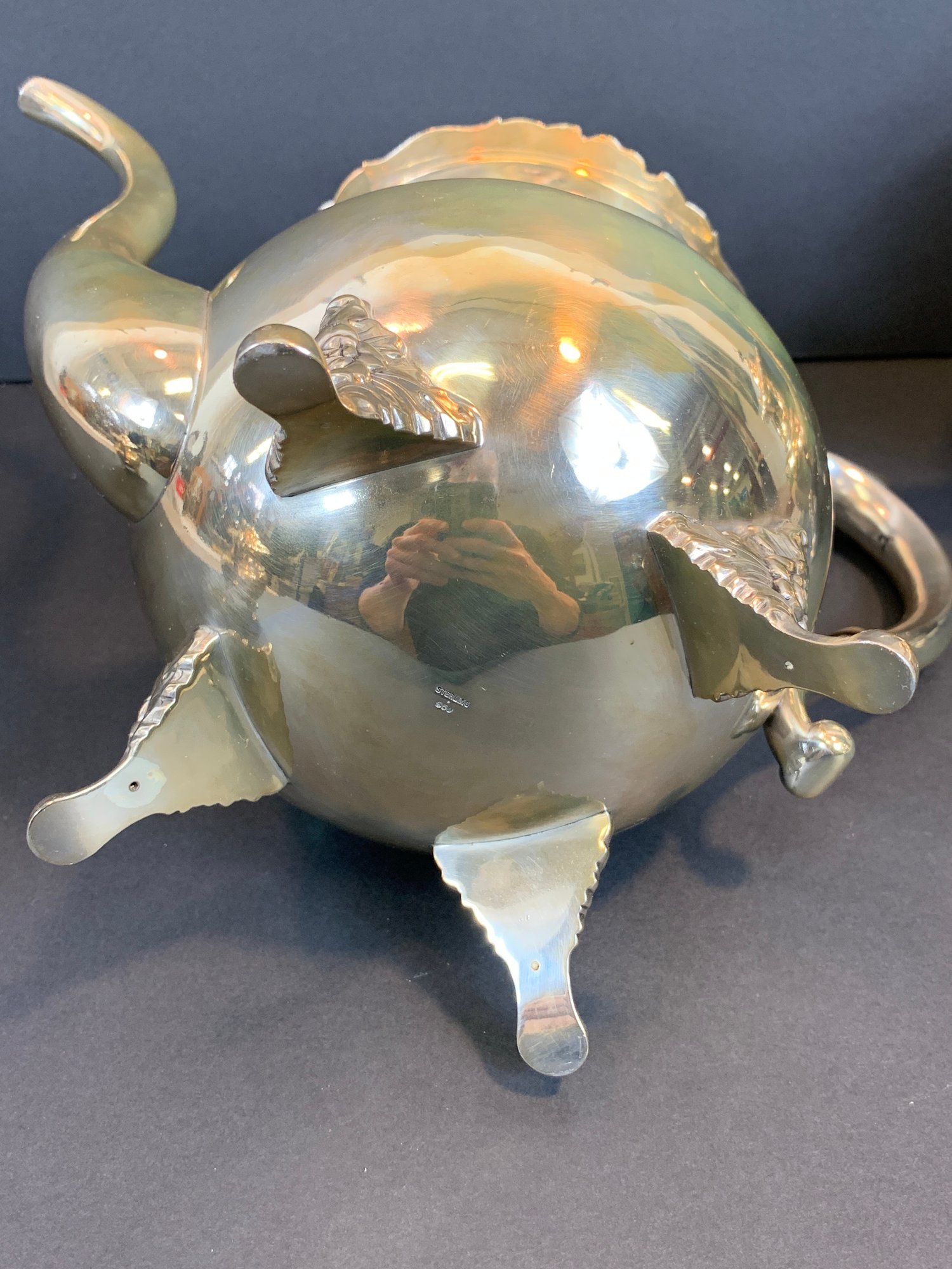 4 piece tea and coffee service with a scrolled floral design and ebonized wood detail on finials , marked on bottom , comprising a coffee pot, teapot, covered sugar bowl and creamer. All solid silver.