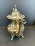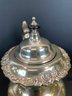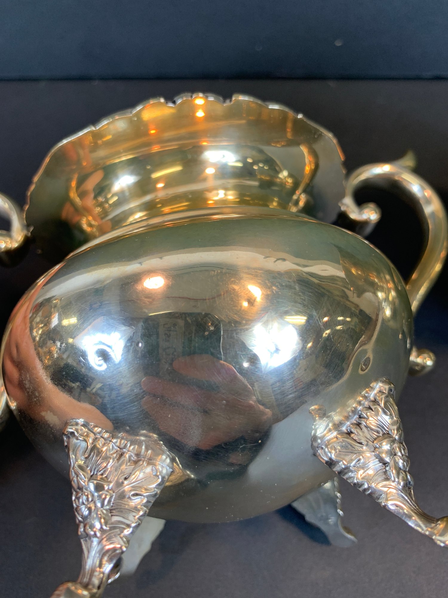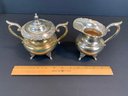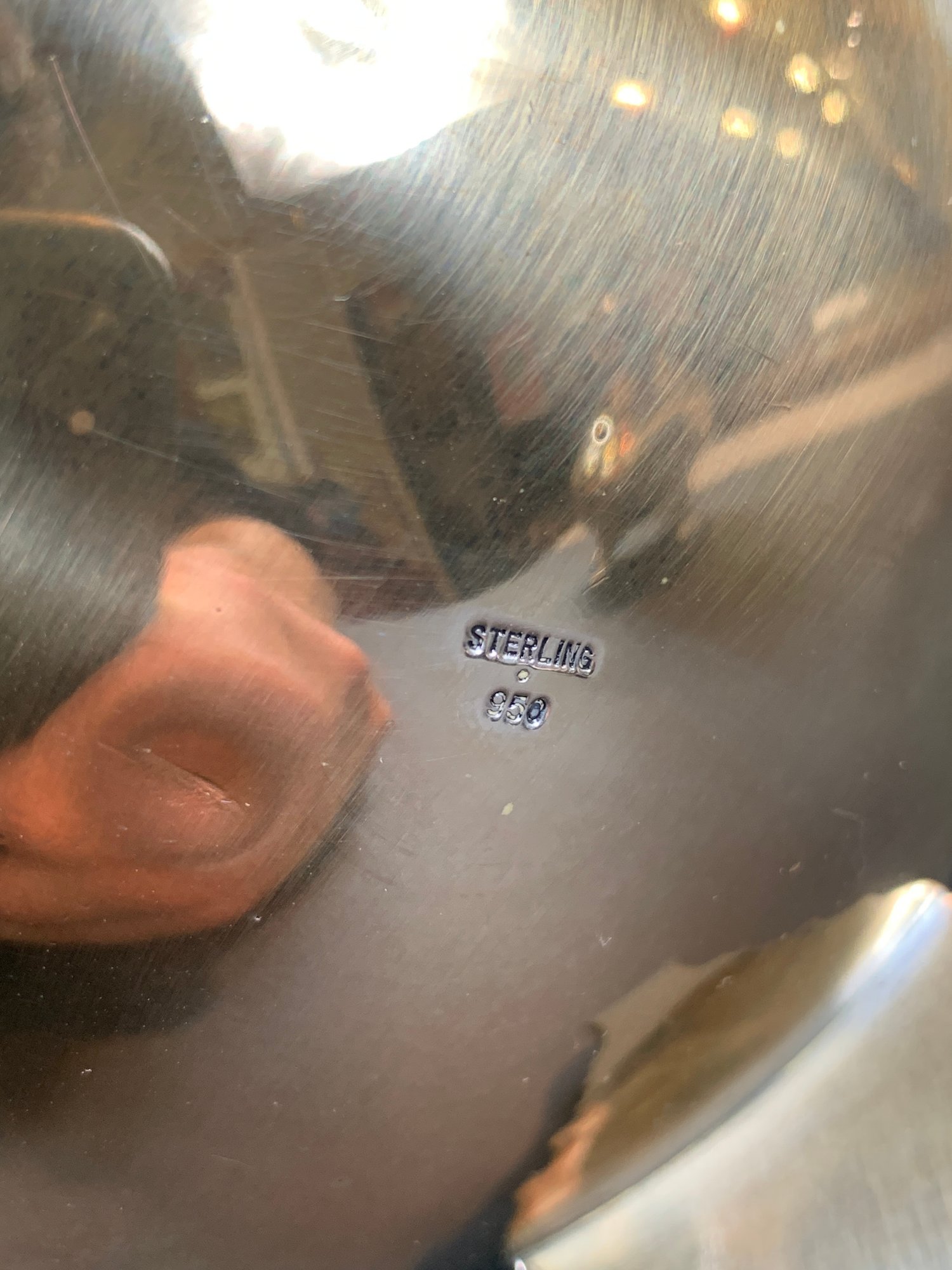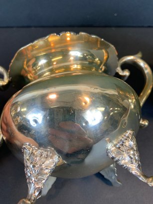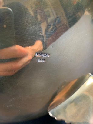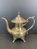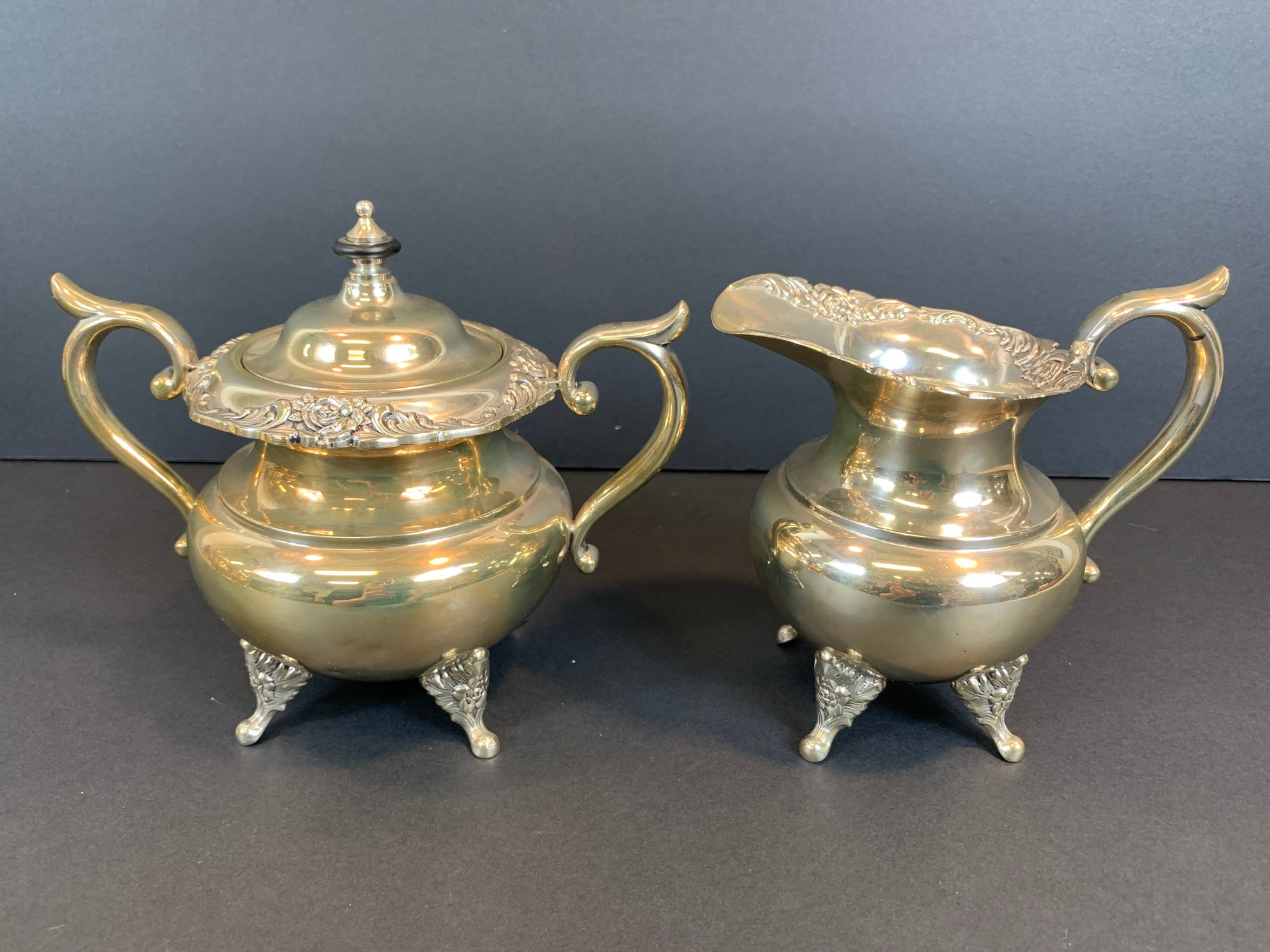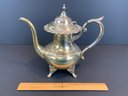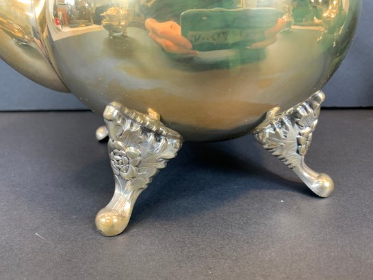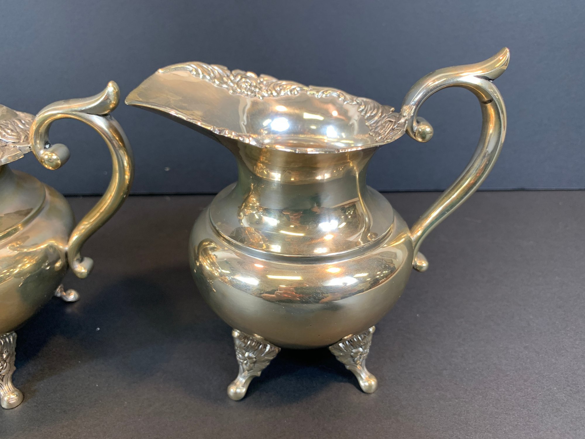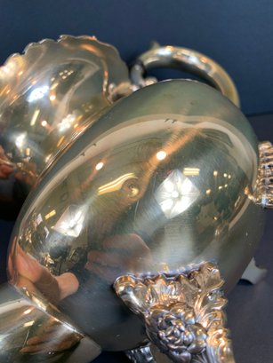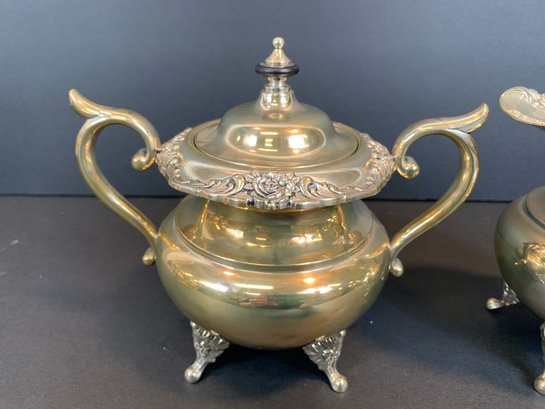 4 piece tea and coffee service with a scrolled floral design and ebonized wood detail on finials , marked on bottom , comprising a coffee pot, teapot, covered sugar bowl and creamer. All solid silver.