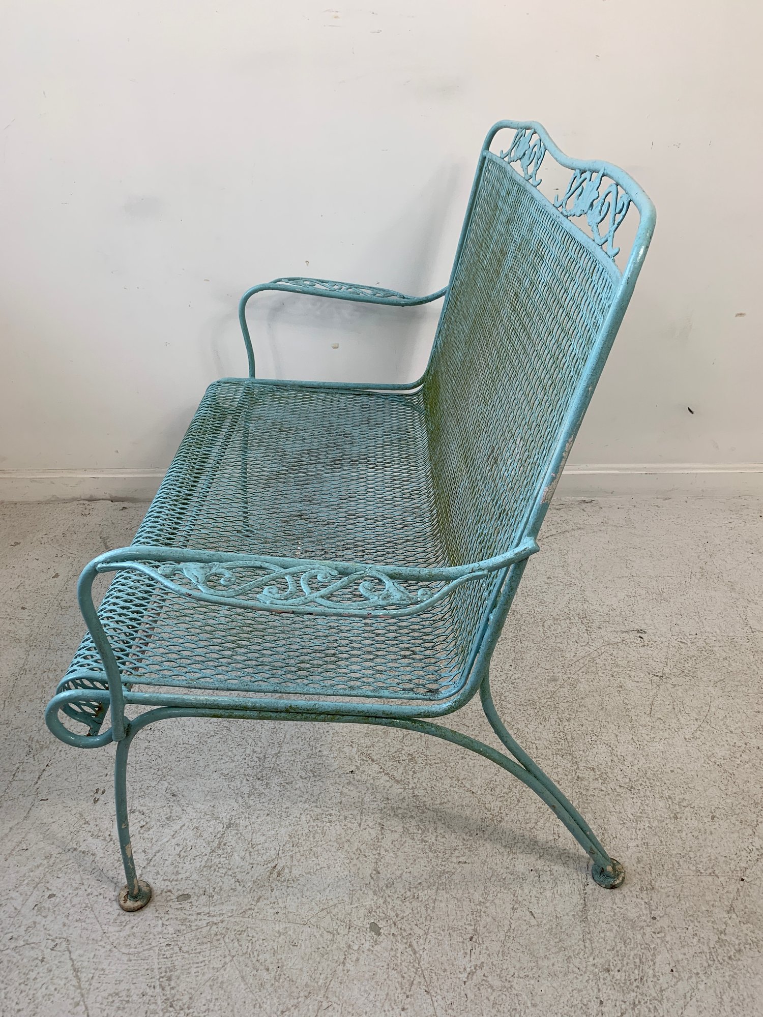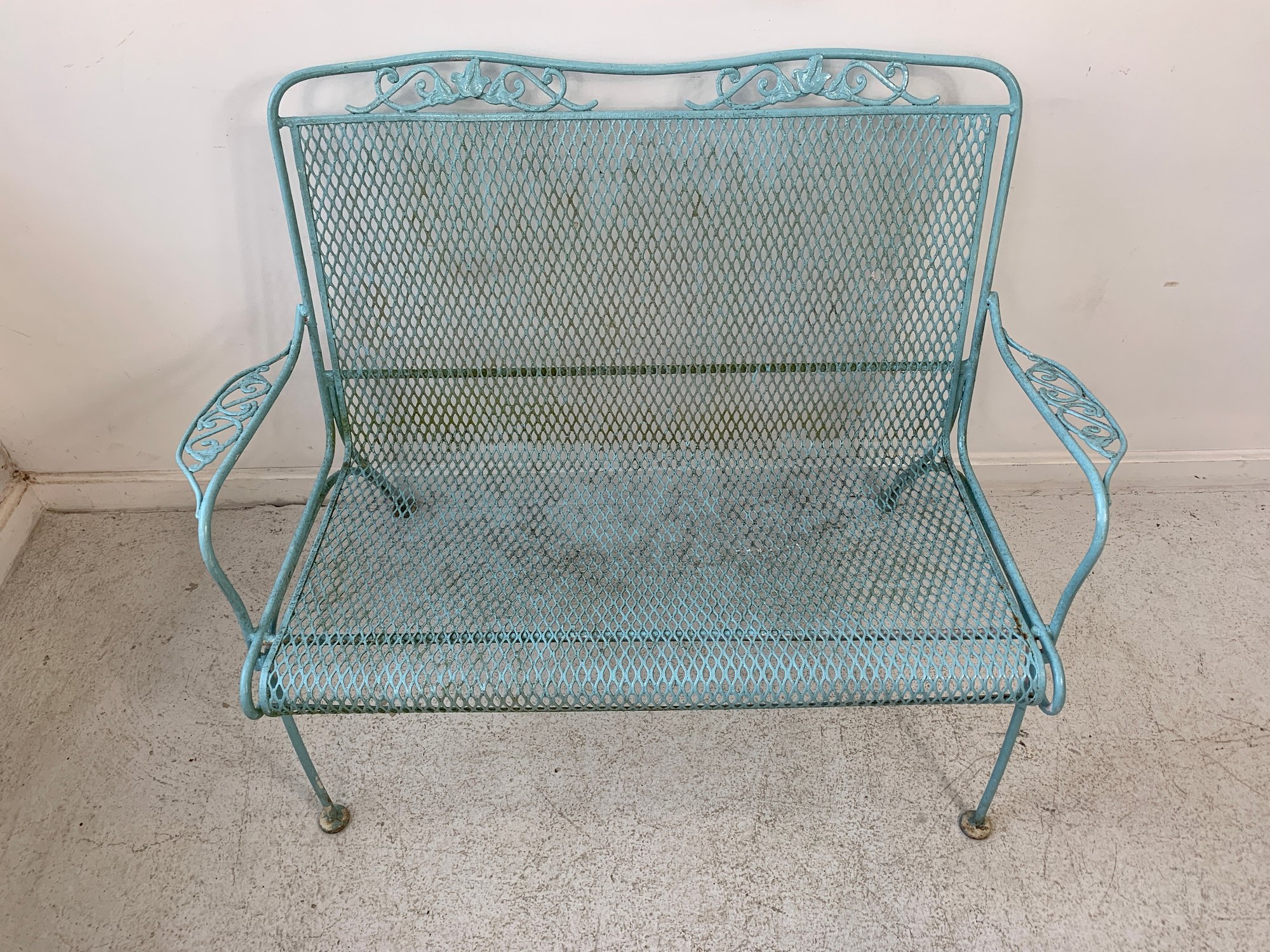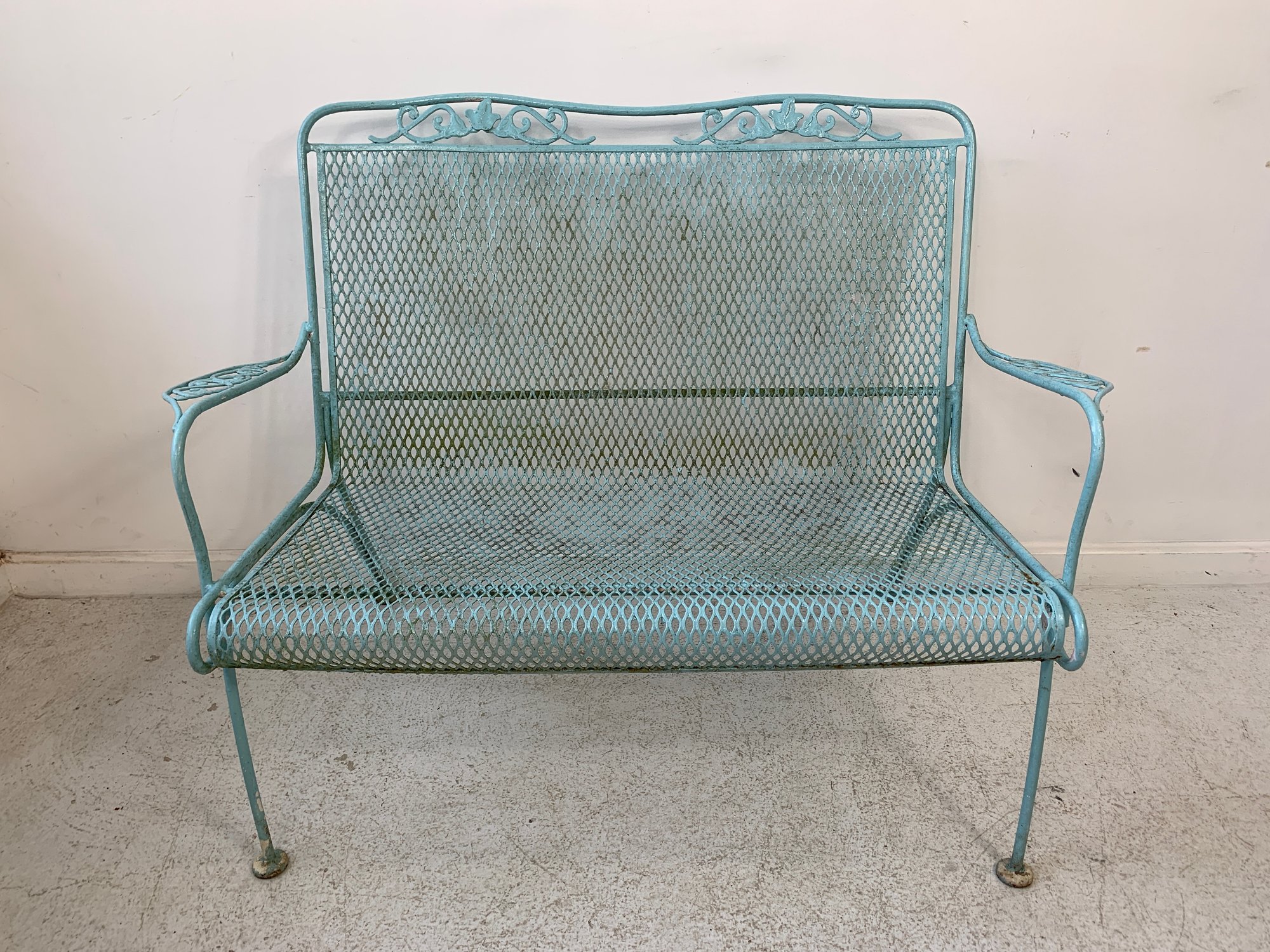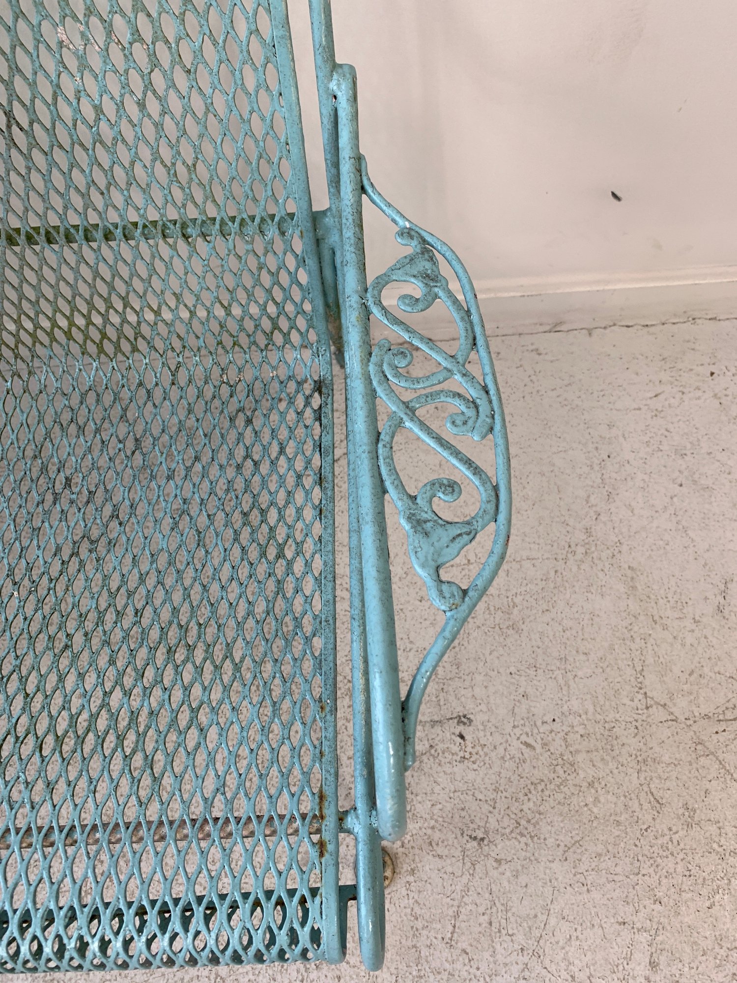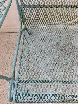 Vintage Woodard wrought iron garden settee in turquoise/aqua painted finish. Features steel mesh seat and back with decorative scrolling rail and scroll-end armrests. Raised on straight legs with pad feet. Sturdy and solid.