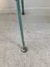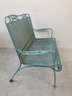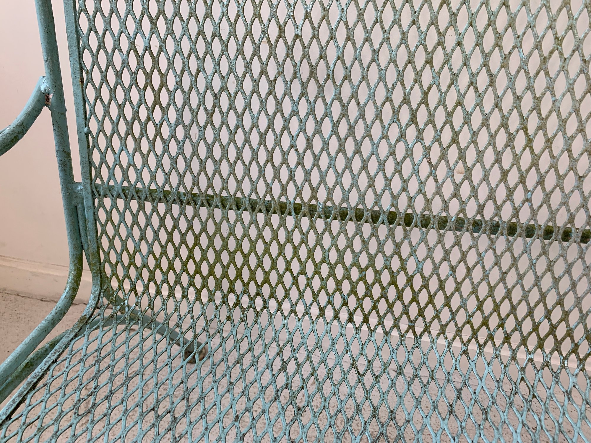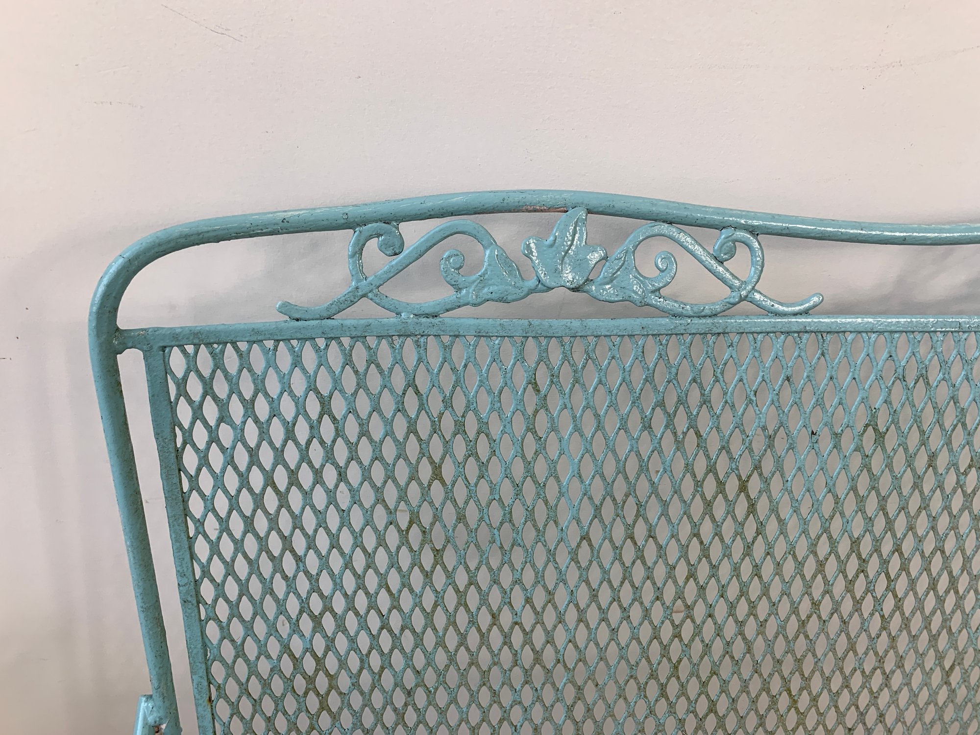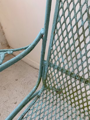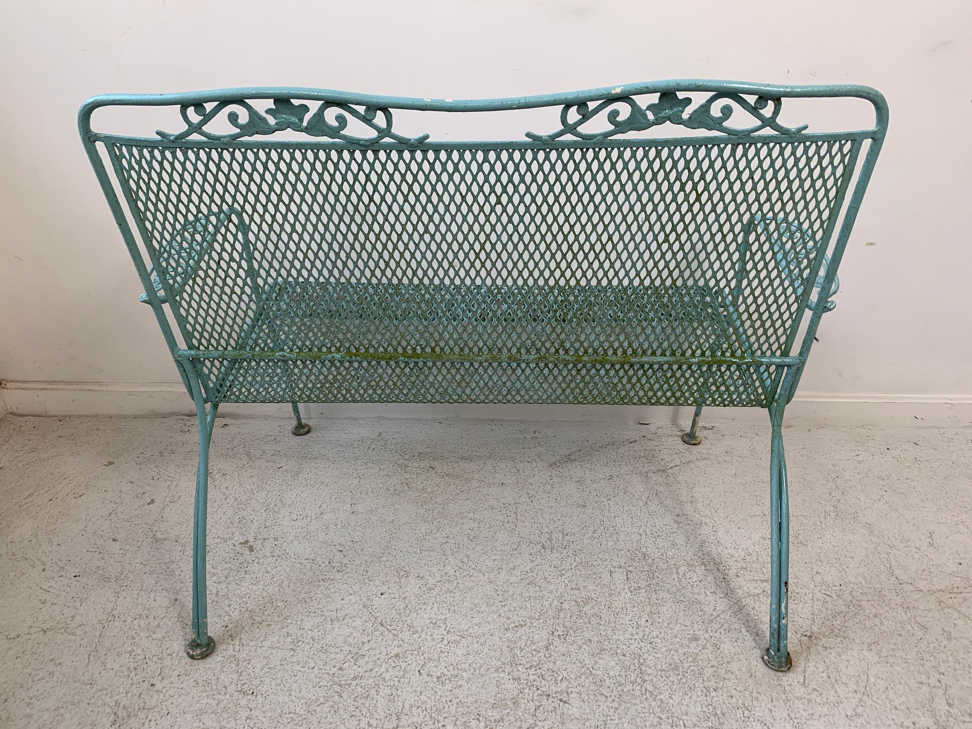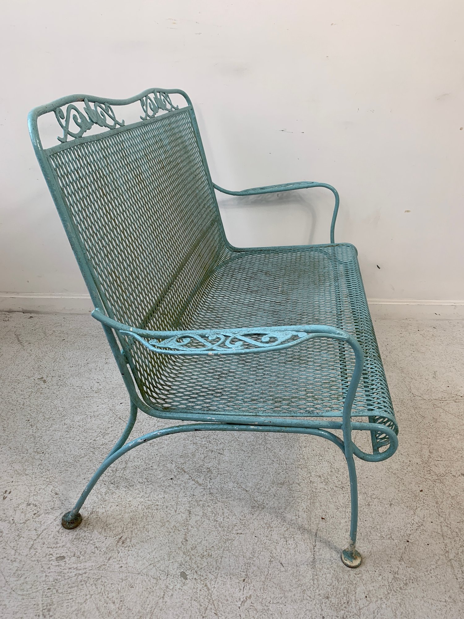 Vintage Woodard wrought iron garden settee in turquoise/aqua painted finish. Features steel mesh seat and back with decorative scrolling rail and scroll-end armrests. Raised on straight legs with pad feet. Sturdy and solid.