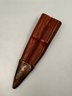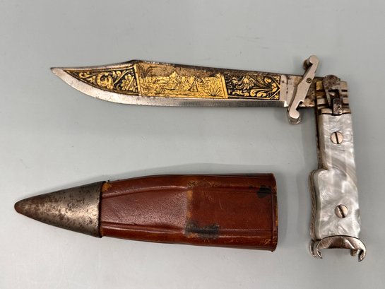 This vintage Toledo folding knife features a beautifully crafted mother of pearl handle with an intricately etched fox and hound scene. The blade has a gold wash finish with detailed hunting scene etching. Smooth opening and closing action with a functional lock button. Signed Toledo on the blade. Made in Spain.