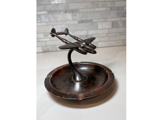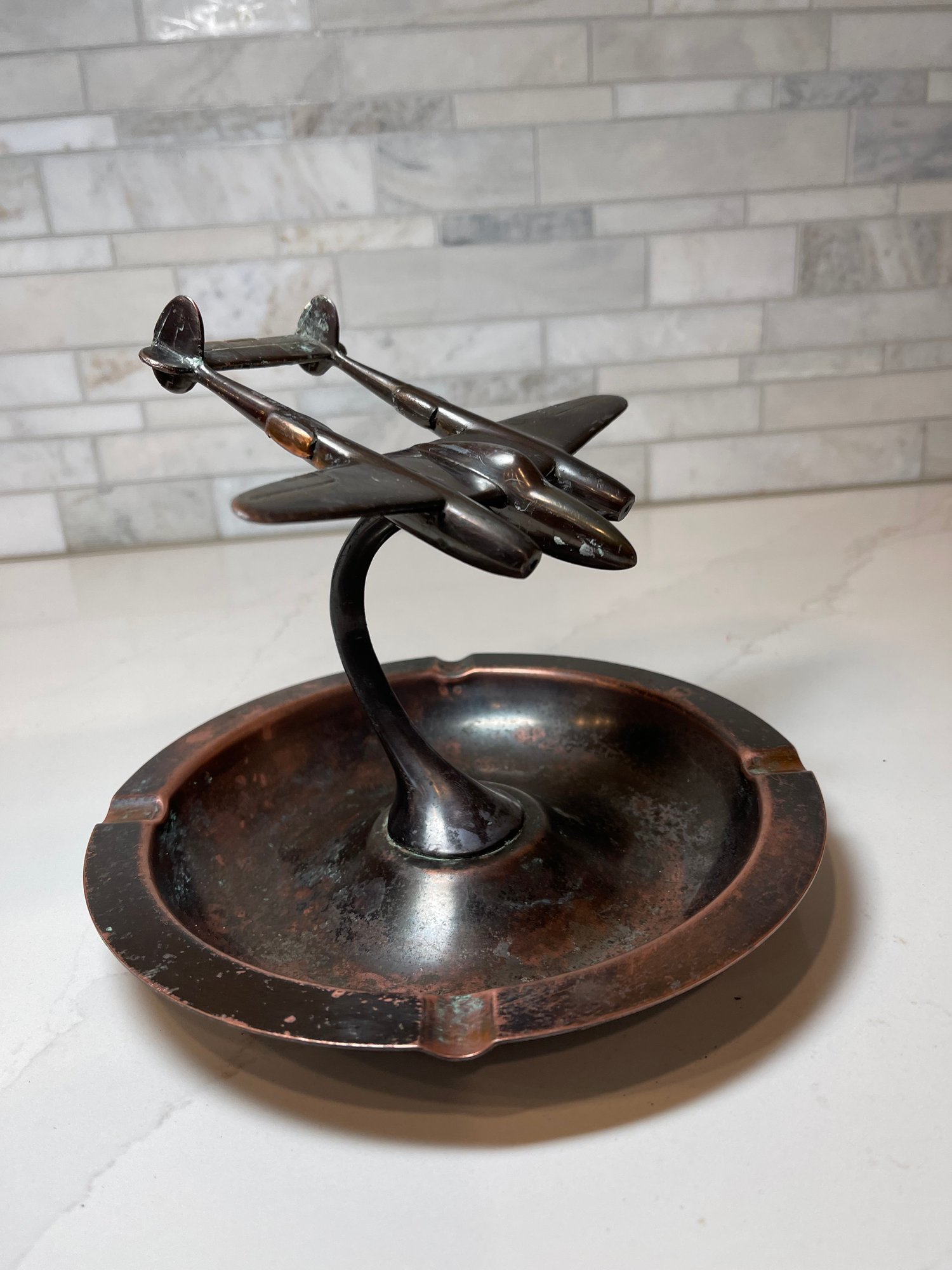 WWII Aviation Cigar Ashtray, WW II P- 38 plane on solid swooping base., Solid bronze And Copper Trench Art. 8.5 diameter, 7 high. Showing some tarnish, but should clean up with a bit of elbow grease!