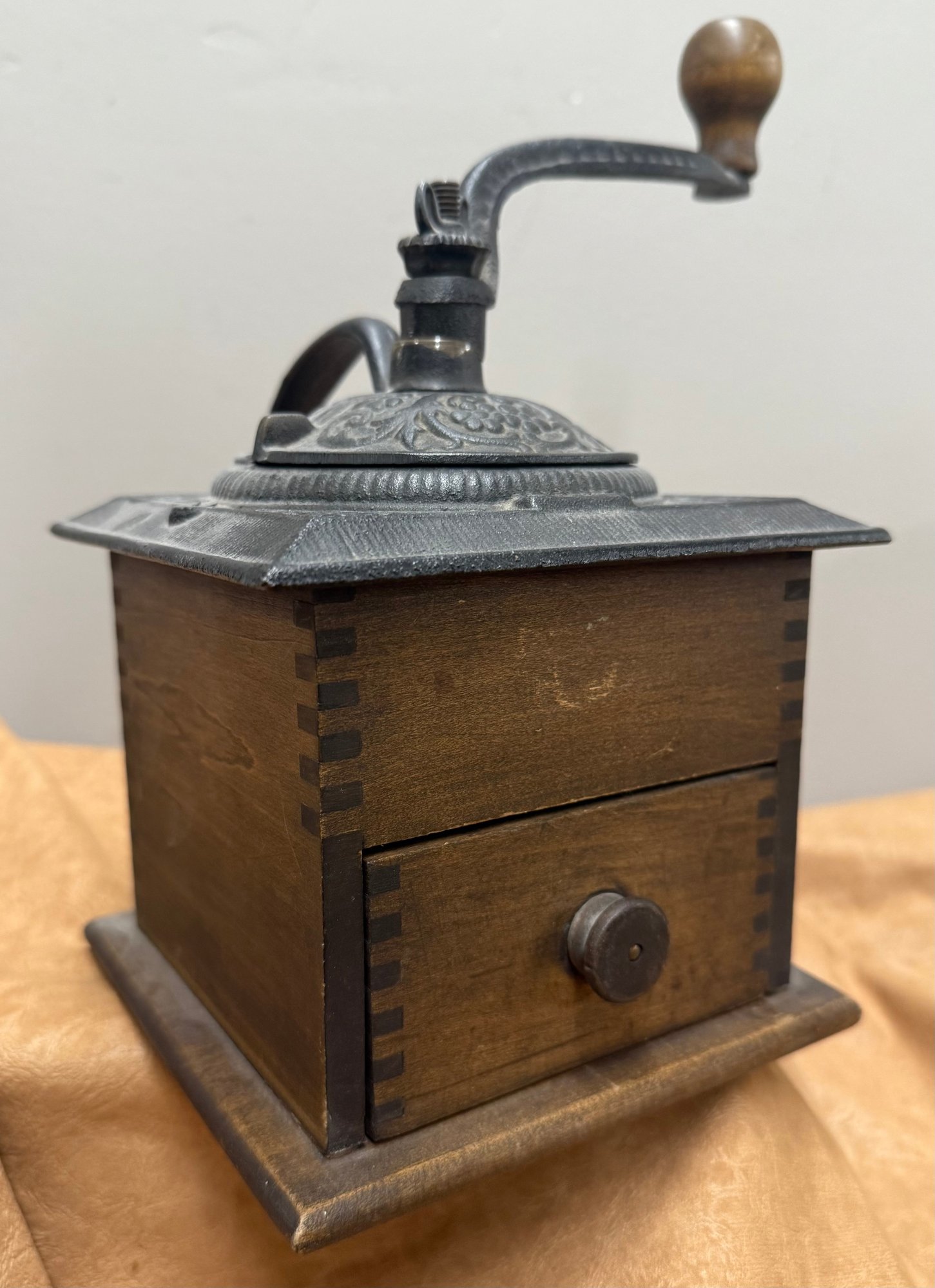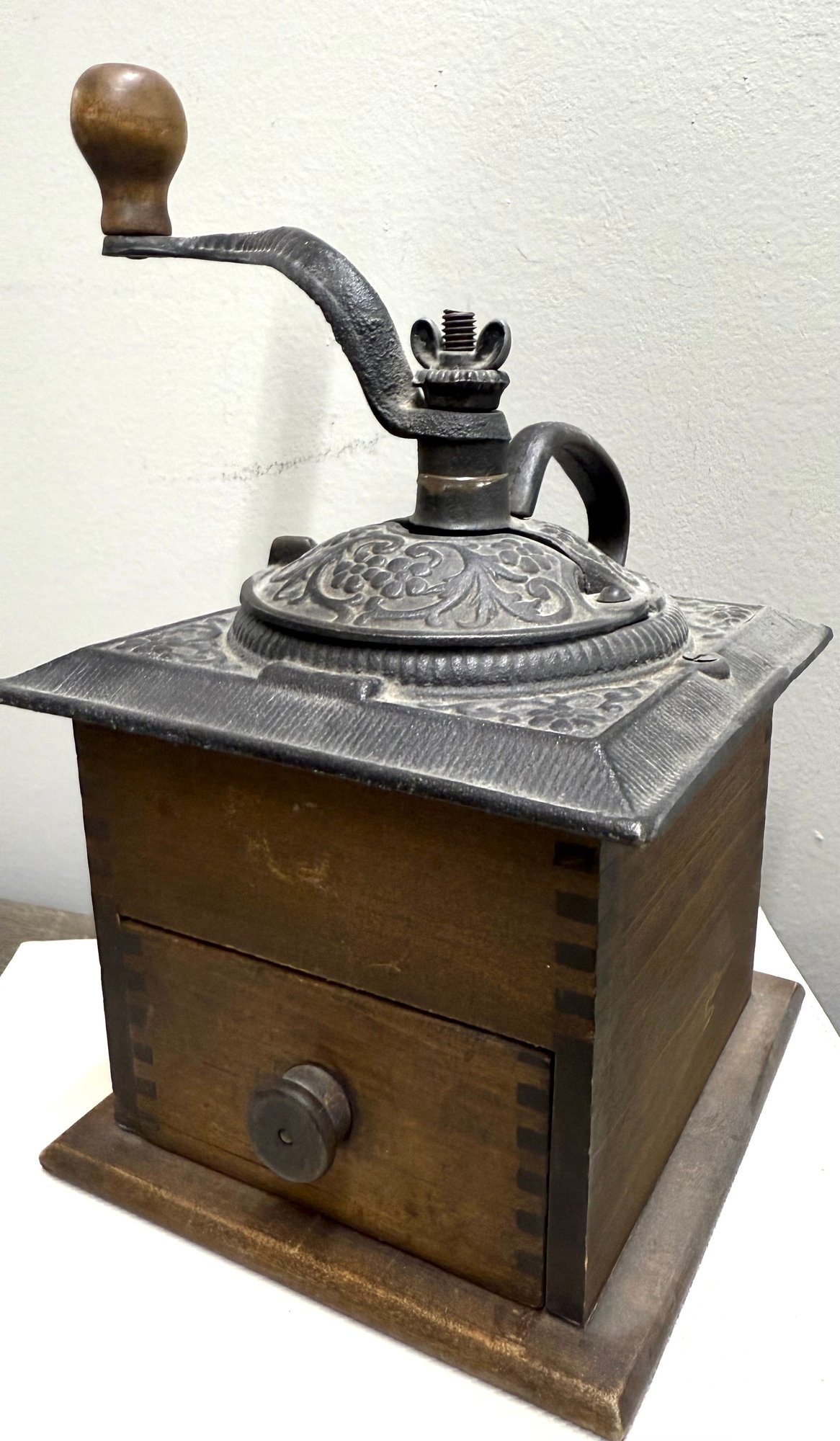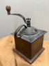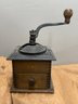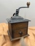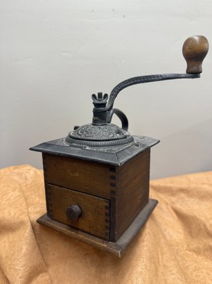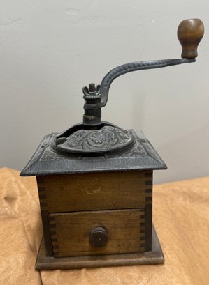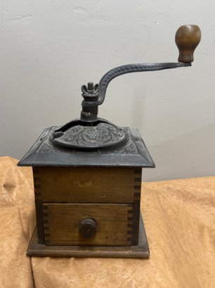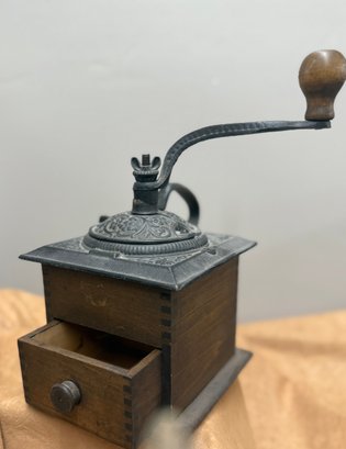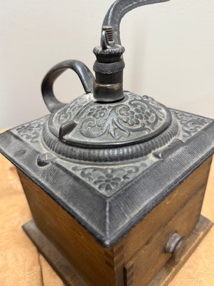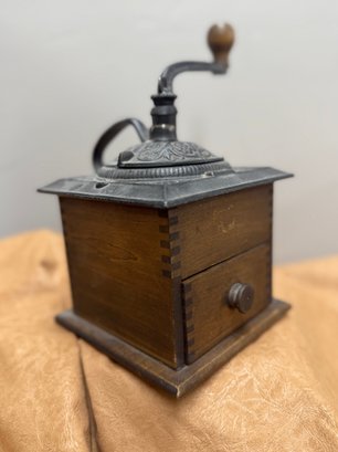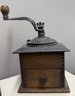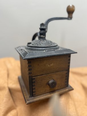 Antique Coffee Grinder, Cast Iron And Dovetailed Wood, One Drawer