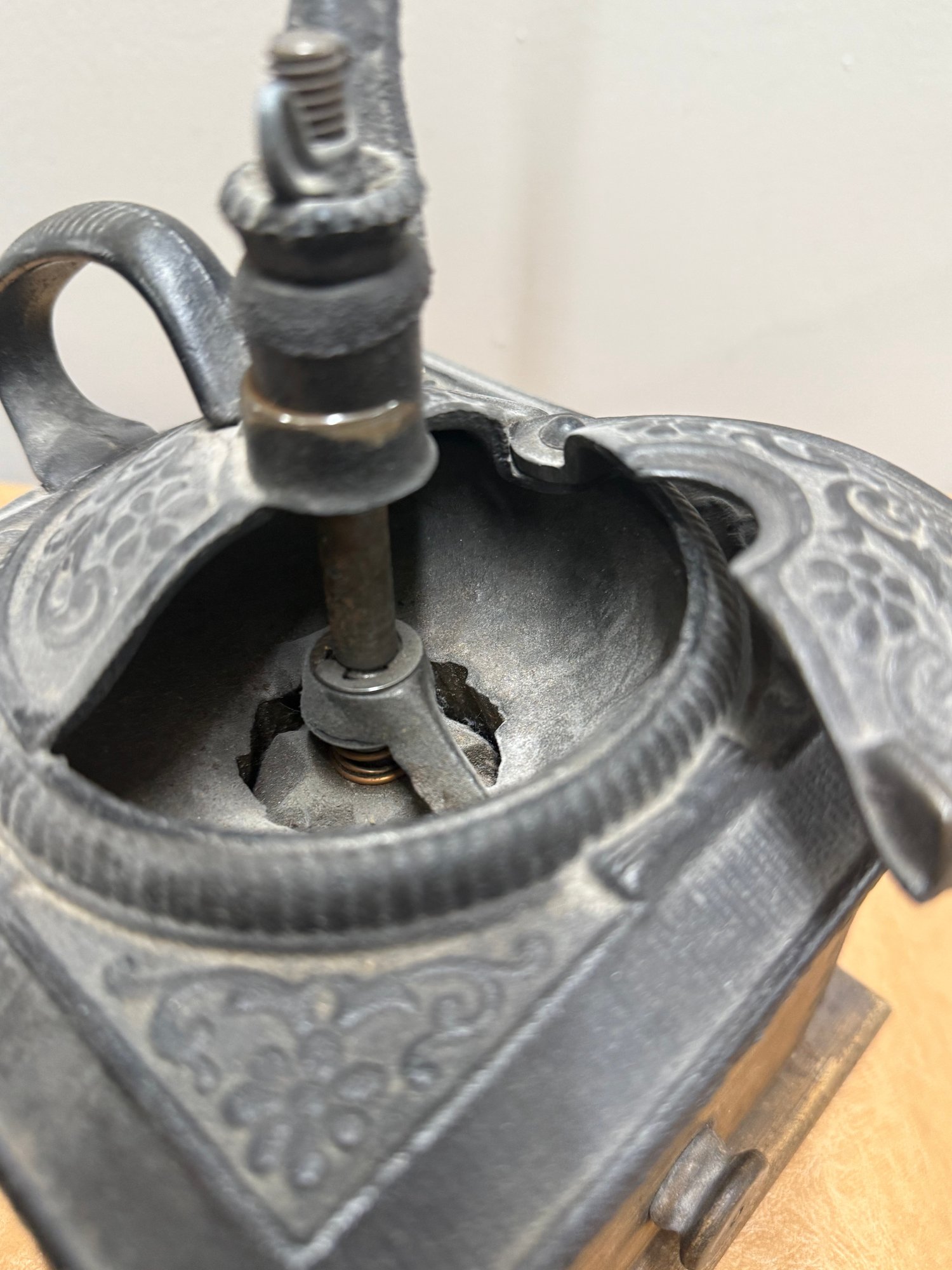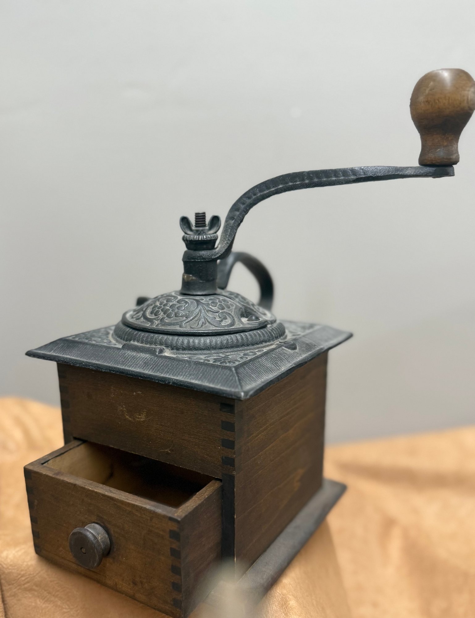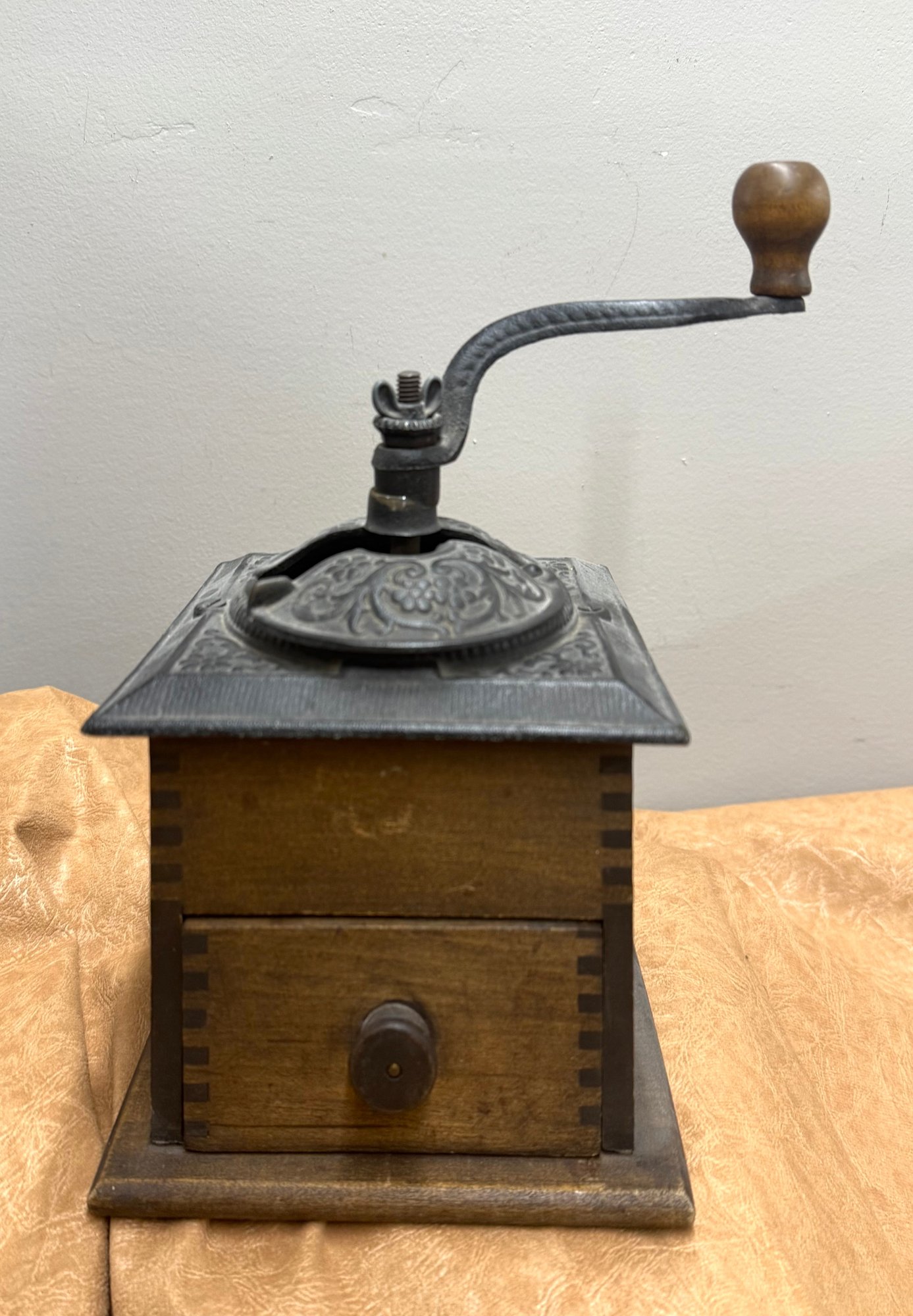 Antique Coffee Grinder, Cast Iron And Dovetailed Wood, One Drawer