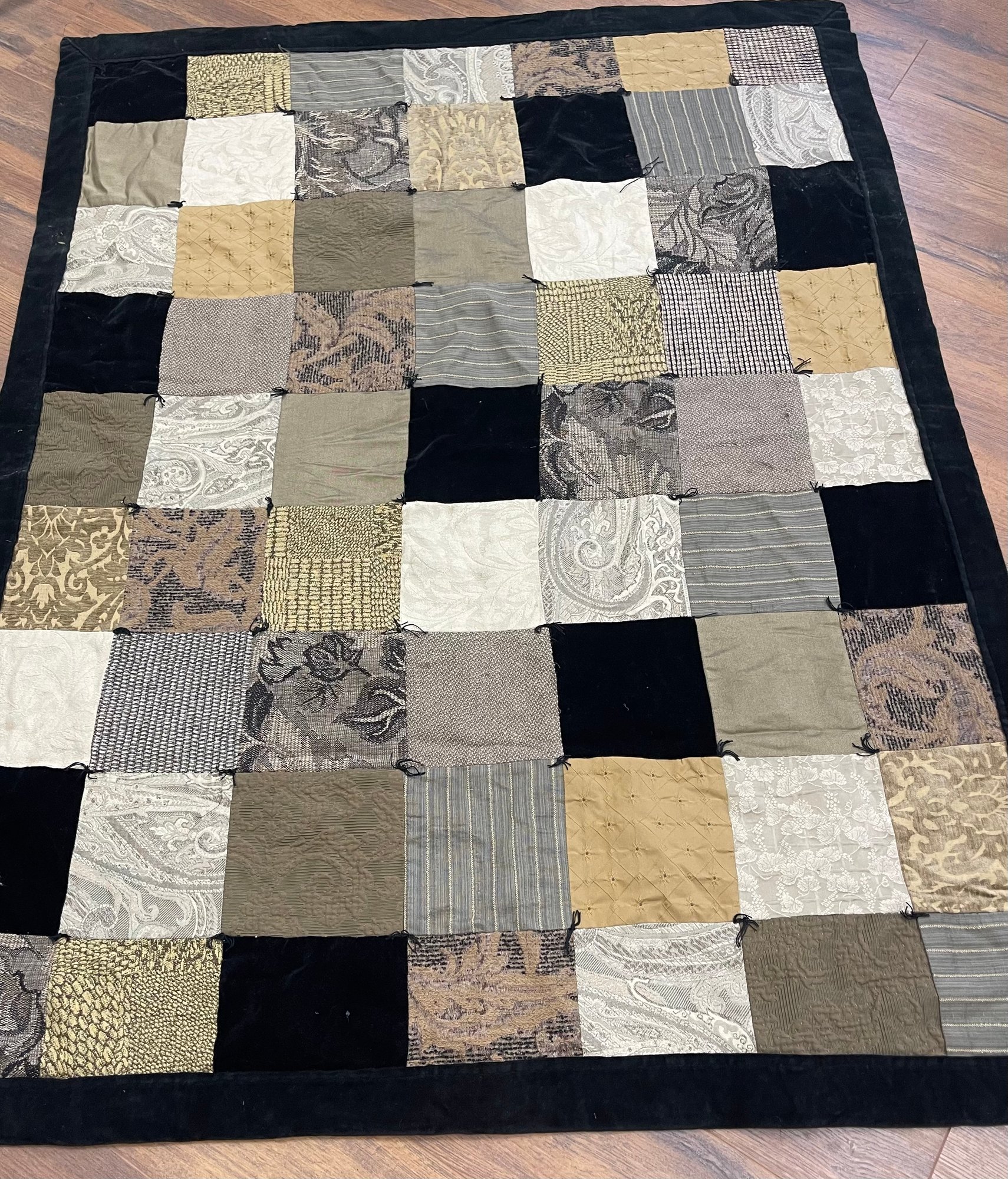 Patchwork Quilt W/ High End Upholstery Fabrics. Backed and bordered with a black velvet. Lovely. approximately 50 x 65.