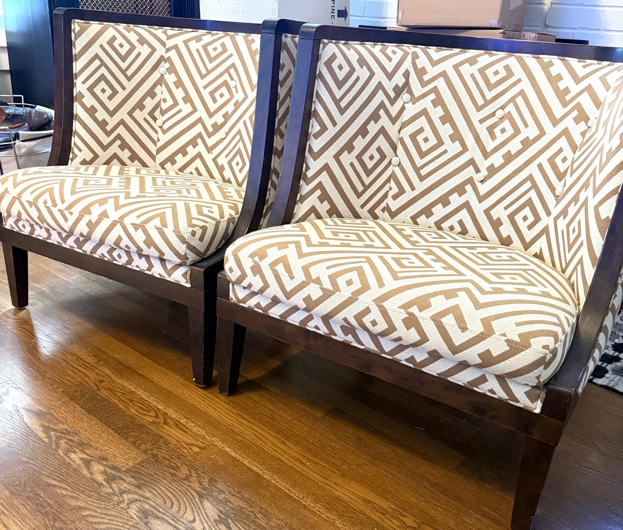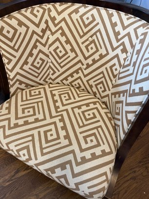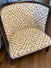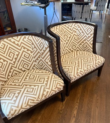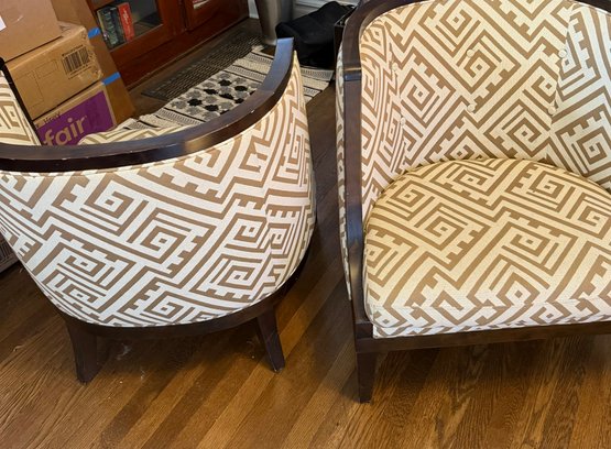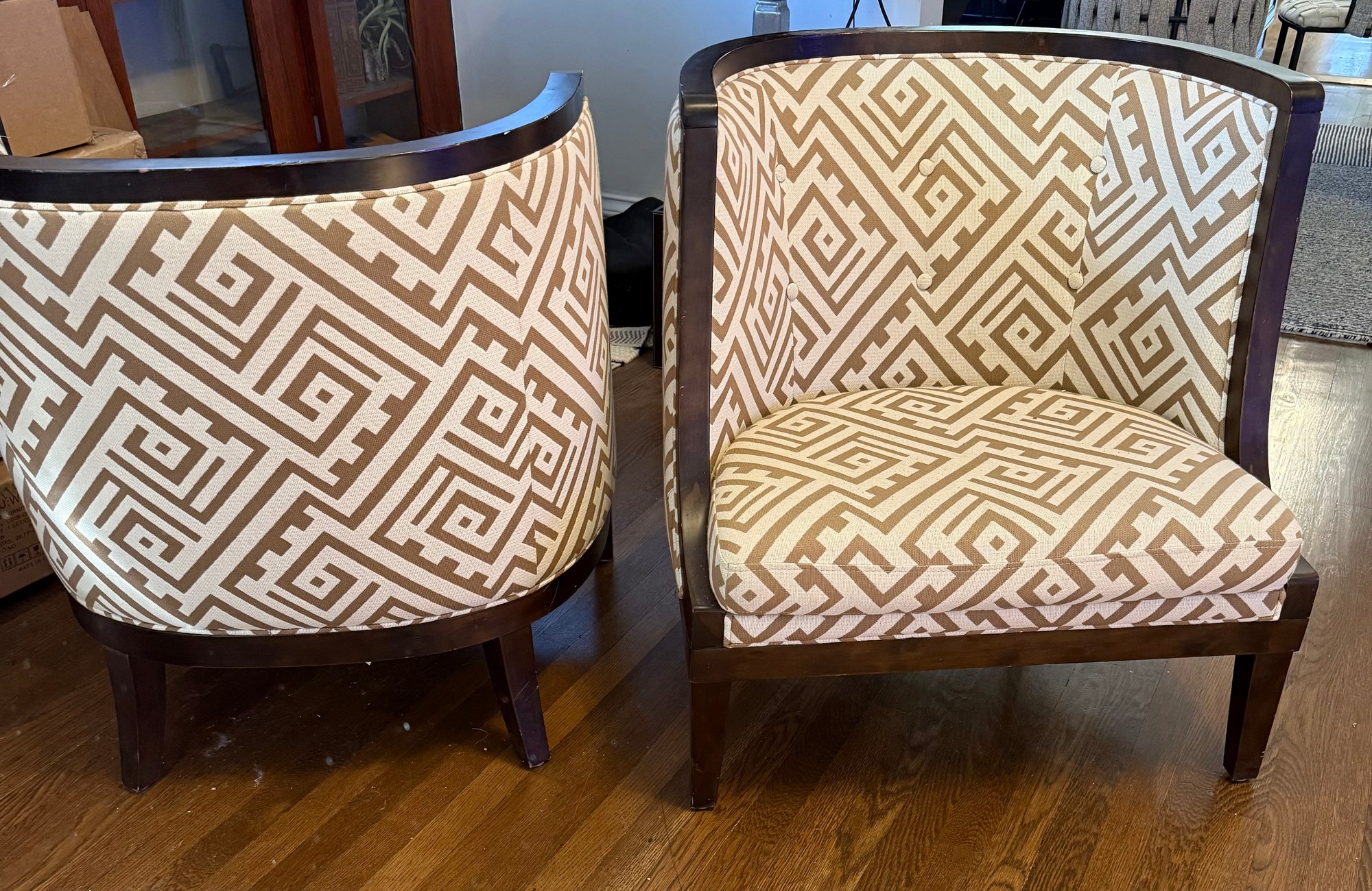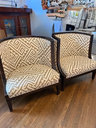 Barrel Chairs, A Pair! Excellent Used Condition, Stylish w/ Geometric Pattern, Dk Wood Perimeter Ain Bold geometric pattern with button tufted seat back. Well built. 27 x 27 x 32H at top of back.