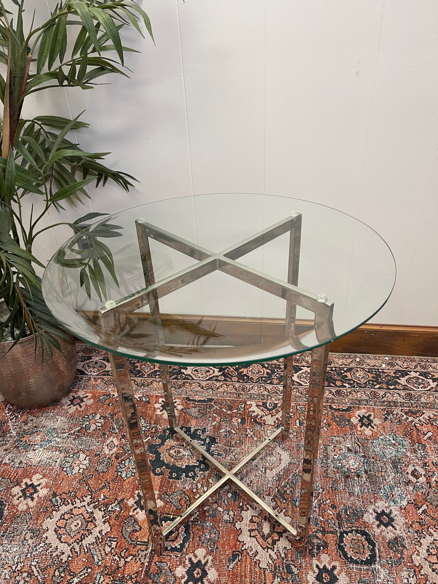 Beveled Glass Side Table With Chrome Base. In excellent condition. H 22.5" x D 19".