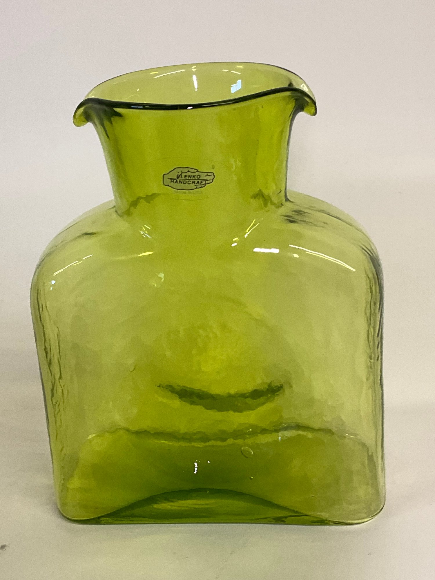 Very nice pitcher or vase from Blenko art glass. (Green pitcher only, three pieces shown for sizing)