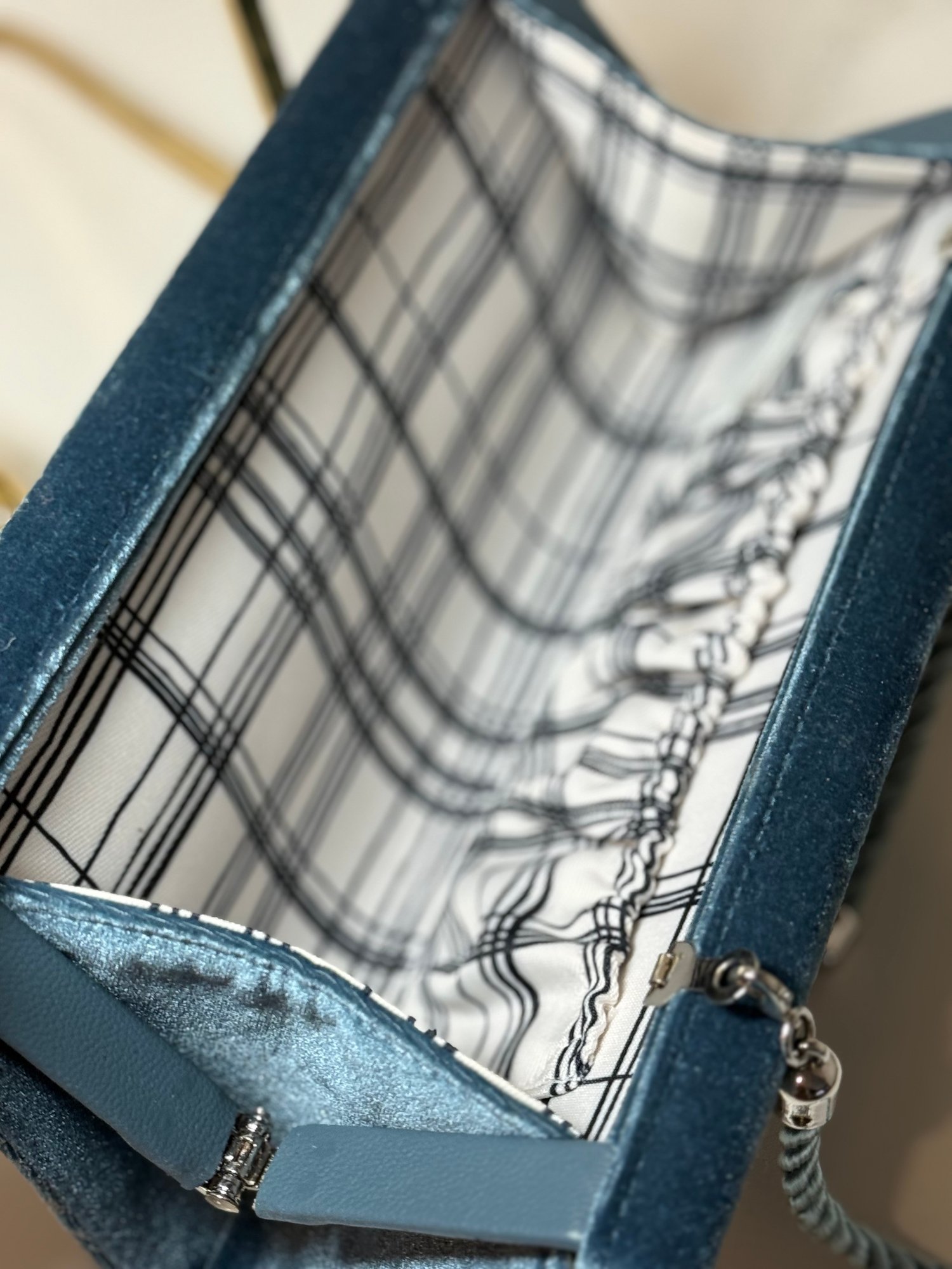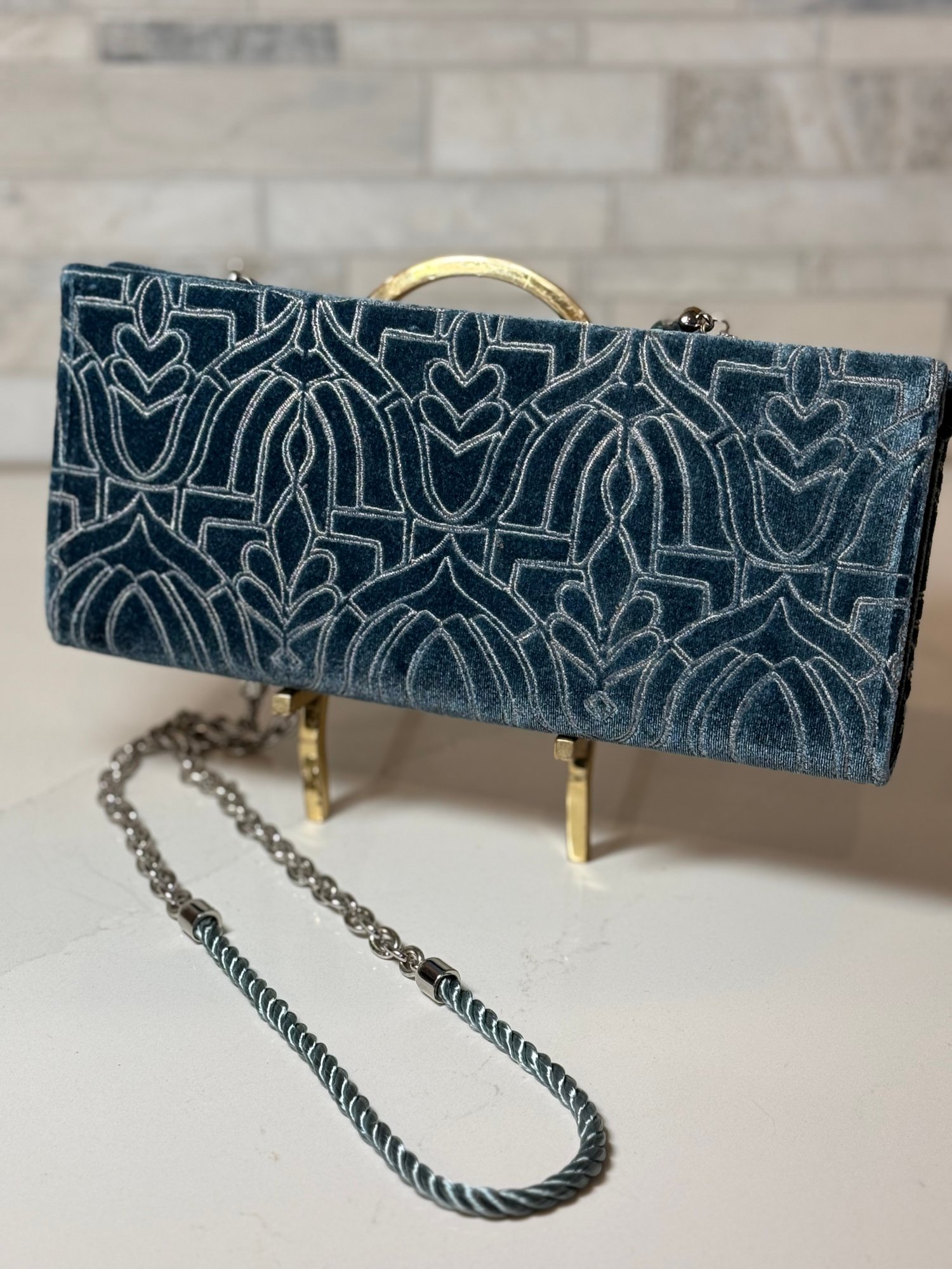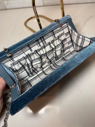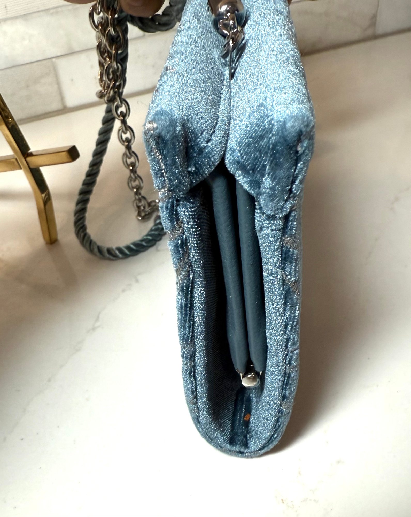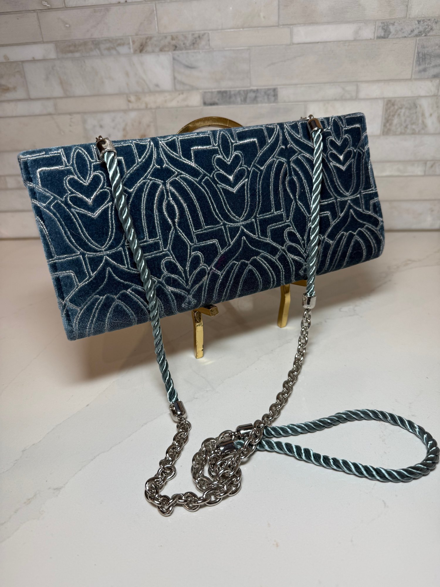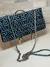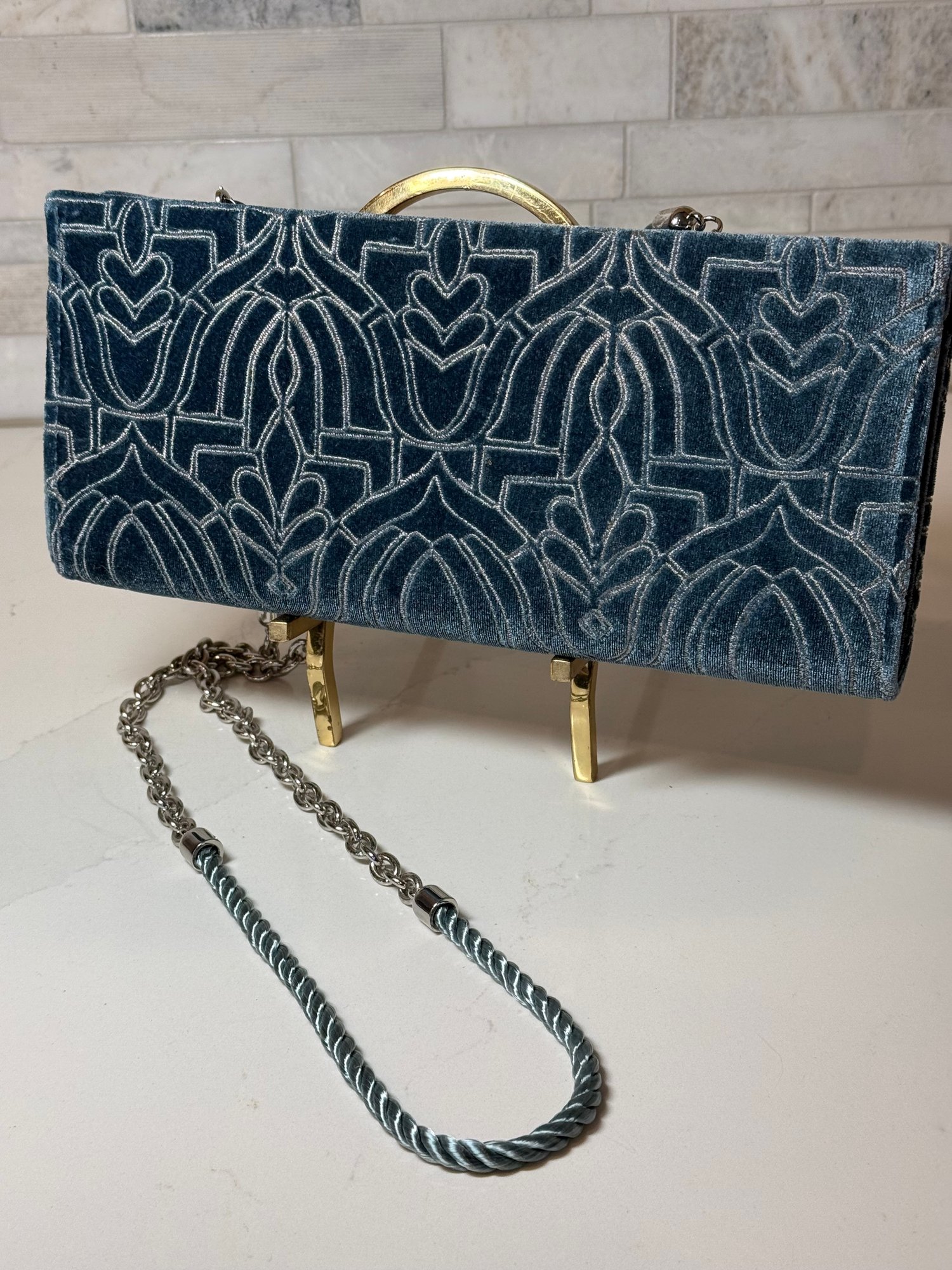 Blue Velvet Embroidered Purse With Chain And Corded Strap. Magnetic closure inside pocket. 10.5 X 5