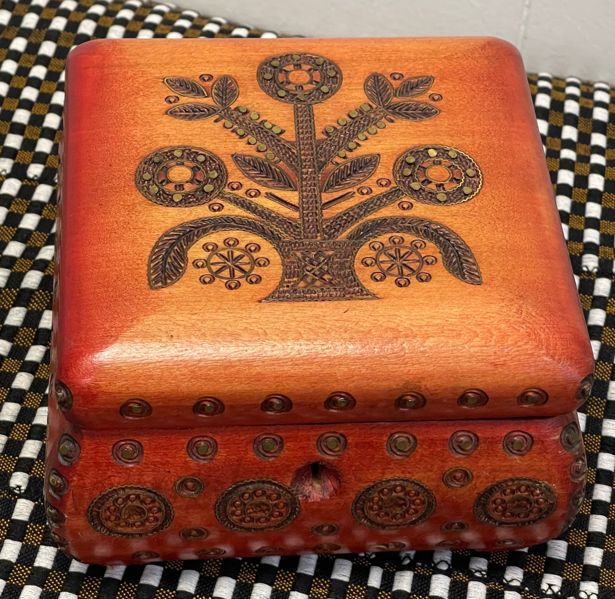 Ornately Carved And Embellished Box With Inlaid Brass And Hinged Lid. 5.5 x 5.5 x 3.5