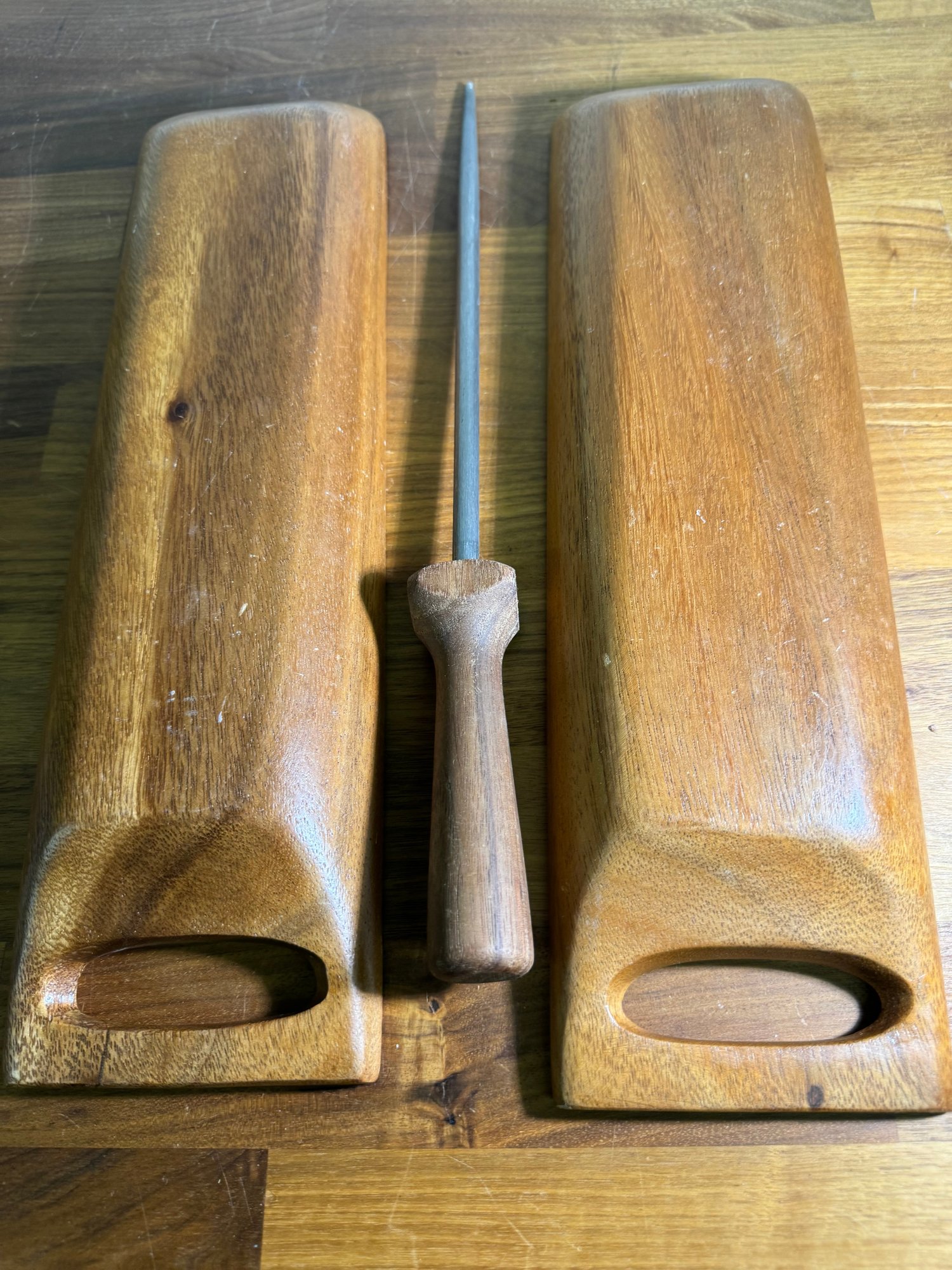 Nice Pair Of Carved Wooden Trays And A Nice Knife Sharpener