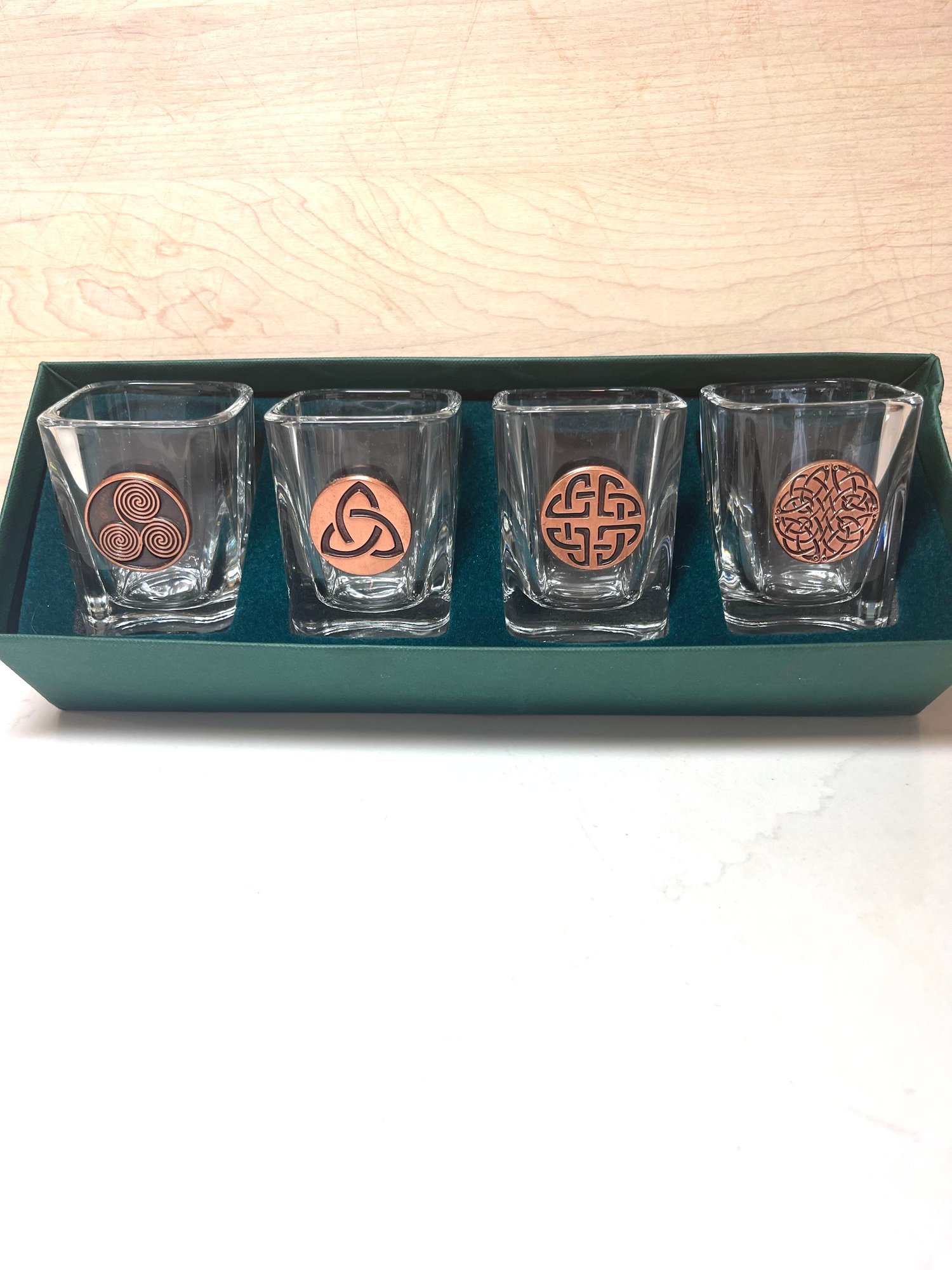 Celtic Shot Glasses. Weighted Square W/ Copper Celtic Symbol, The Robert Emmet Co.