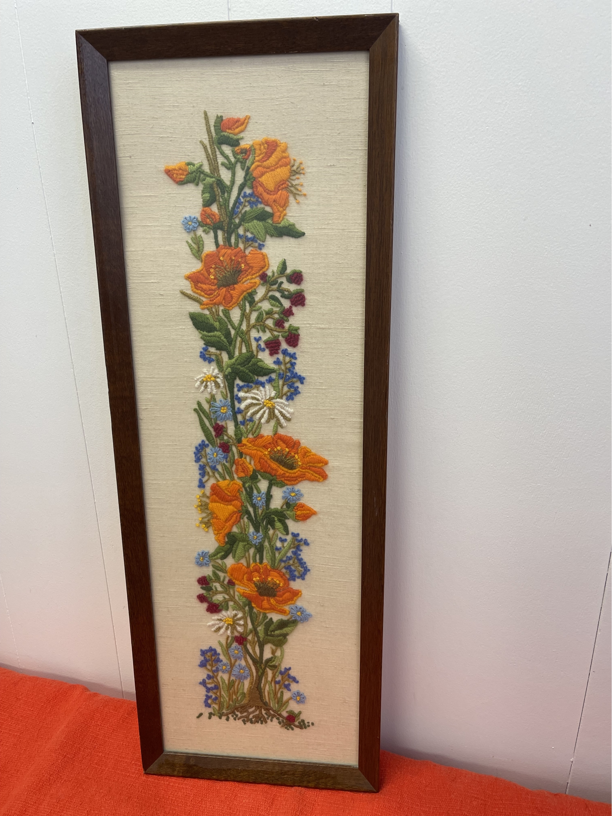 Nicely Framed Crewel Embroidery, Bright Colors, Expertly Stitched. 11.5 X 32.5