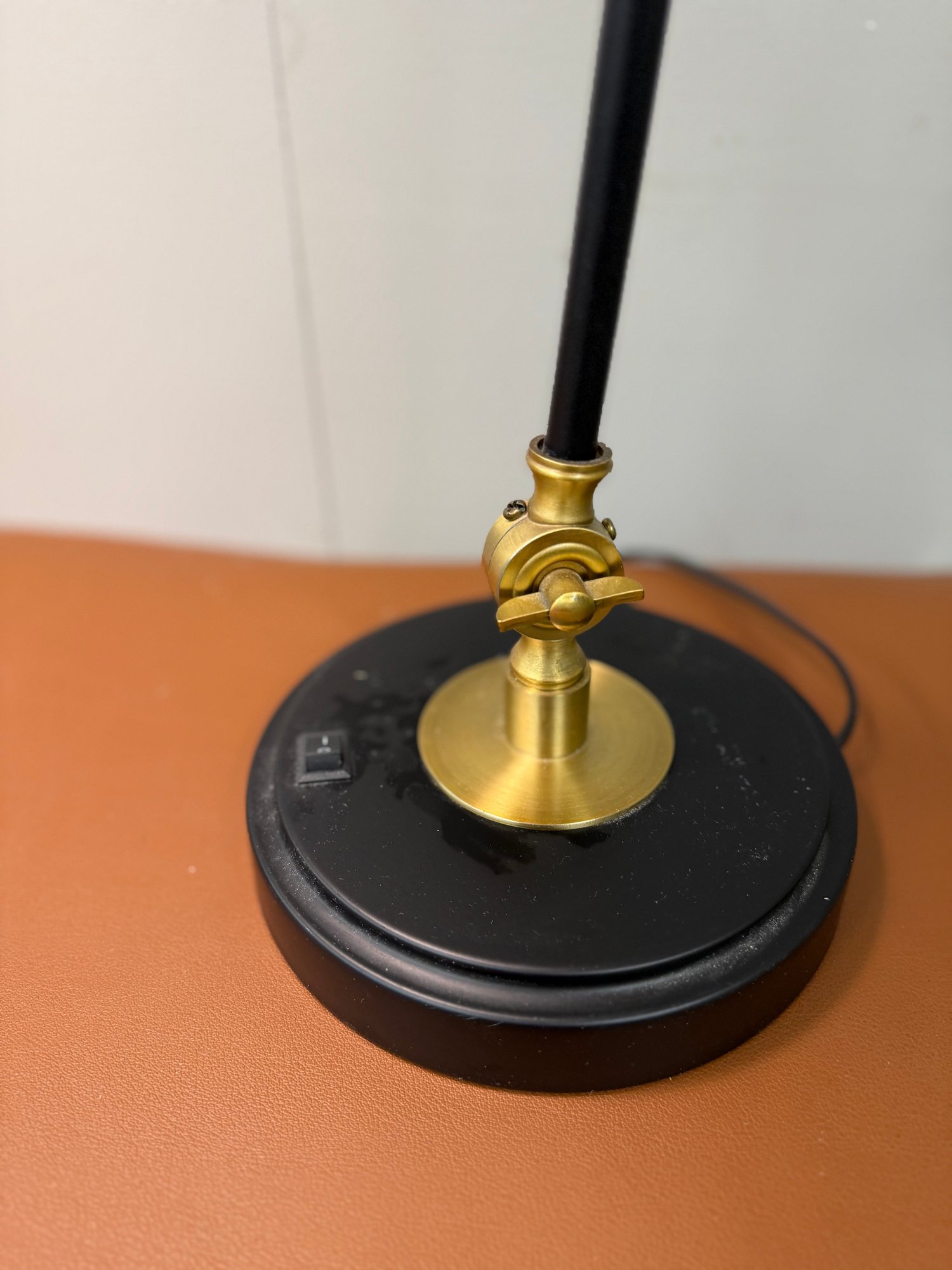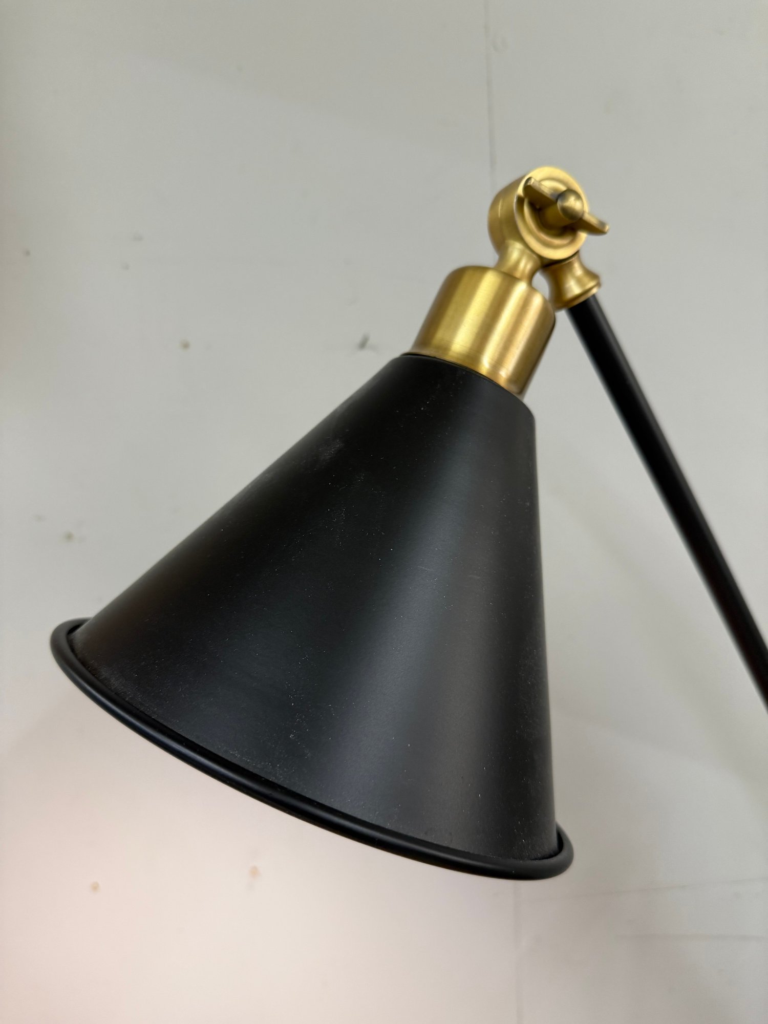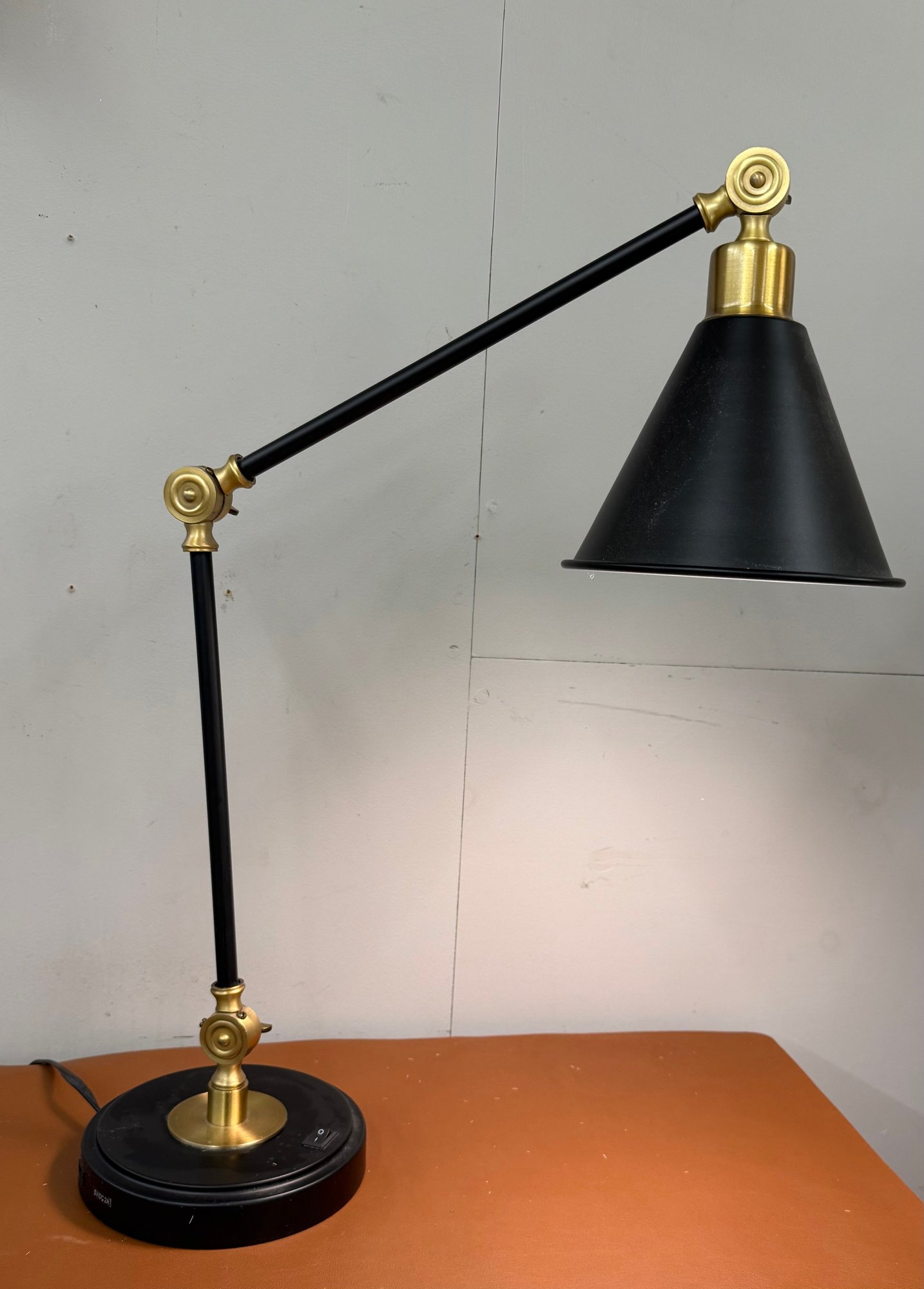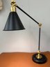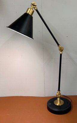 Classic Black And Gold Adjustable Lamp. Great for nightstand, side table or desk. Joints are secure, base is weighty- nice transitional lamp.Cone shaped shade.