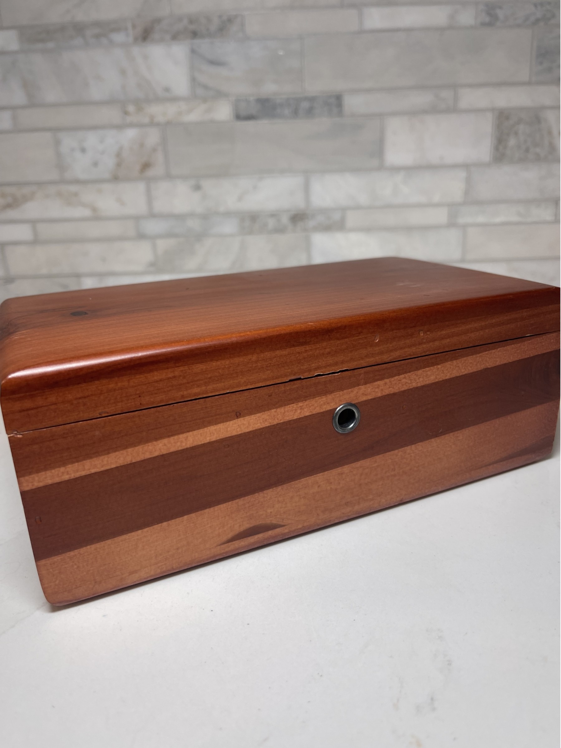 In great condition, 9 x 4.5 x 4 high. Marked on inside lid-