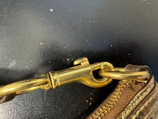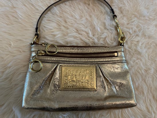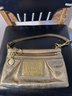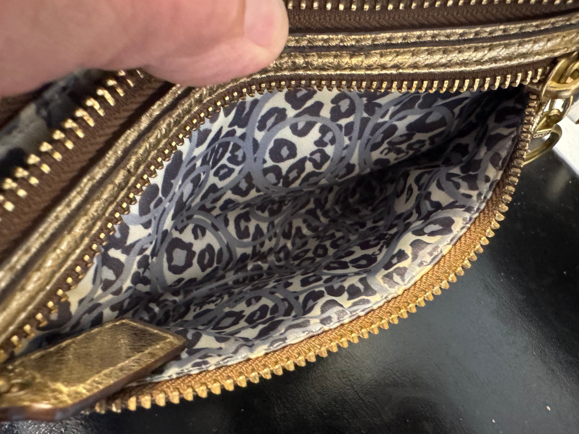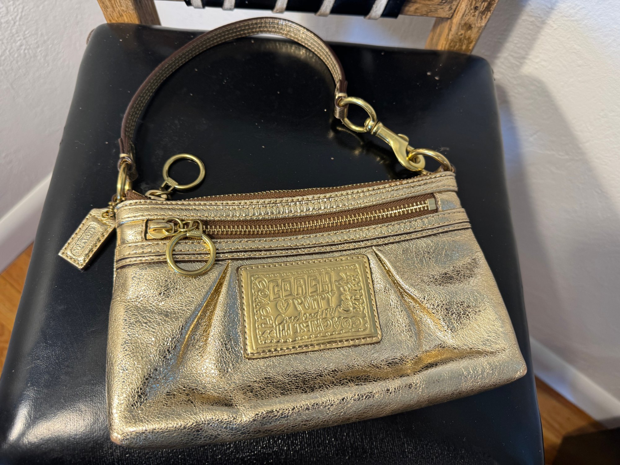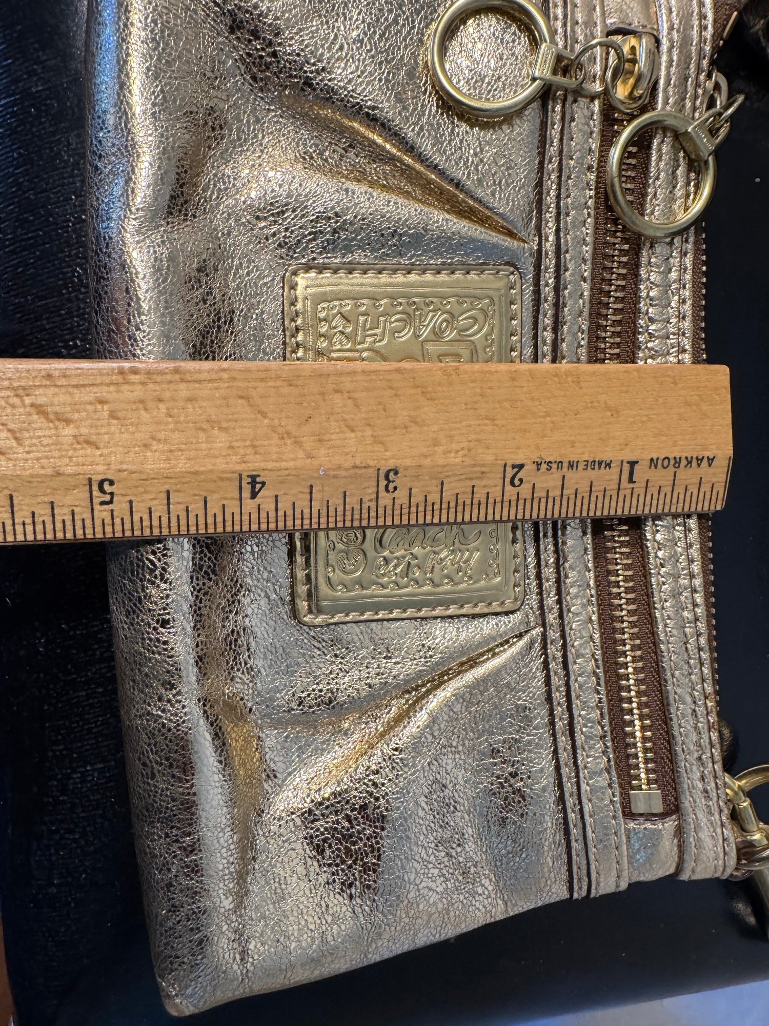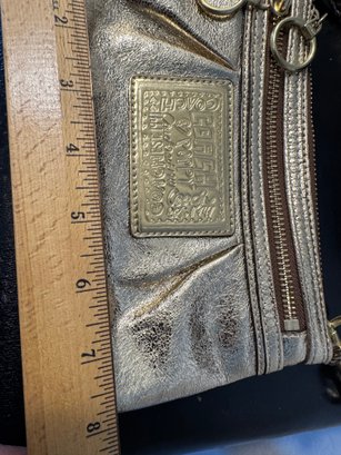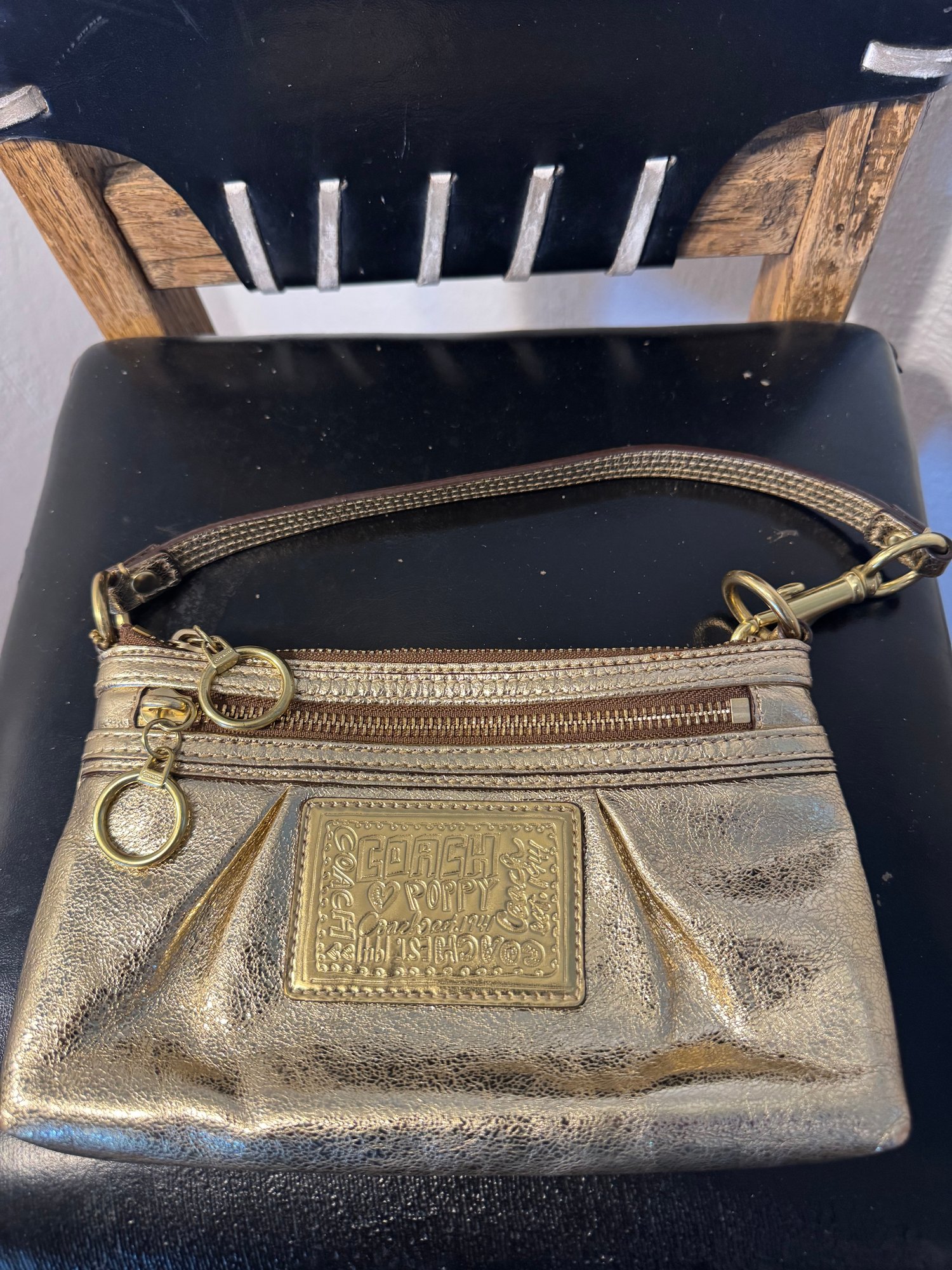 This golden little Coach has the classic brassy clip on the wristlet strap and can loop the wrist or get really festive as a belt bag. Versatile and lovely. See pictures for condition and sizing. Has original hang tag and fun lining.