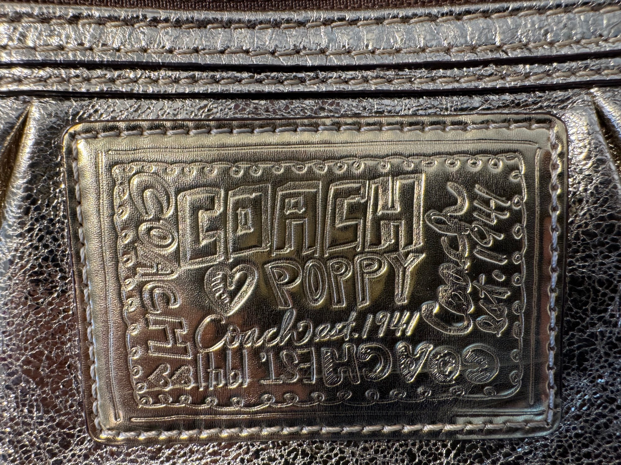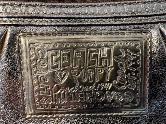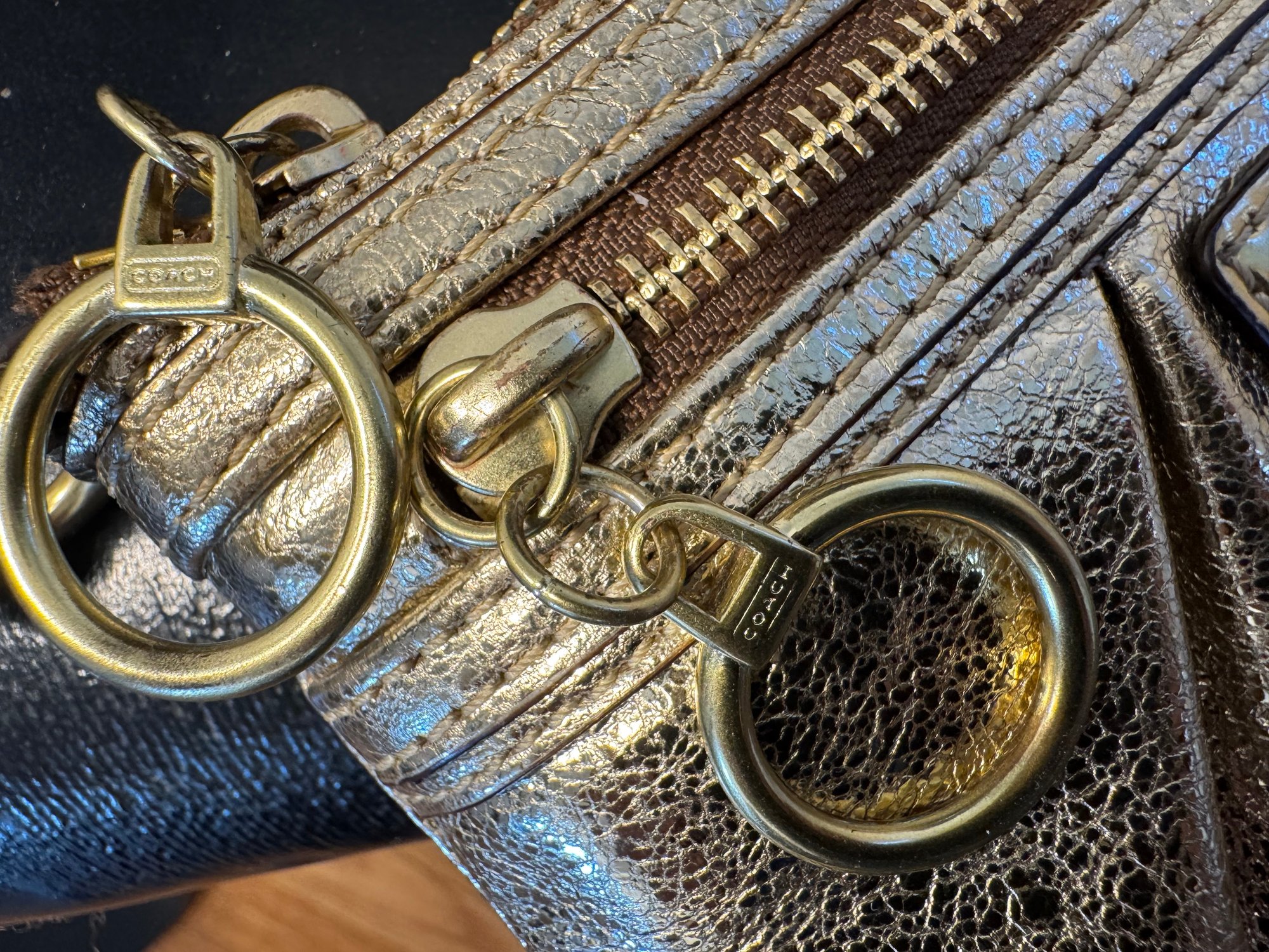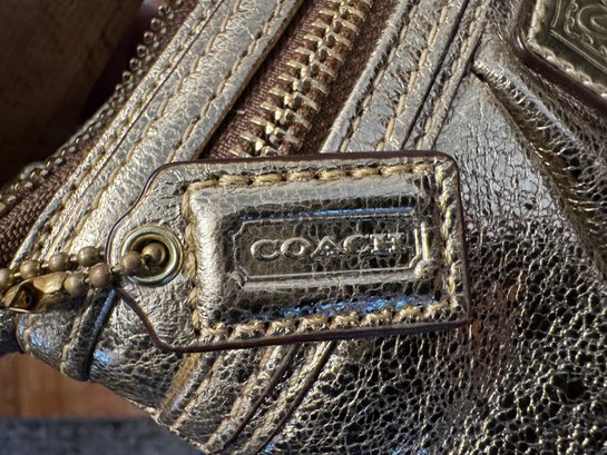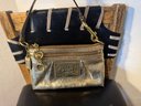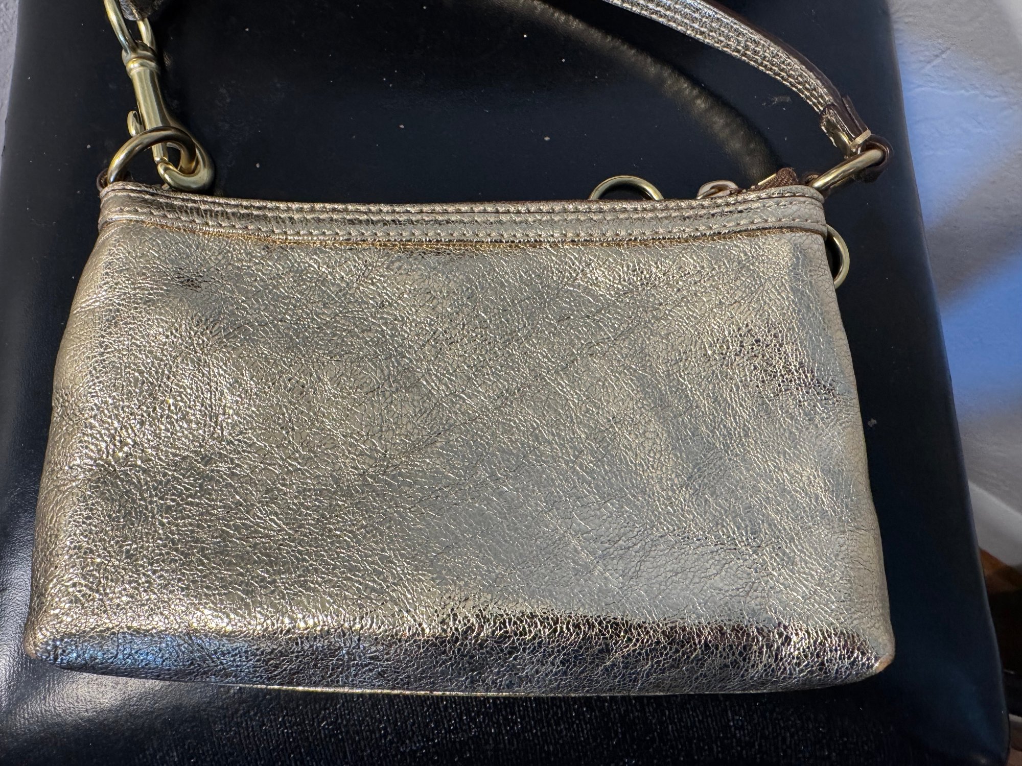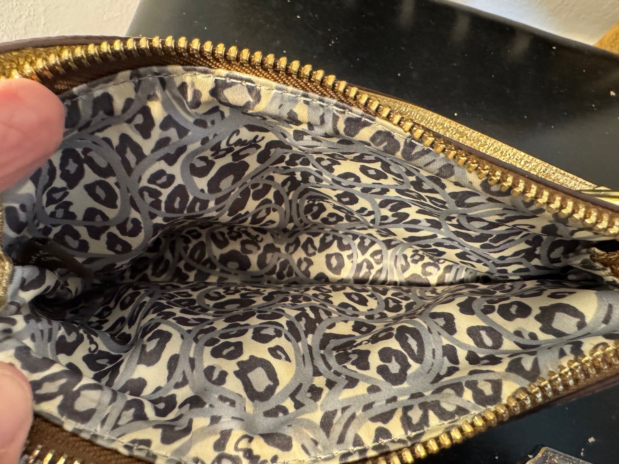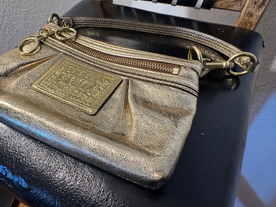 This golden little Coach has the classic brassy clip on the wristlet strap and can loop the wrist or get really festive as a belt bag. Versatile and lovely. See pictures for condition and sizing. Has original hang tag and fun lining.