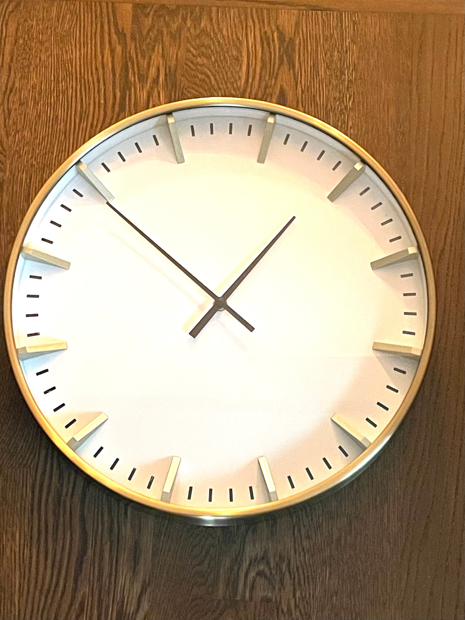 Contemporary Gold And White Wall Clock, Lg- 20 Diameter X 2 Depth. Battery operated, AA. gold frame with glass front- looks brand new