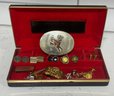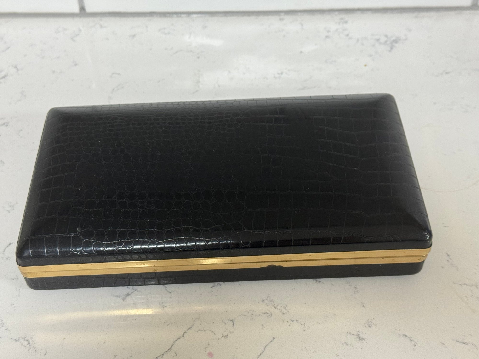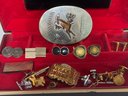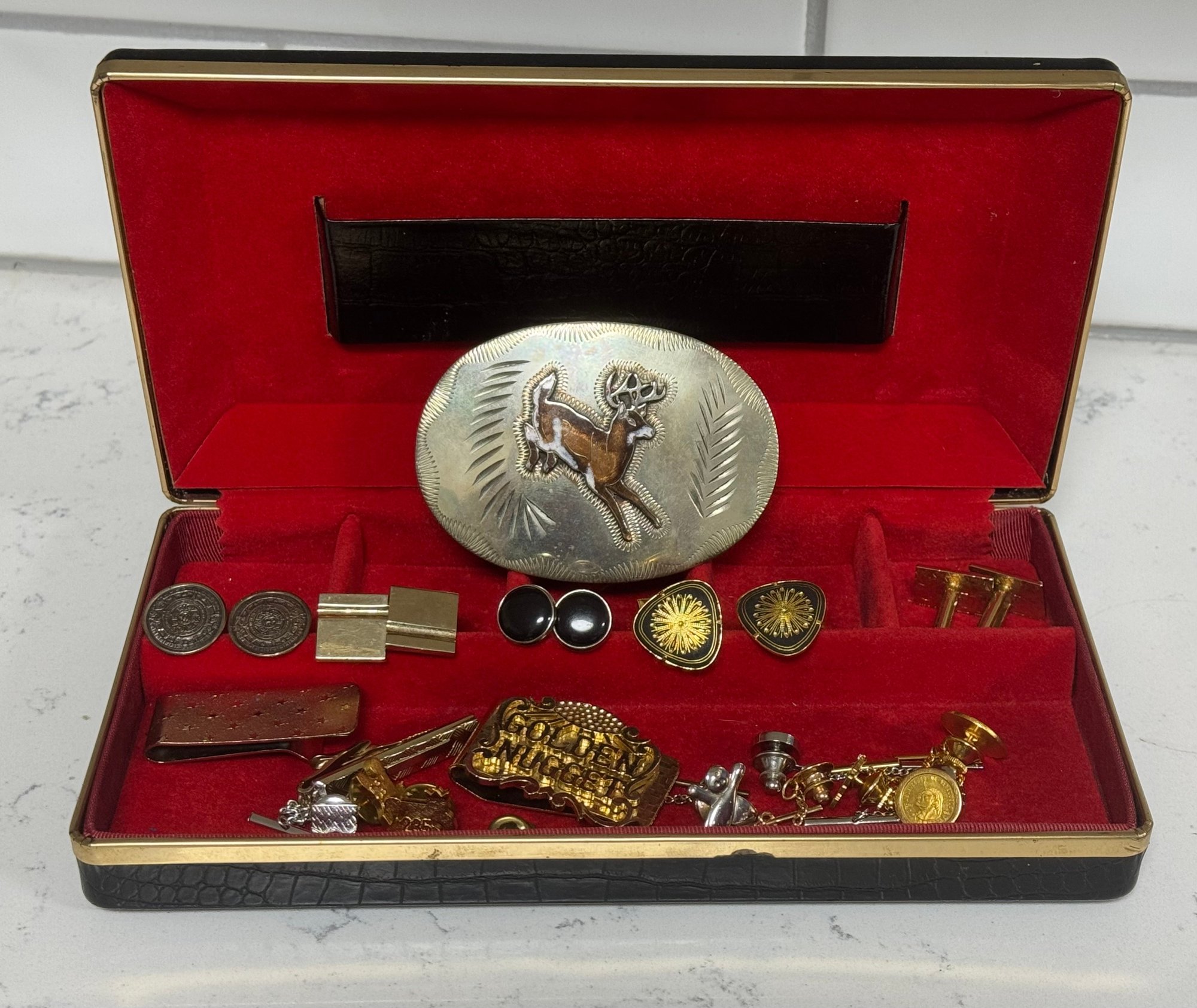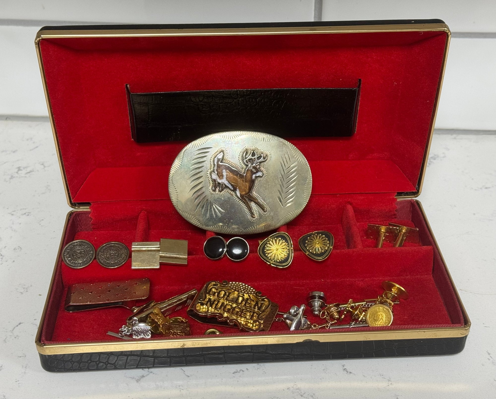 Vintage textured case with belt, buckle, cufflinks, etc.