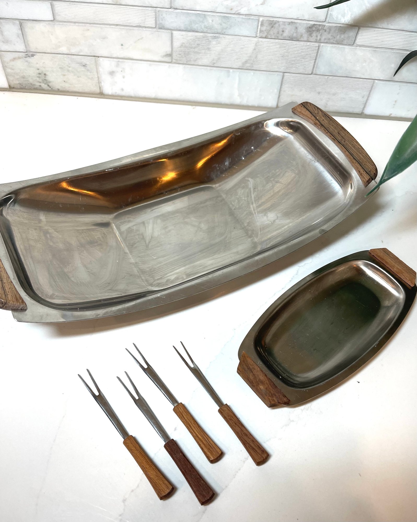 Danish (Selandia) Serving Dishes Teak/Walnut And Stainless Steel . Rectangle Boat bowl is marked Selandia, 13 x 6.5. small dish is 3.5 x 7. 4 teak handled cocktail forks included!