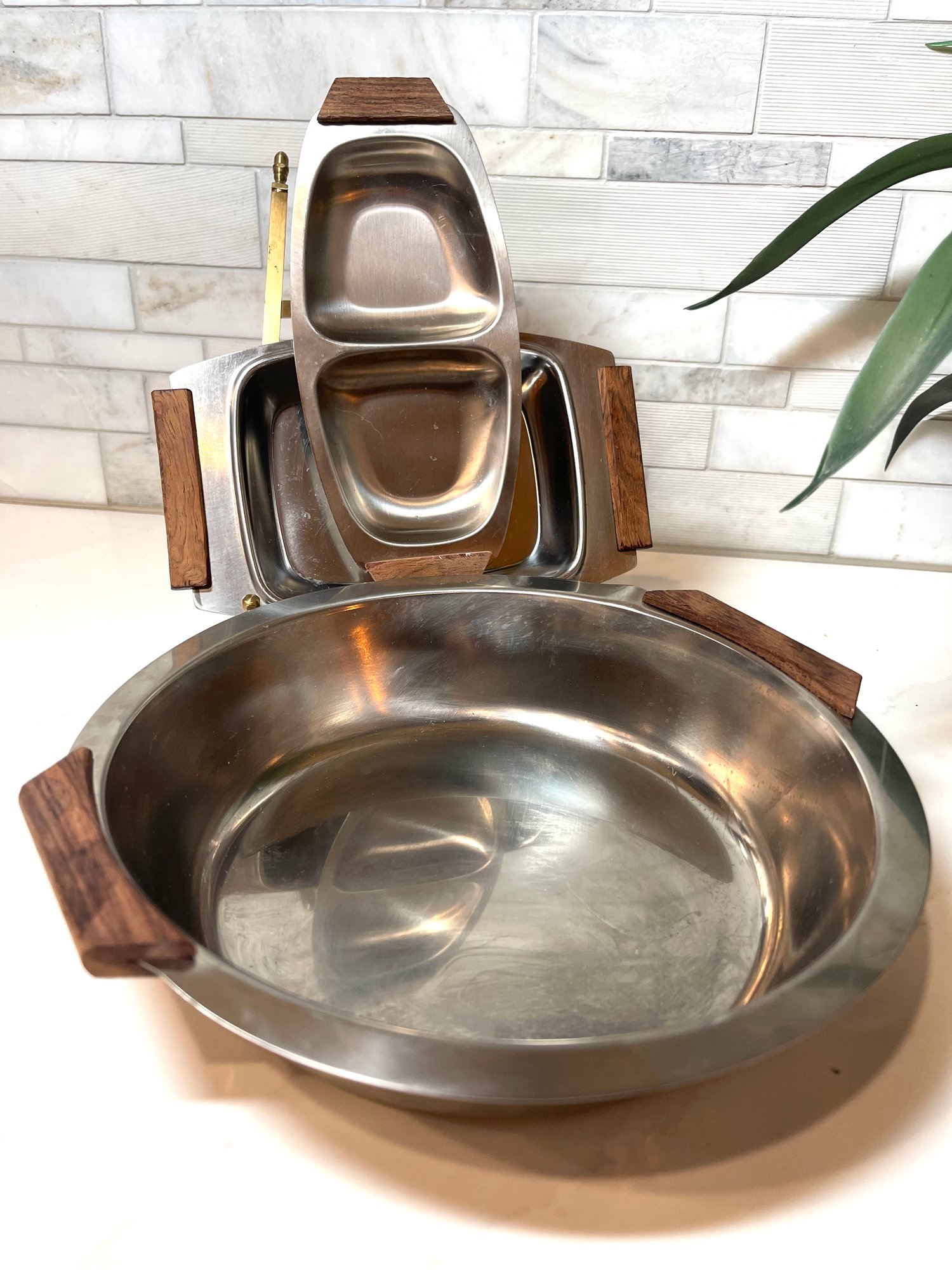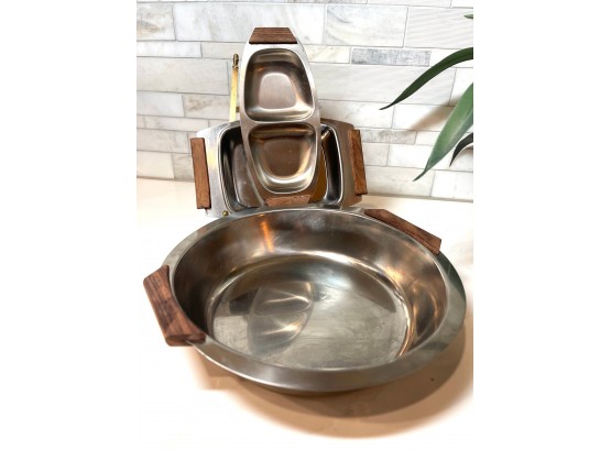 Mid century modern: Danish Serving Dishes Teak/Walnut And Stainless Steel Set Of Three. Bowl is 9 diameter single tray is 7 x 4.5 and divided tray is 7 x 3.25. Great function and style!