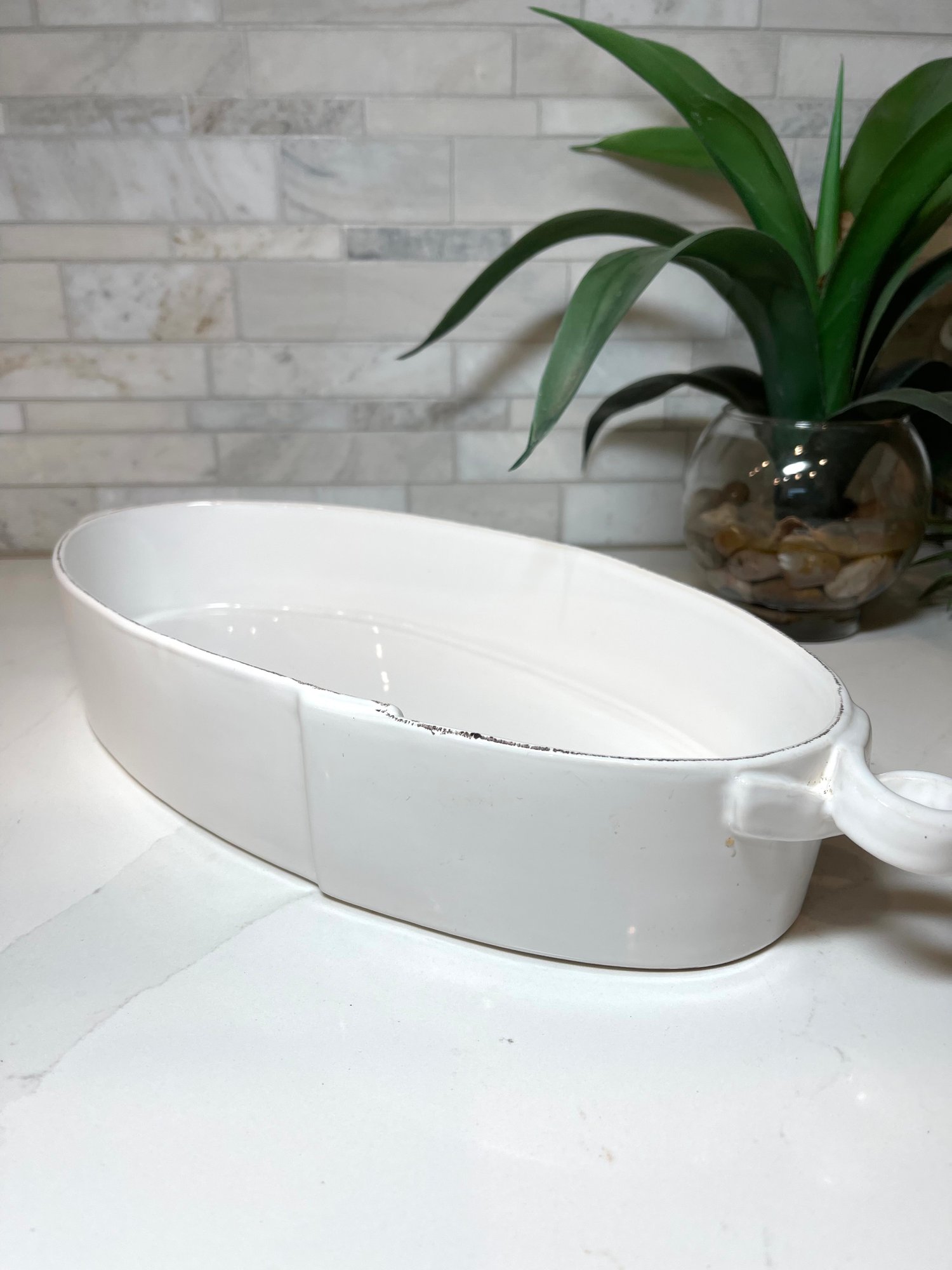 Elegant Vietri Lasra Oval 2- handled Baking dish. Hand crafted in Tuscany from Italian stoneware. Unique narrow oval shape, 17 x 7 x 2.5. Effortless style and function. Looks new w/ stoneware care sticker on bottom.