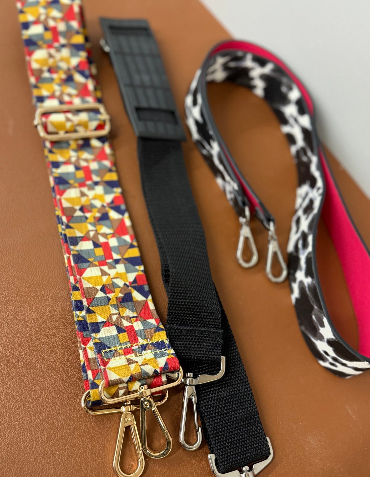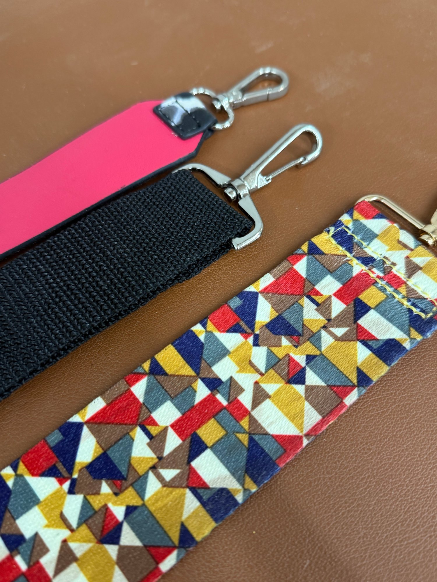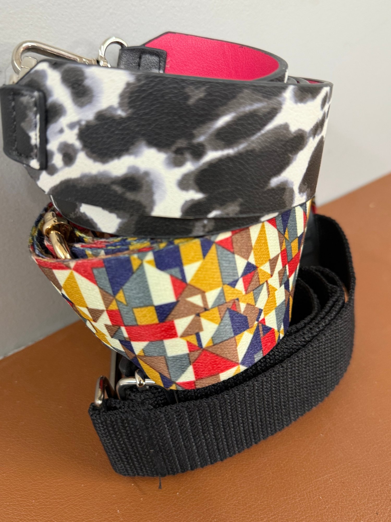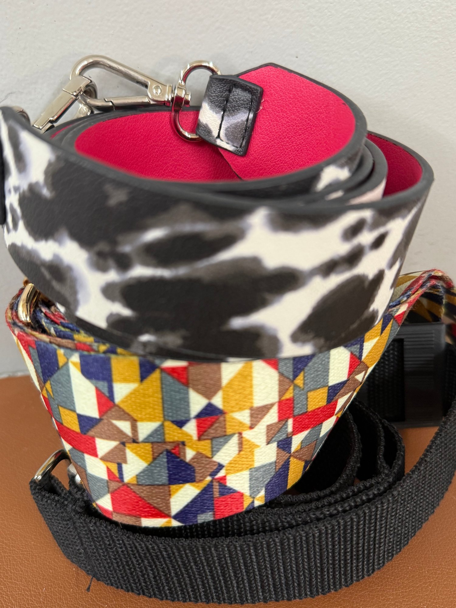 Fabulous Cross Body Purse Straps, Set Of Three, Look Brand New. Bold geometric, Blk and white reversible with pink, and basic Black. Great wardrobe addition.