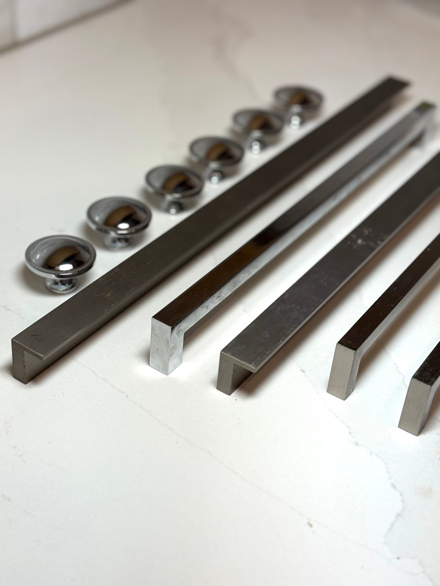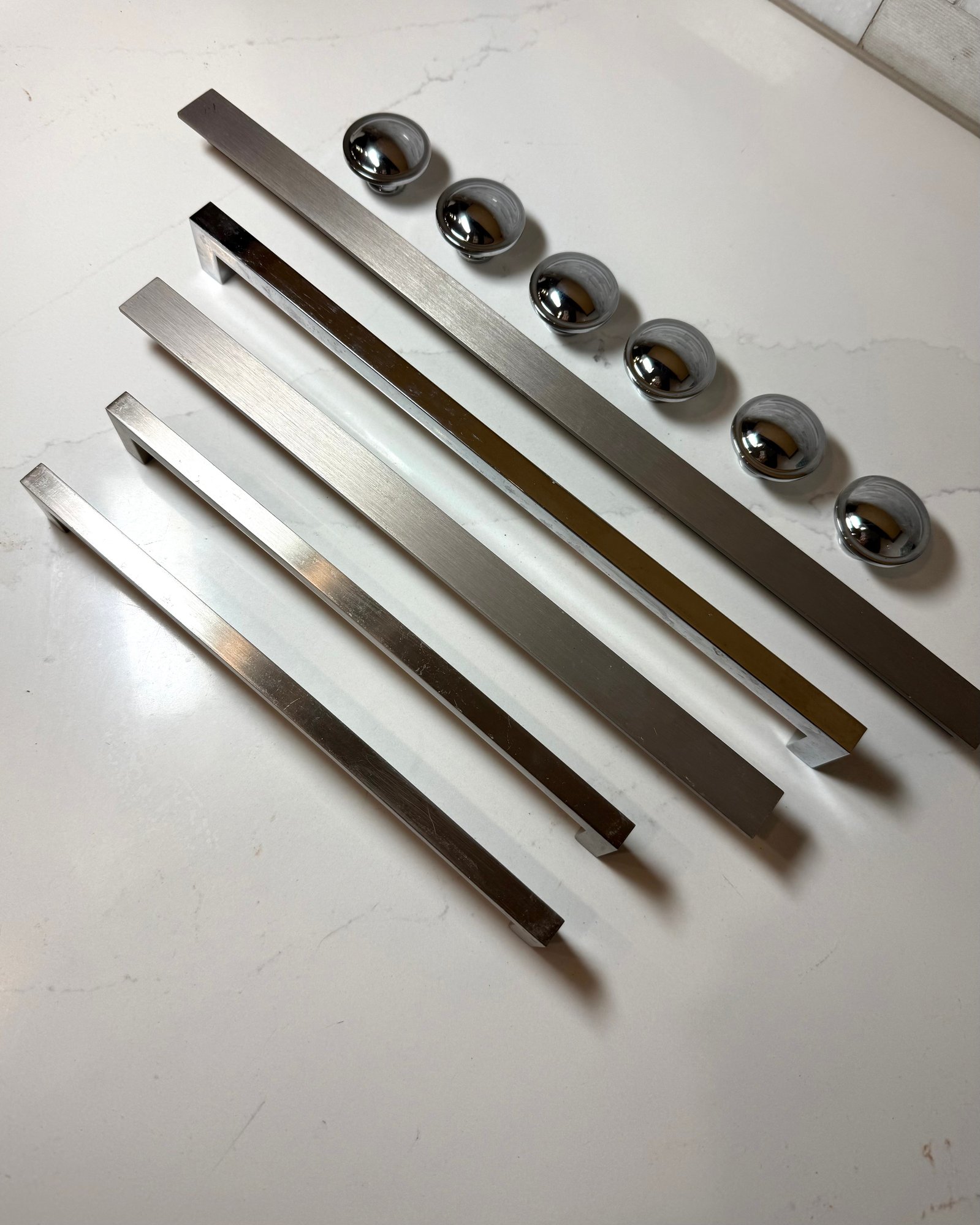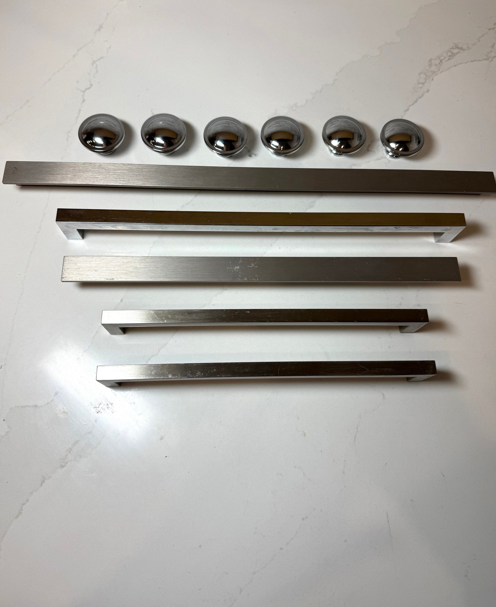 Stainless Hardware, New never used...Longer pulls 9.5 - 16, Set of 6 knobs, 1.5 inches.