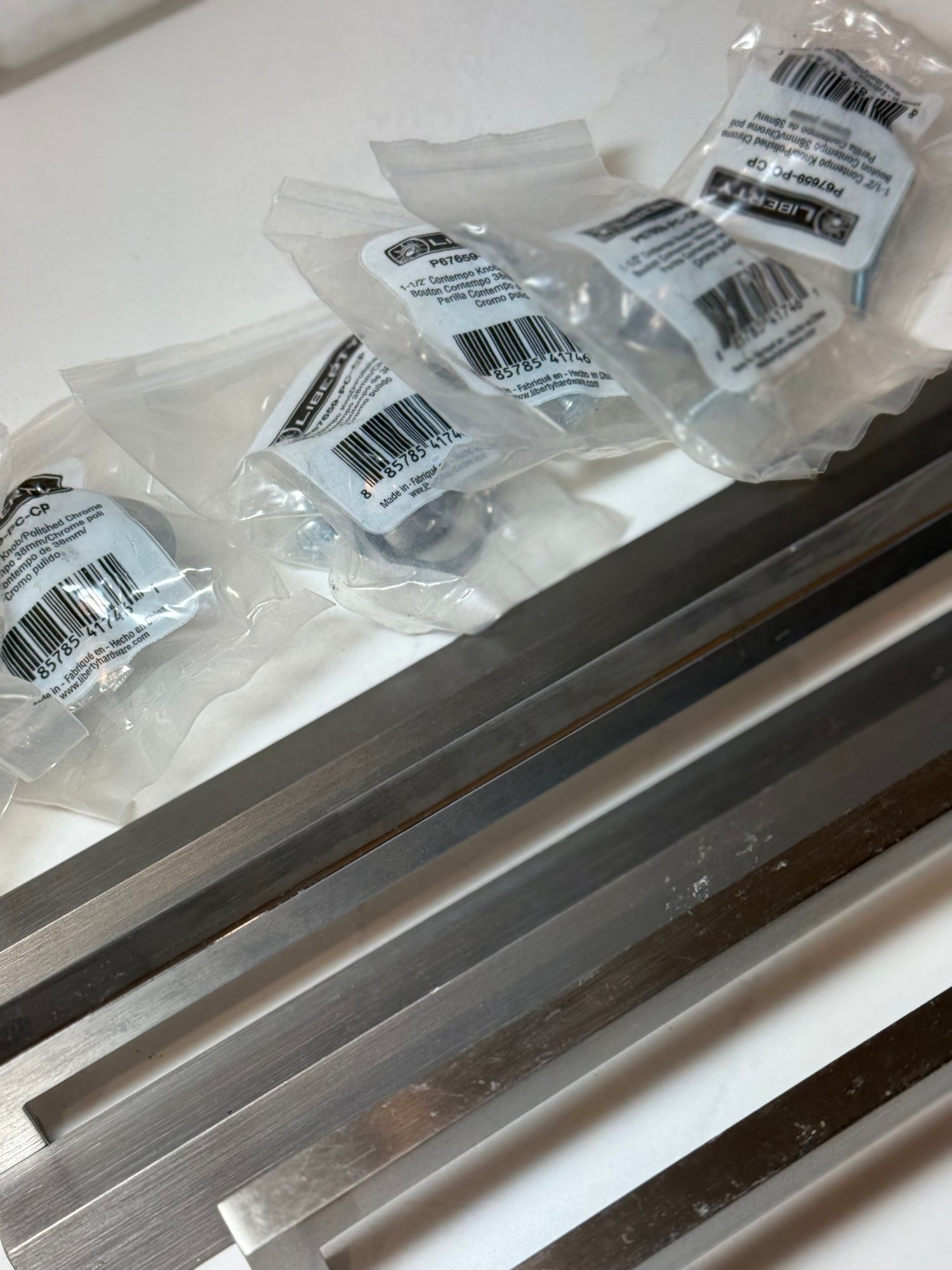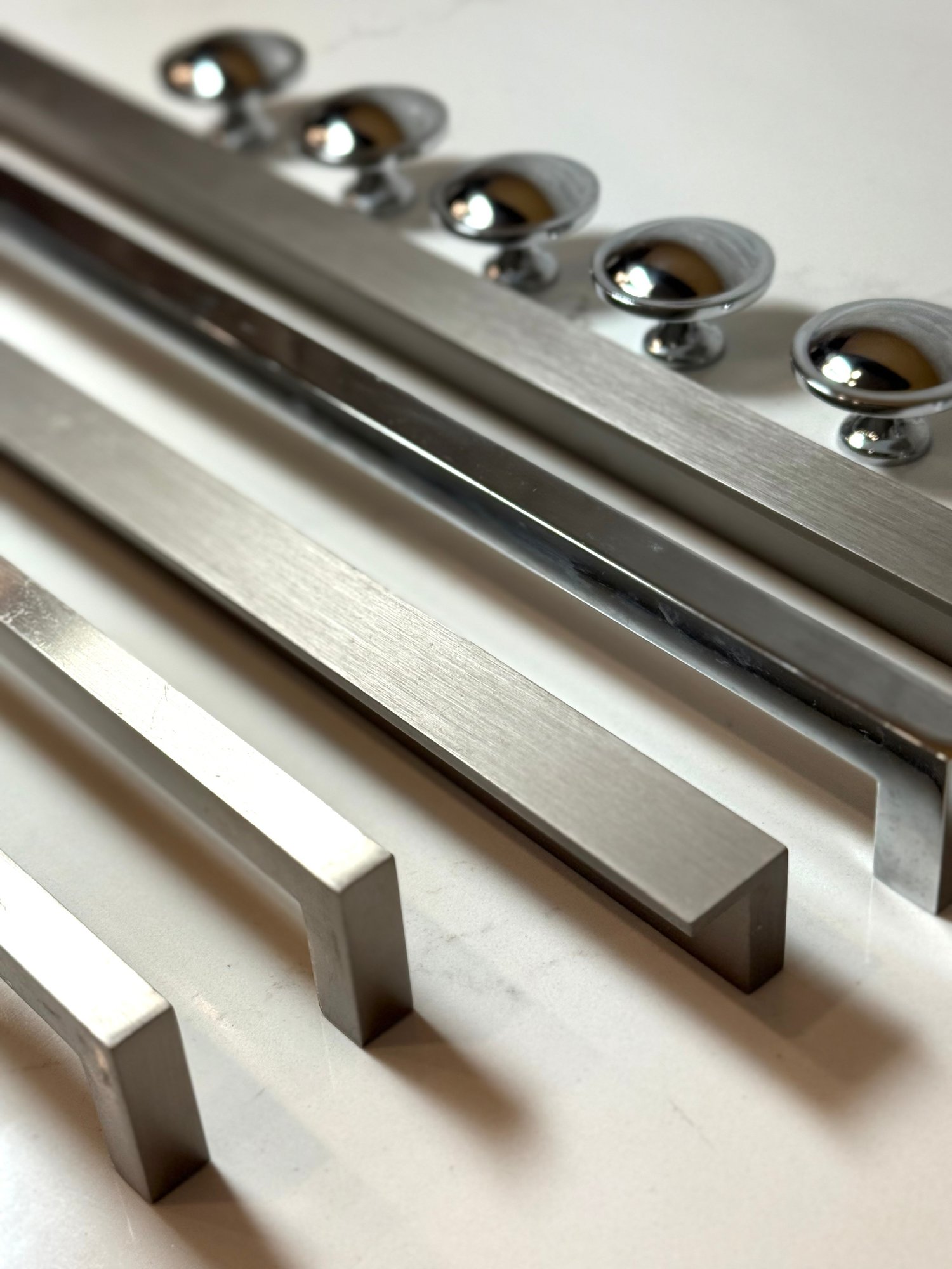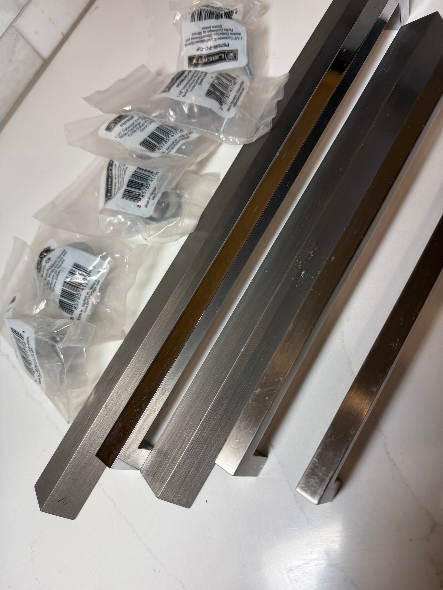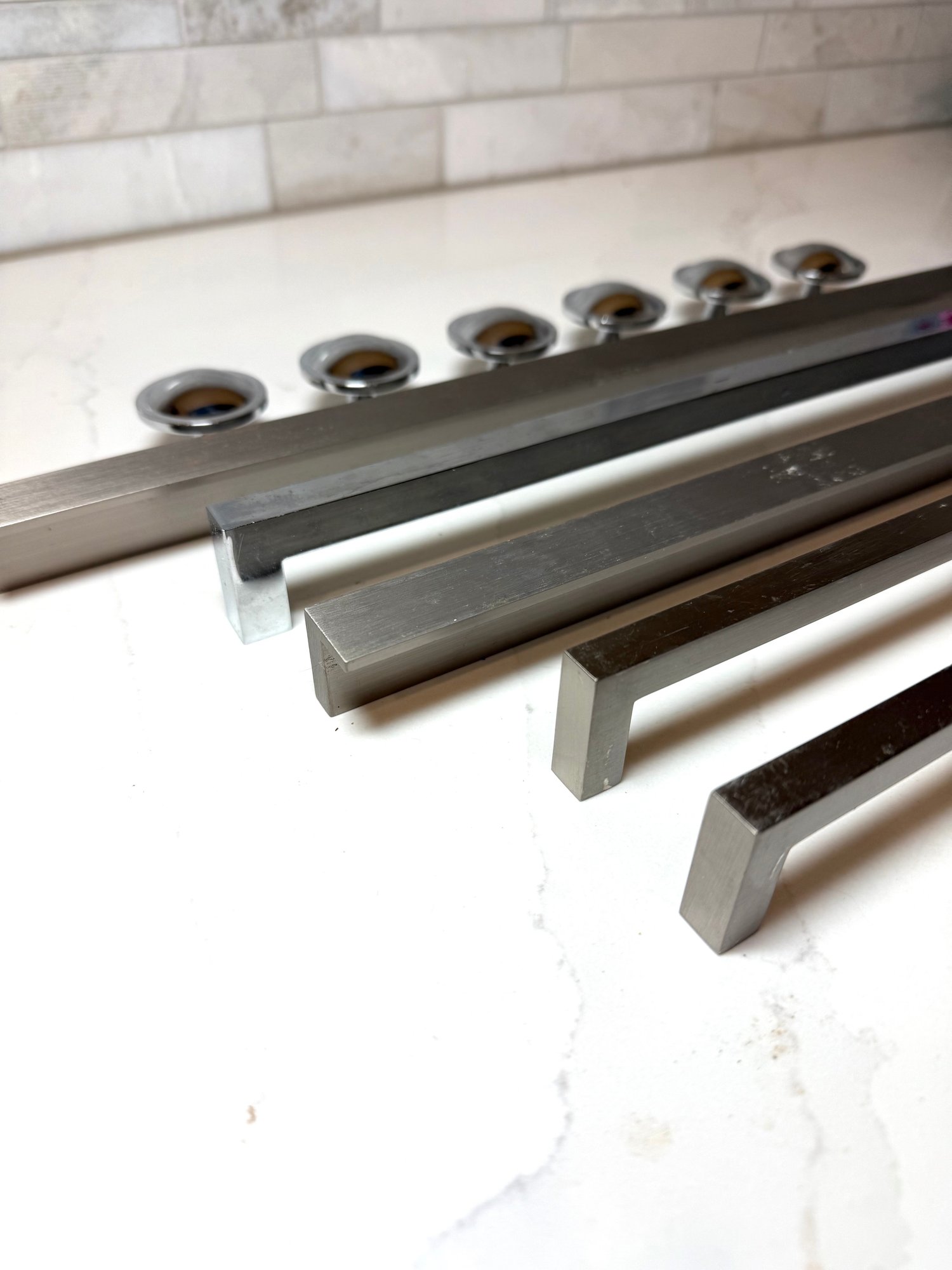Stainless Hardware, New never used...Longer pulls 9.5 - 16, Set of 6 knobs, 1.5 inches.