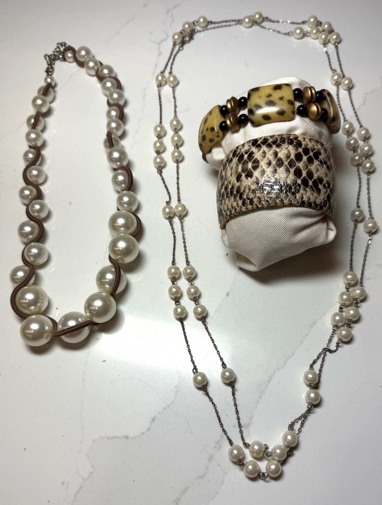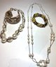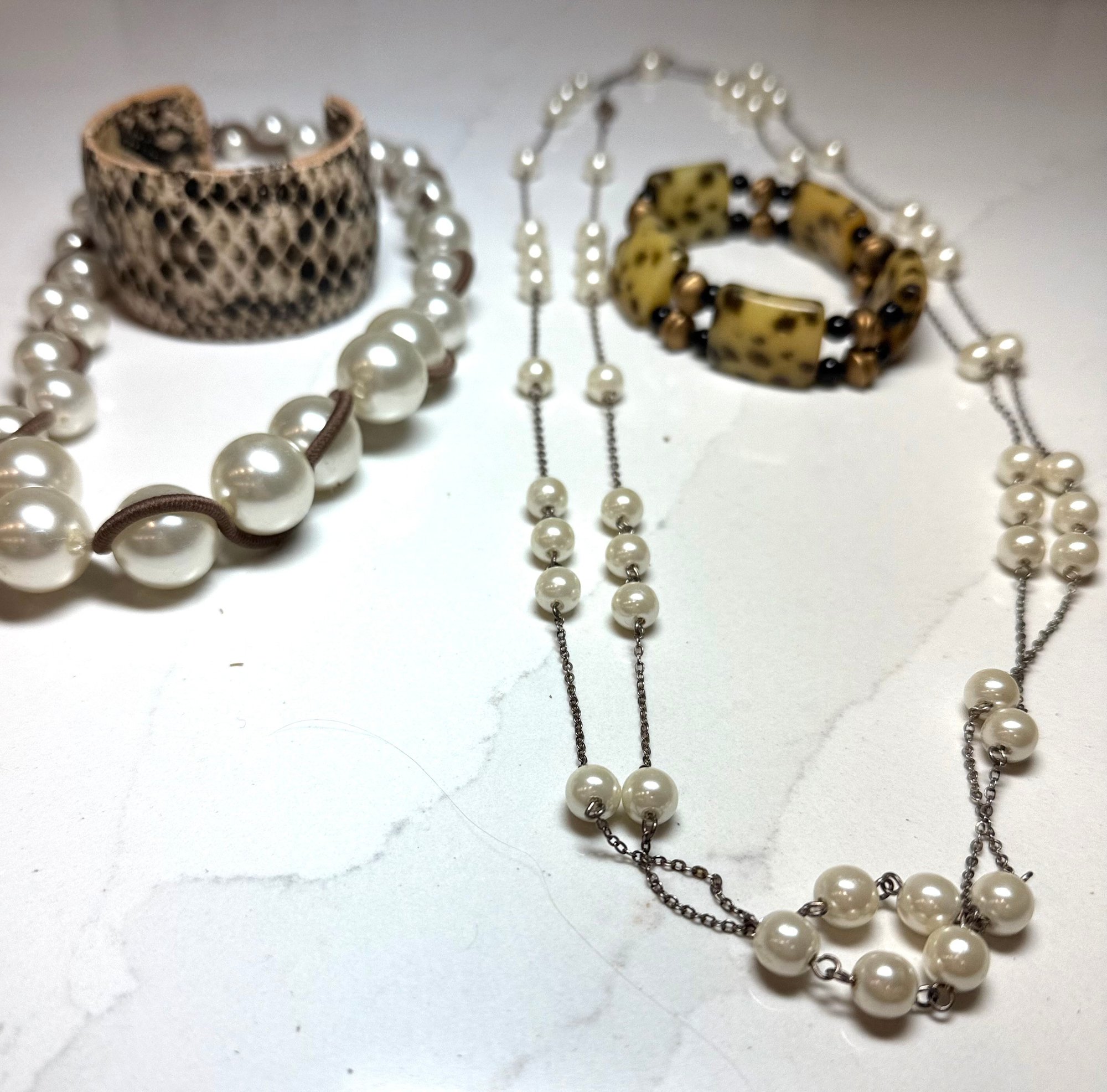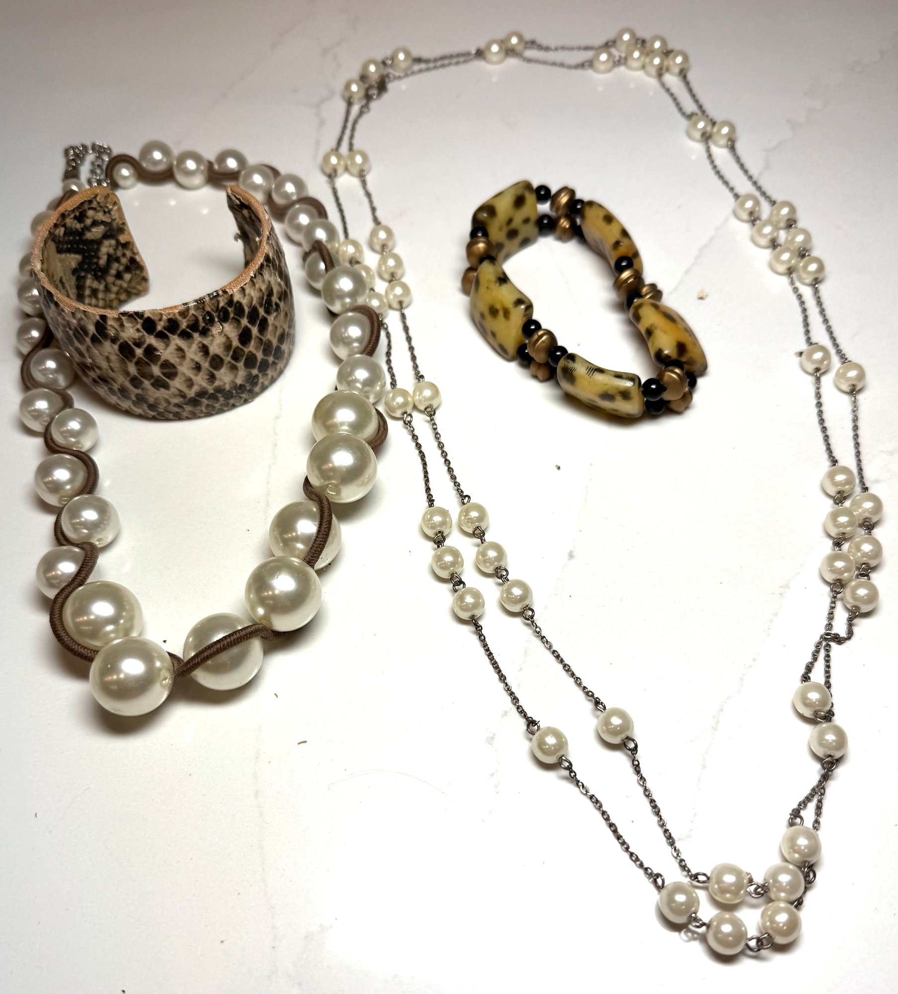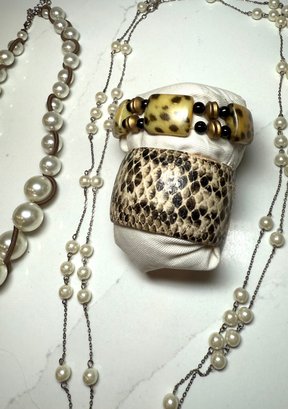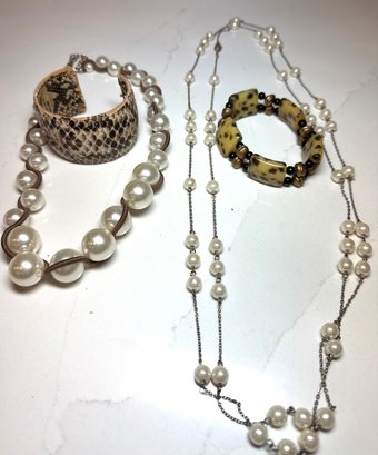 Fashion Jewelry: 2 Pearl Necklaces , dbl strand floating pearl and wrapped graduated pearl, And 2 Bracelets, one snakeskin cuff and on beaded.