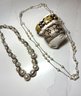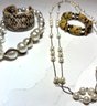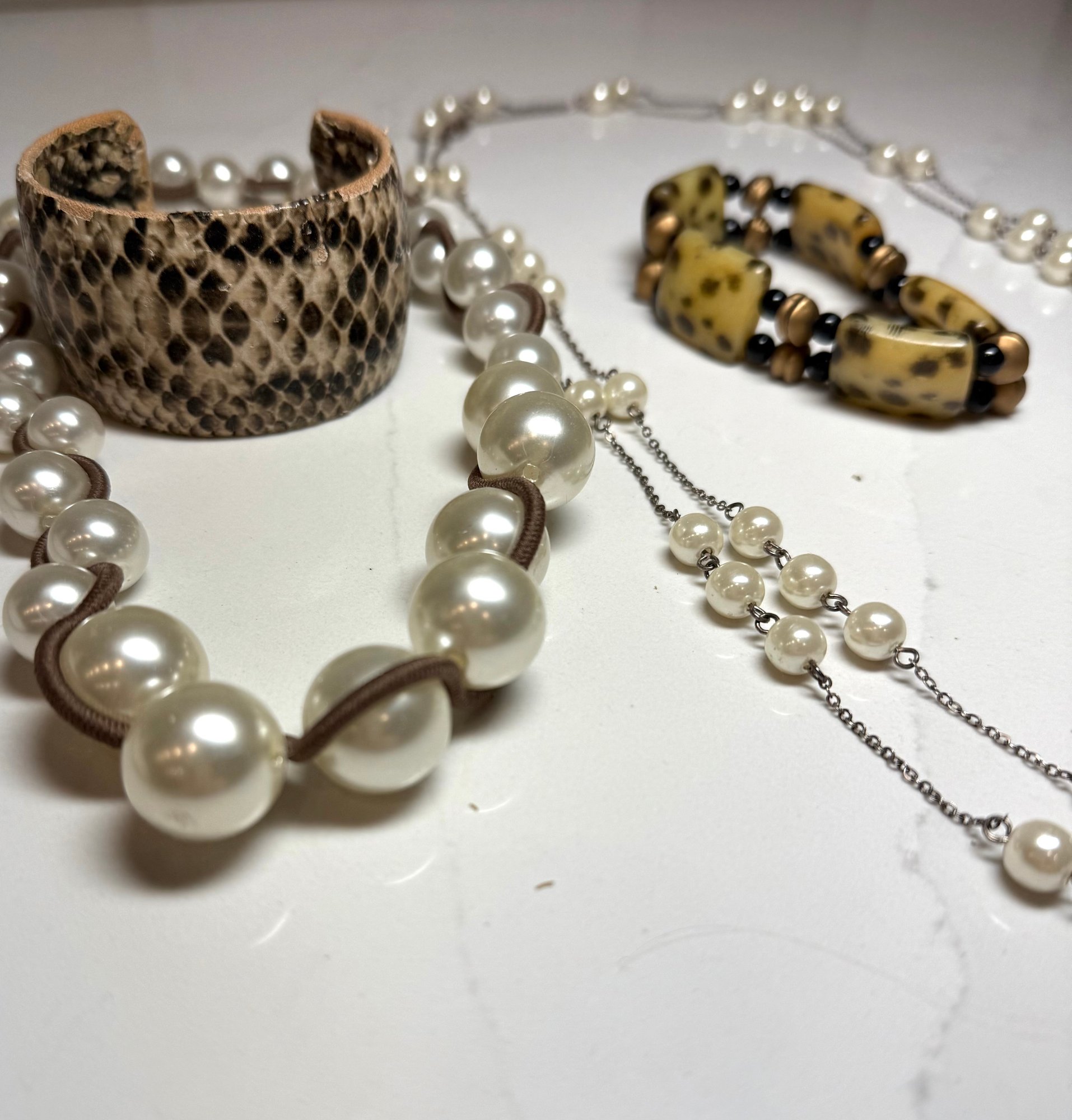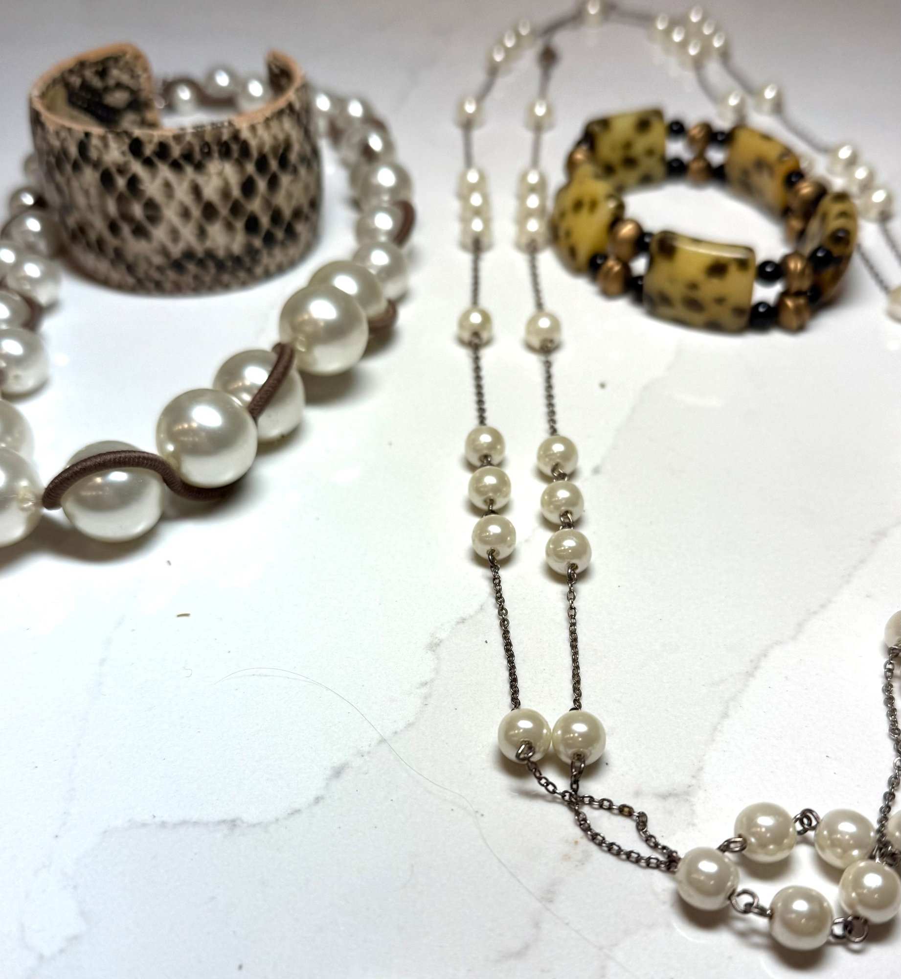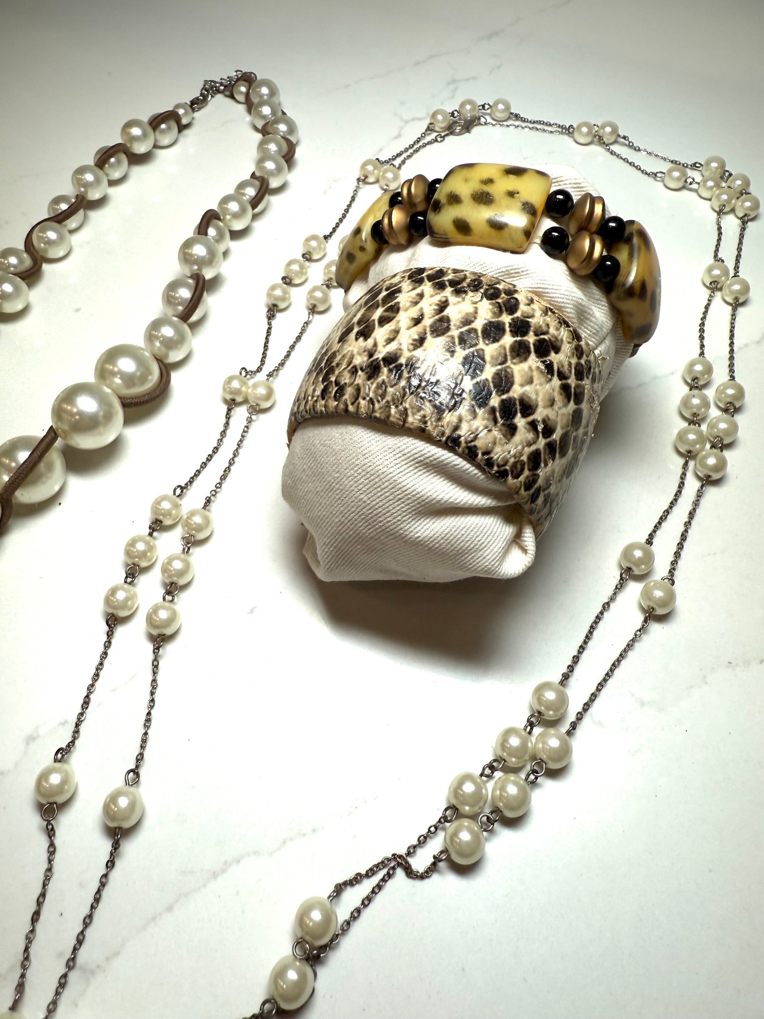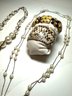 Fashion Jewelry: 2 Pearl Necklaces , dbl strand floating pearl and wrapped graduated pearl, And 2 Bracelets, one snakeskin cuff and on beaded.