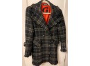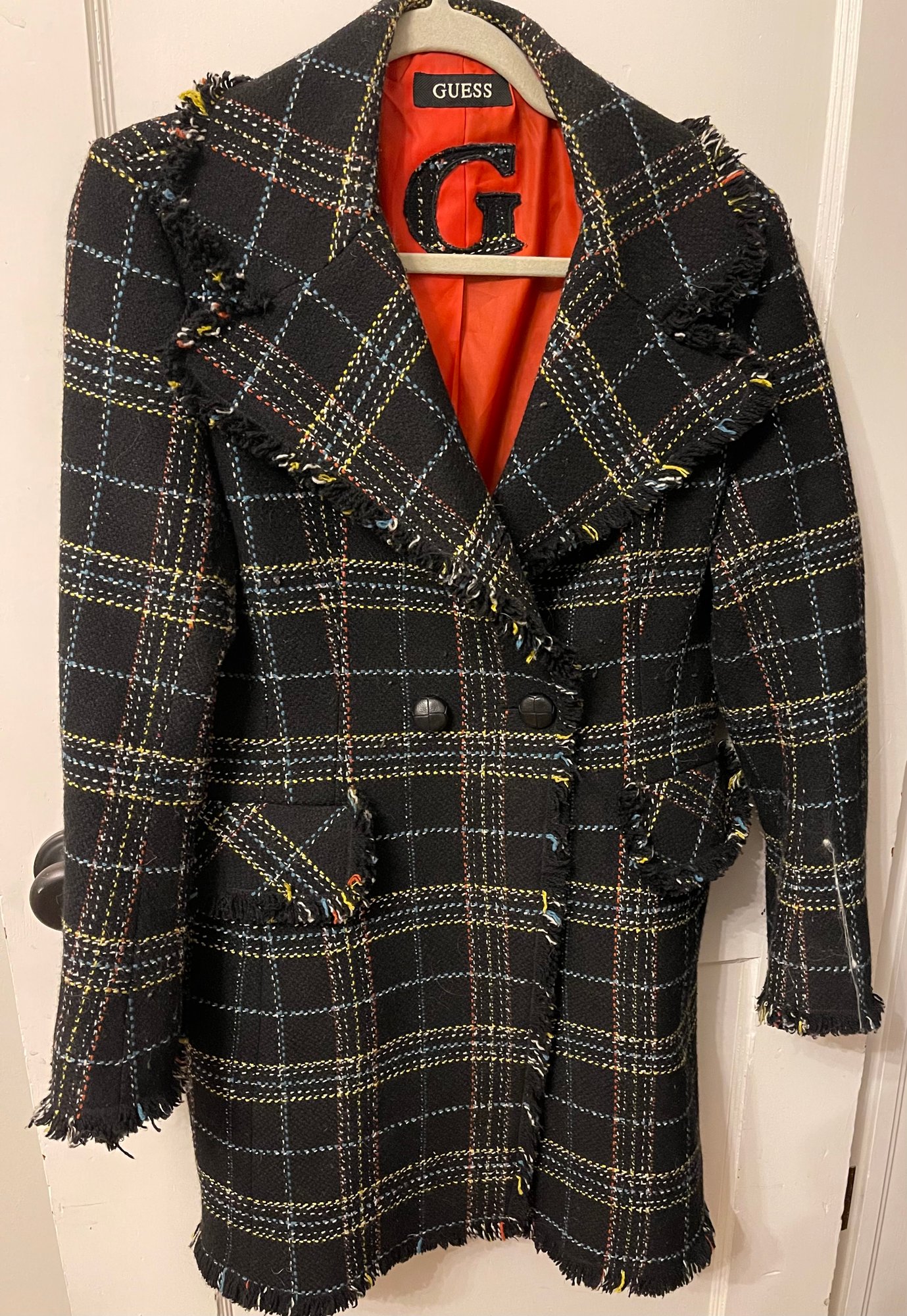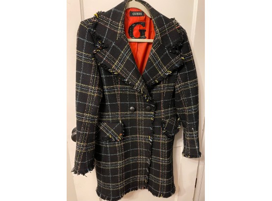 WFashionable swing coat, Black with bright threading, soft fringe, large buttons, detailed pockets and bright orange lining. GUESS 3/4 Length swing coat. Size Large.
