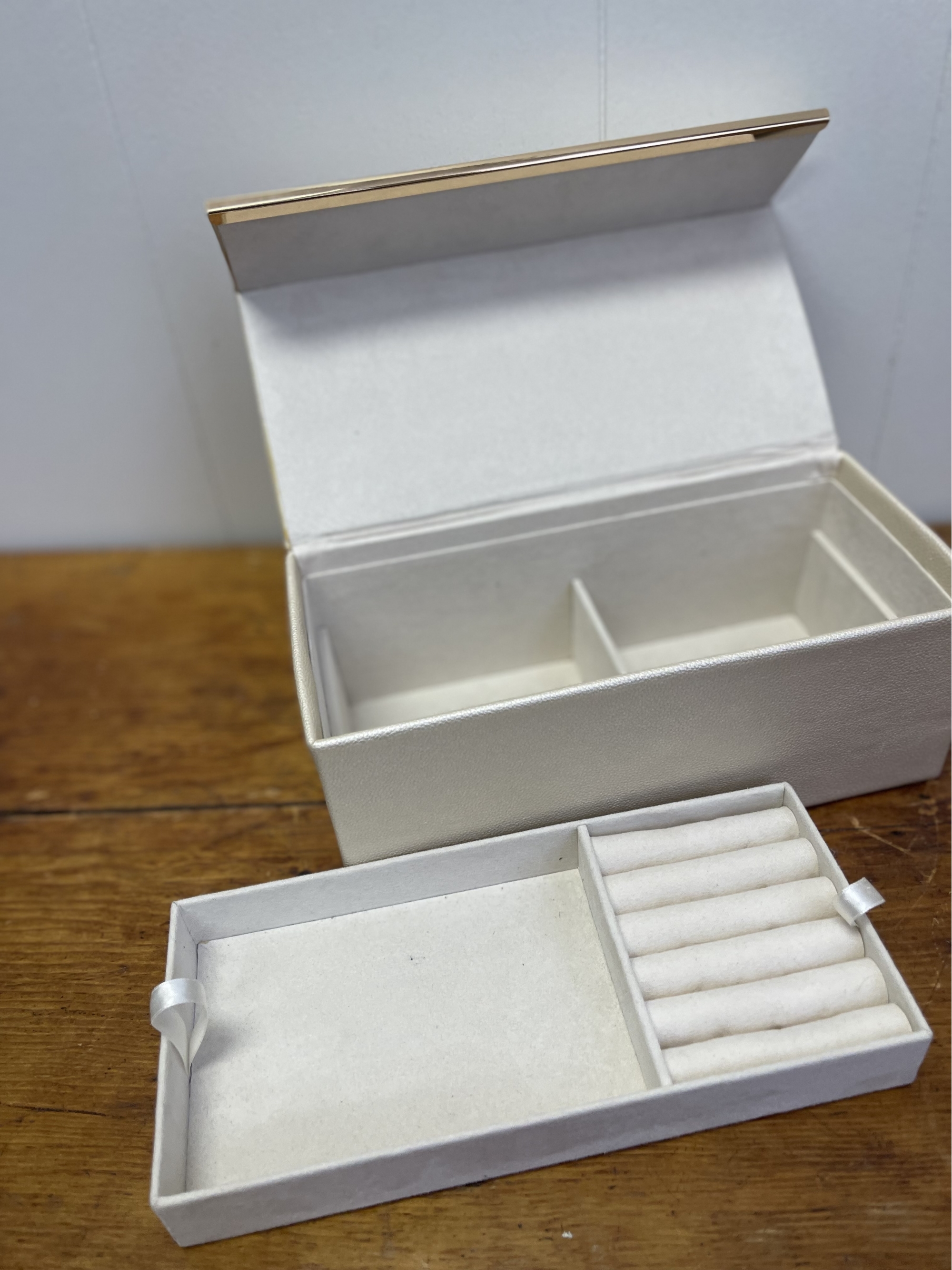 Beautiful ivory/cream colored faux leather jewelry box. Featuring gold colored bar magnetic closure. Two tiers for ample storage. Great condition. Approximate mesurements: Lenght 10" Width 5" Height.