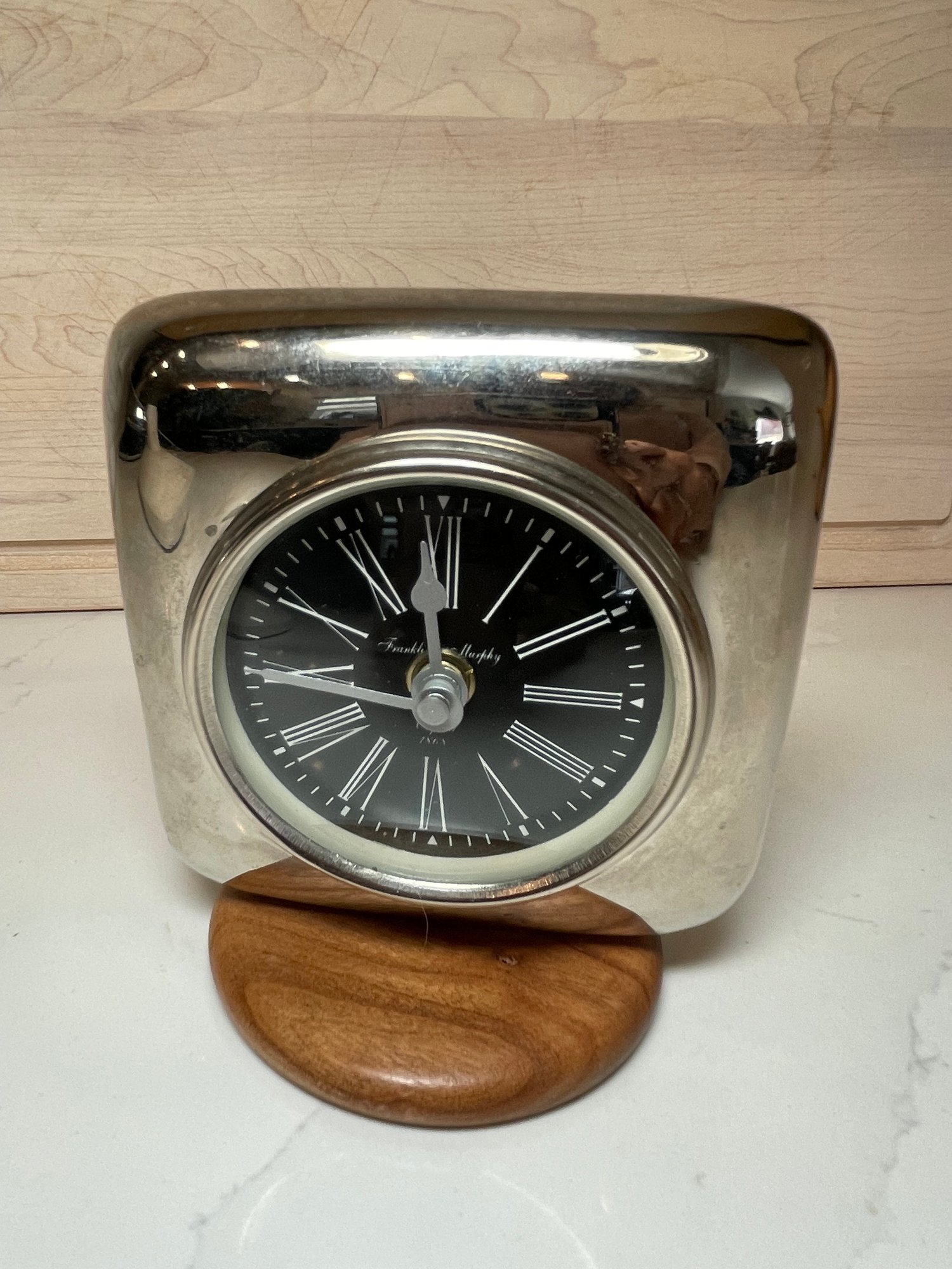 Franklin & Murphy Oxford 1868 Desktop Clock, Square Blk Face On Wood Base.