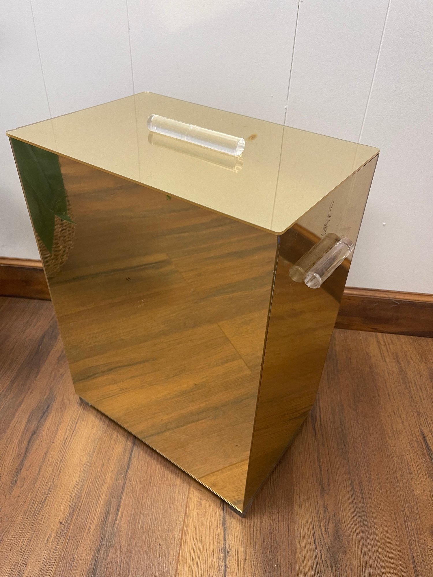 Regency Style Lucite Mirrored Gold Hamper. Great style with lucite handles on side and on top. Clear lucite cubed feet ( one missing but stands stable and square on 3), and clear bottom. Some scrapes and chips, but still makes as great impact! 9.25 x 14 x 19 high.
