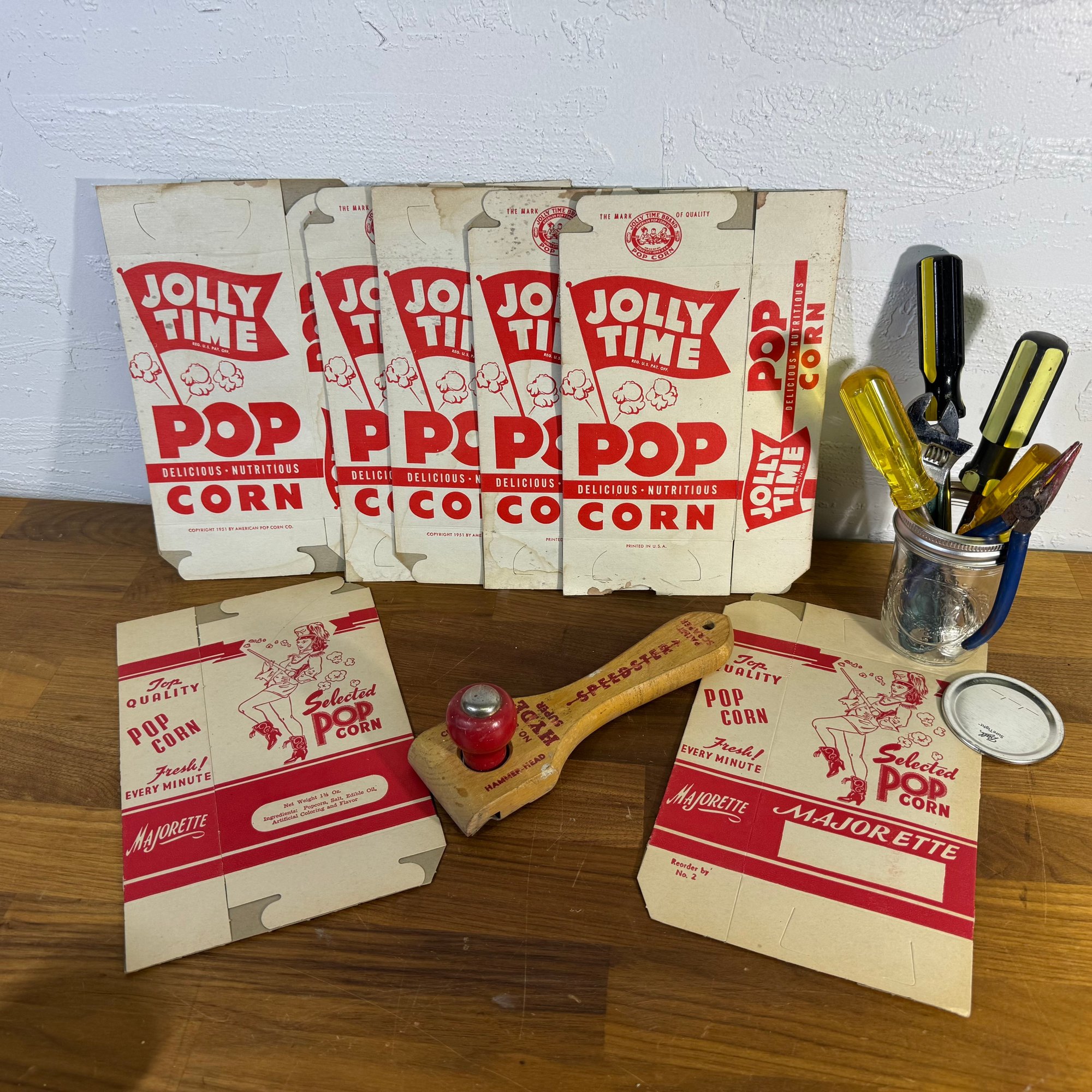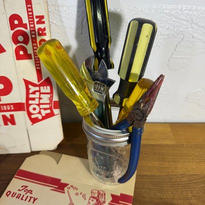 Jar Of Needed Hand Tools And New Old Stock Popcorn Boxes