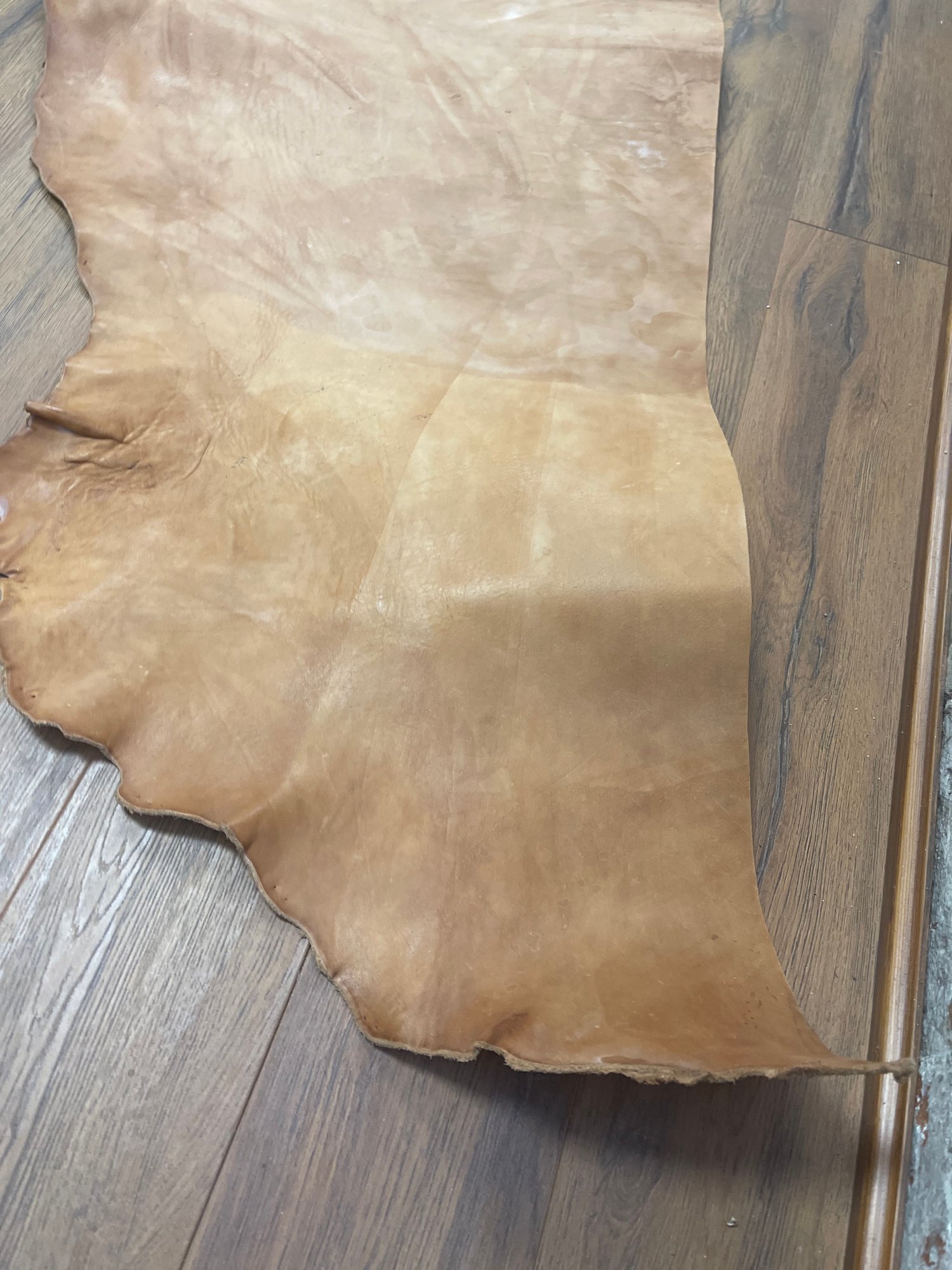 Great camel leather color Perfect for bench or pillows etc. Uneven edges, but approximately 28 x 65