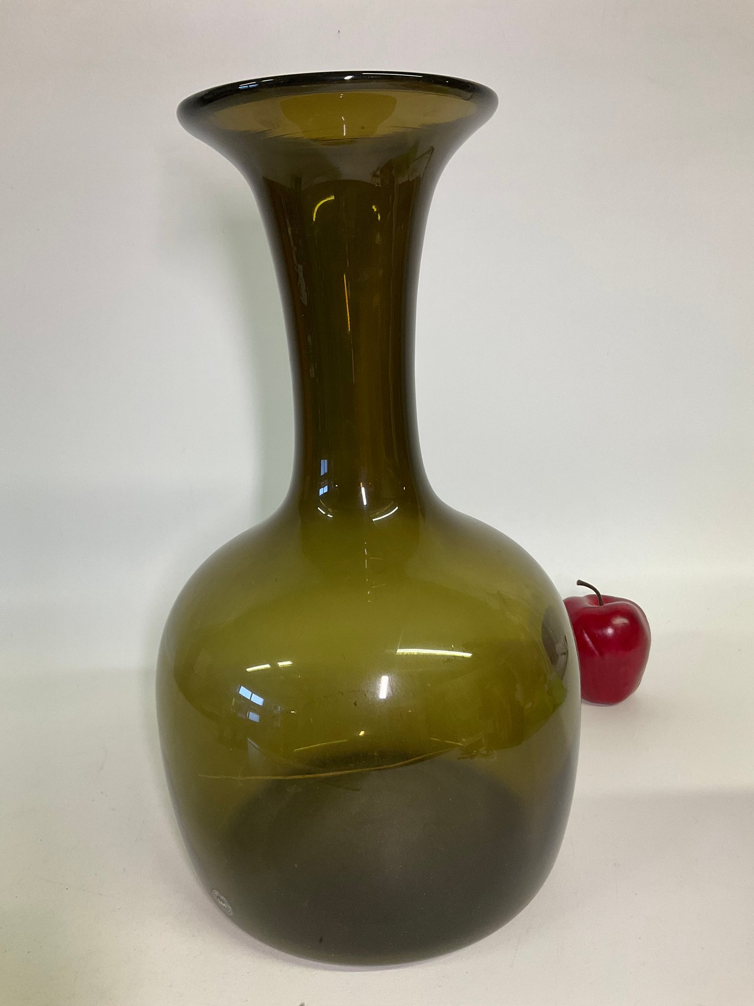 Fabulous mid century large vase in lovely olive grey green glass that will be a showstopper filled with your favorite stems or shining naked