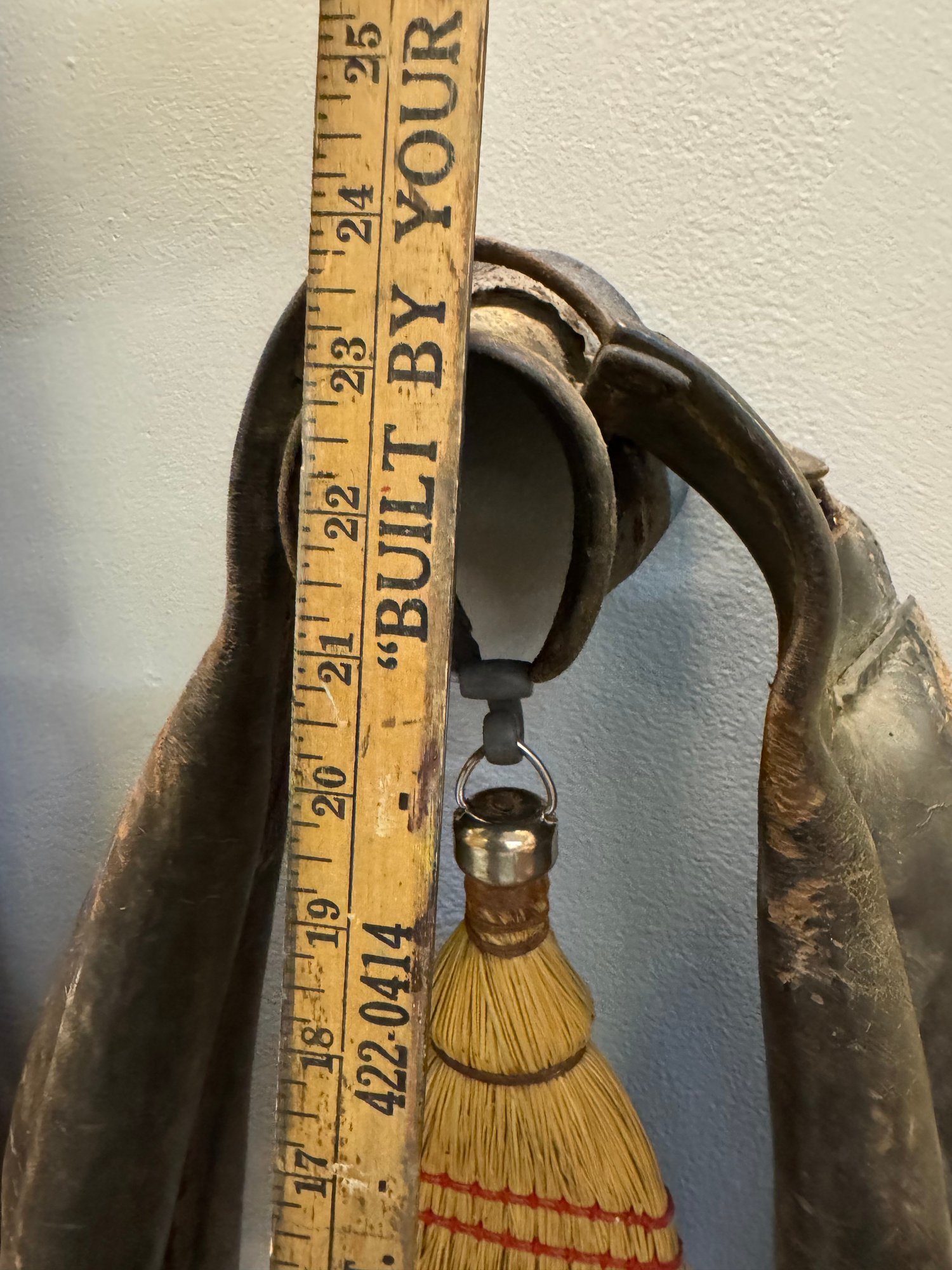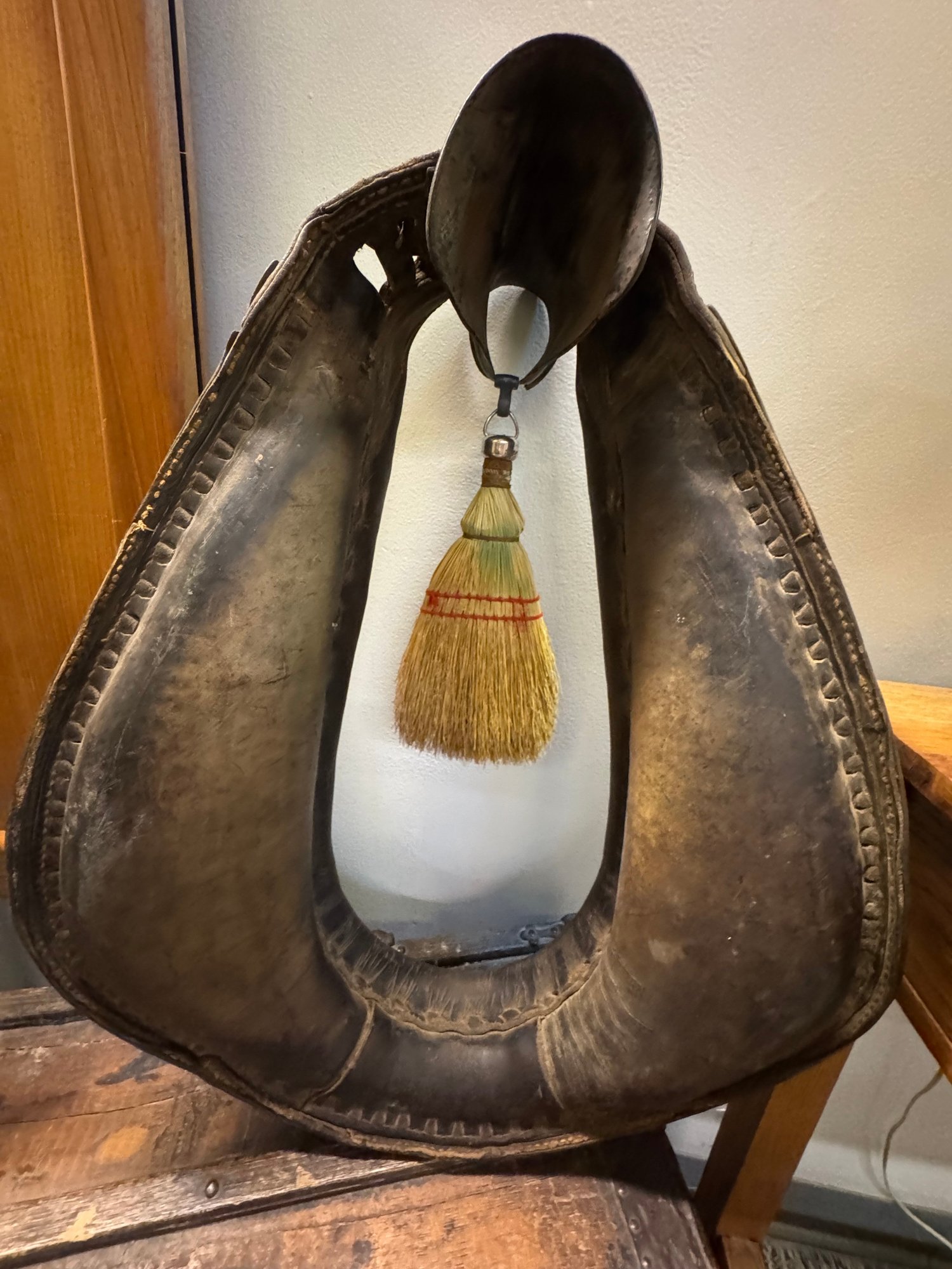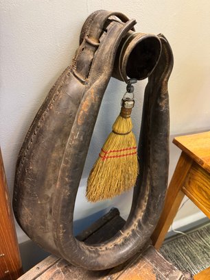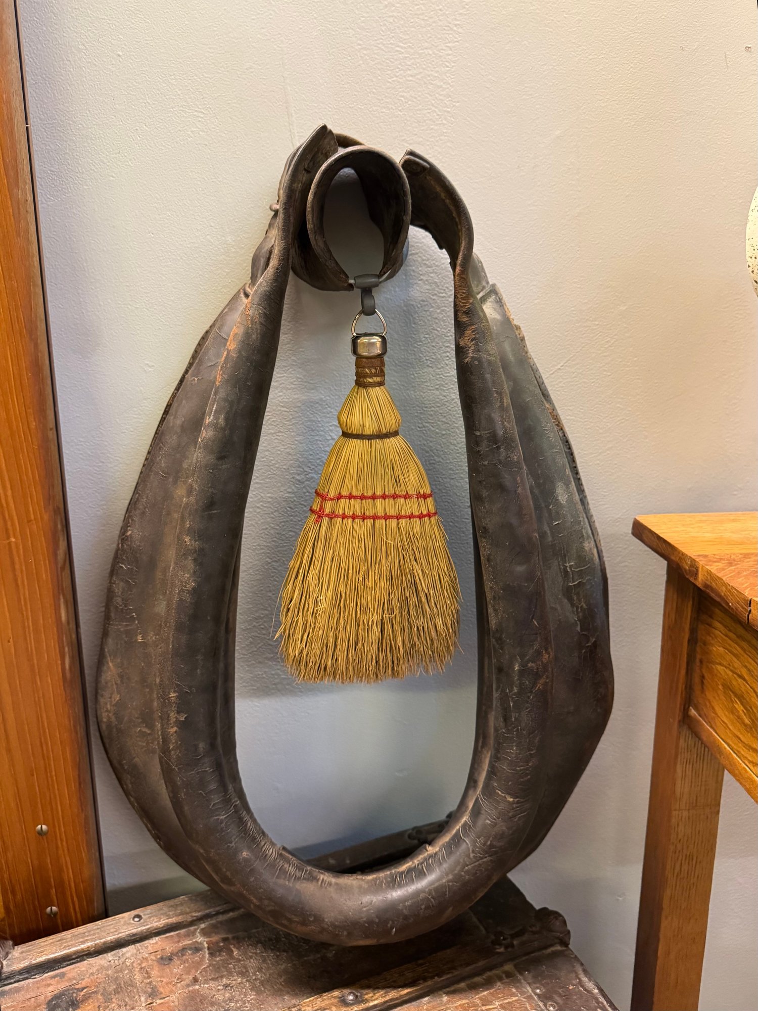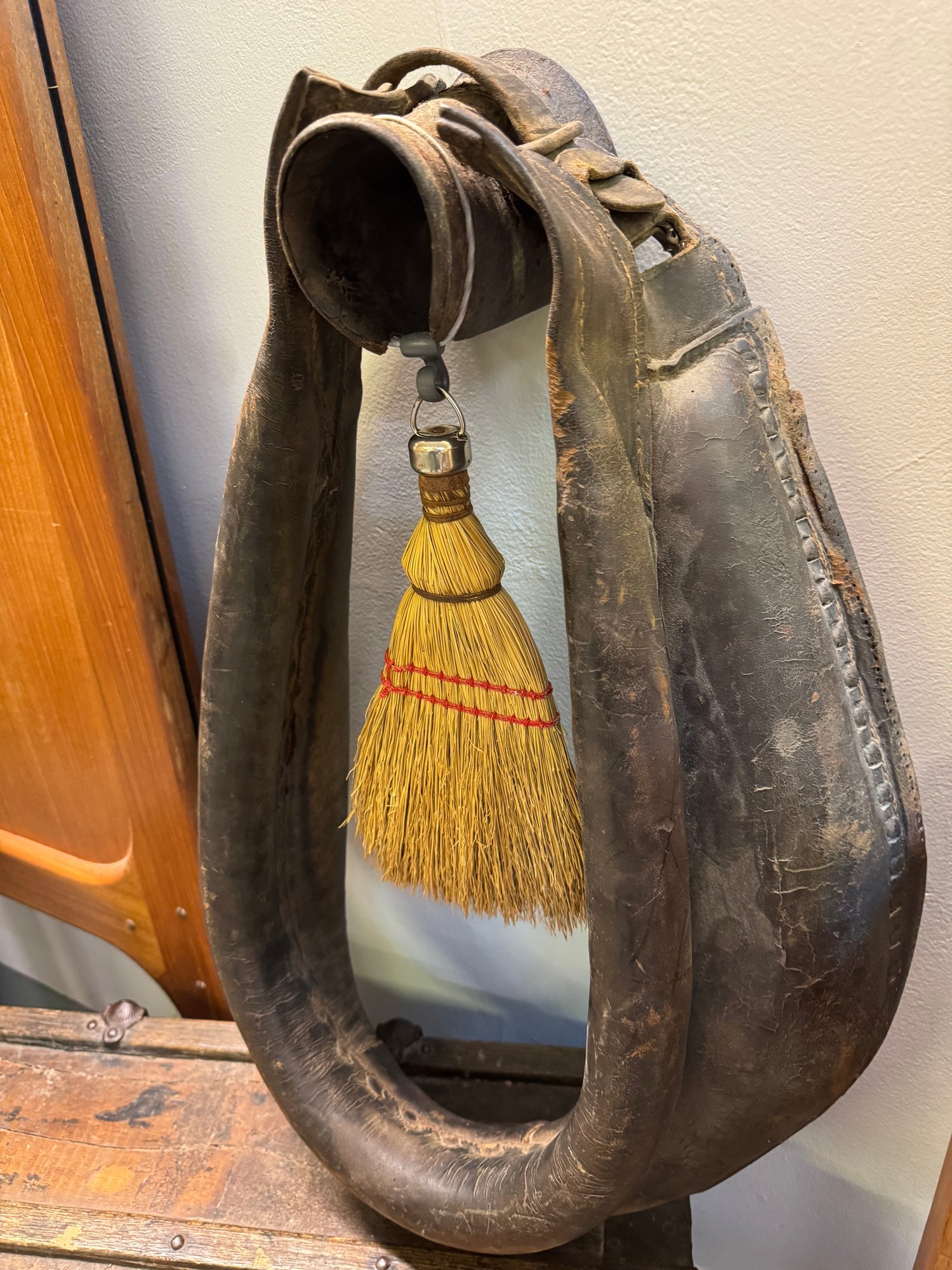This old leather collar is actually in pretty nice condition, as the leather is still supple. Nice artisan work and is open at top. Here it has been utilized with a little whisk for handy clean ups.