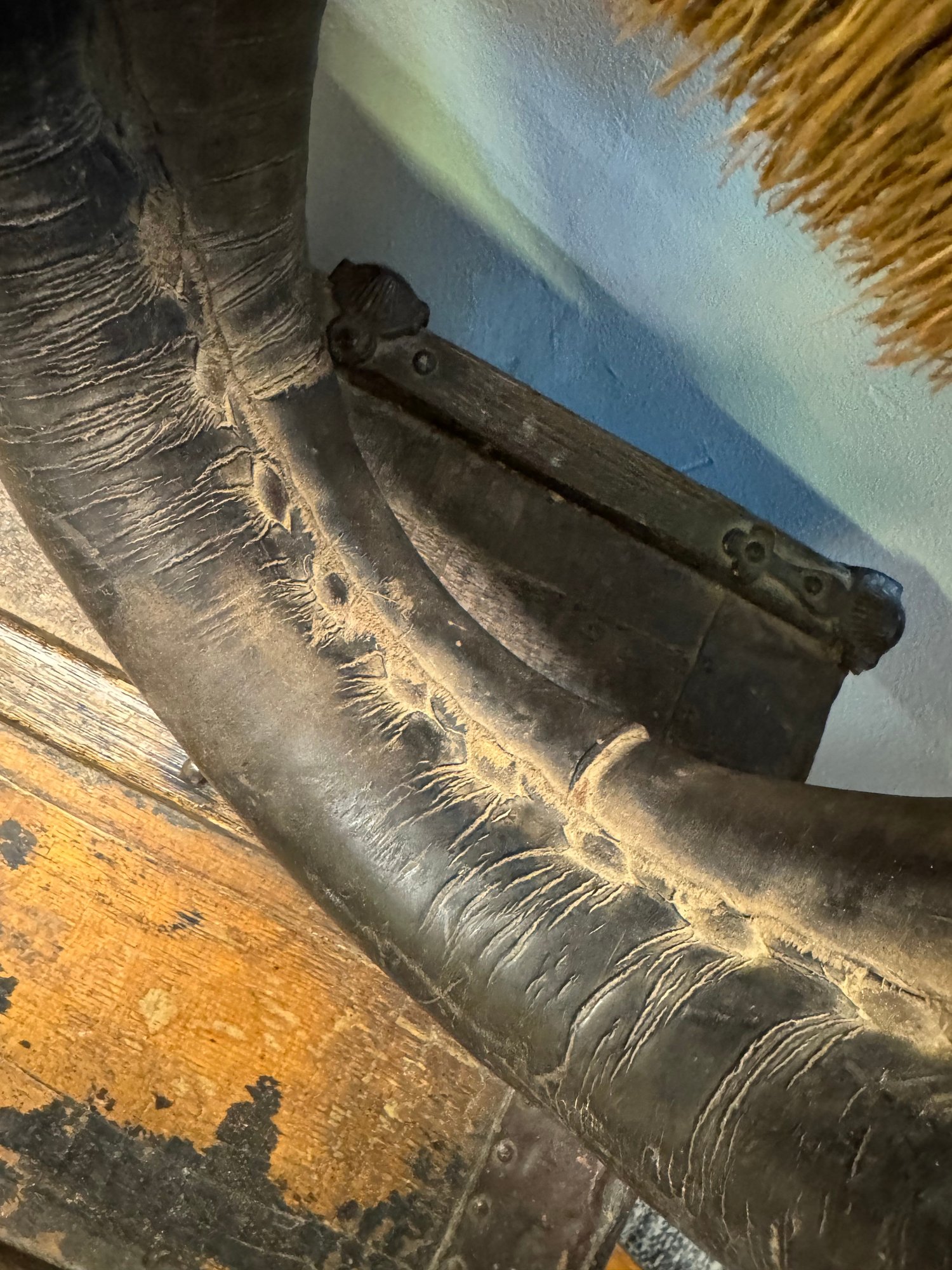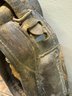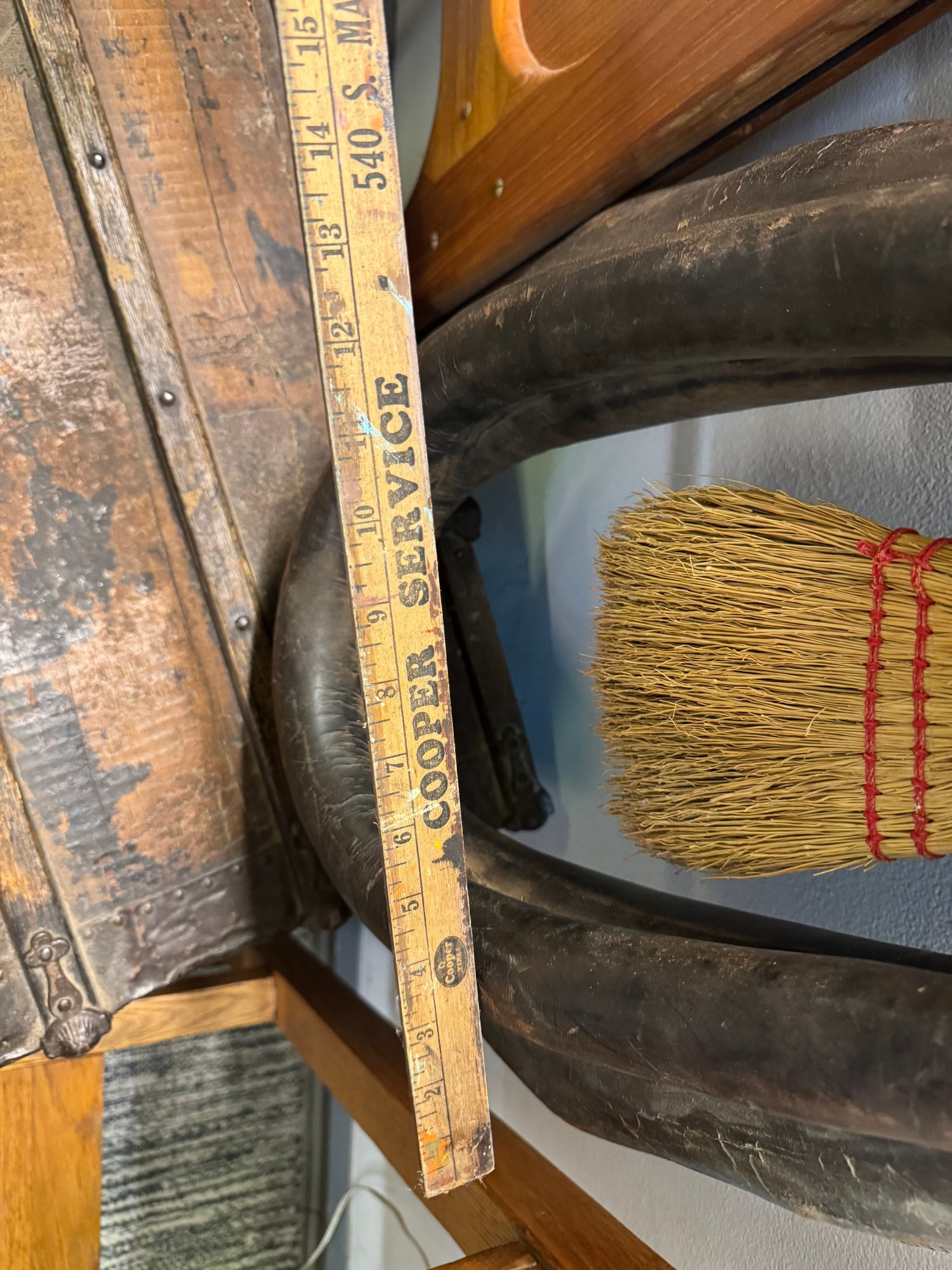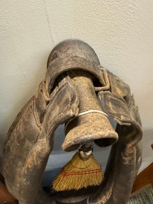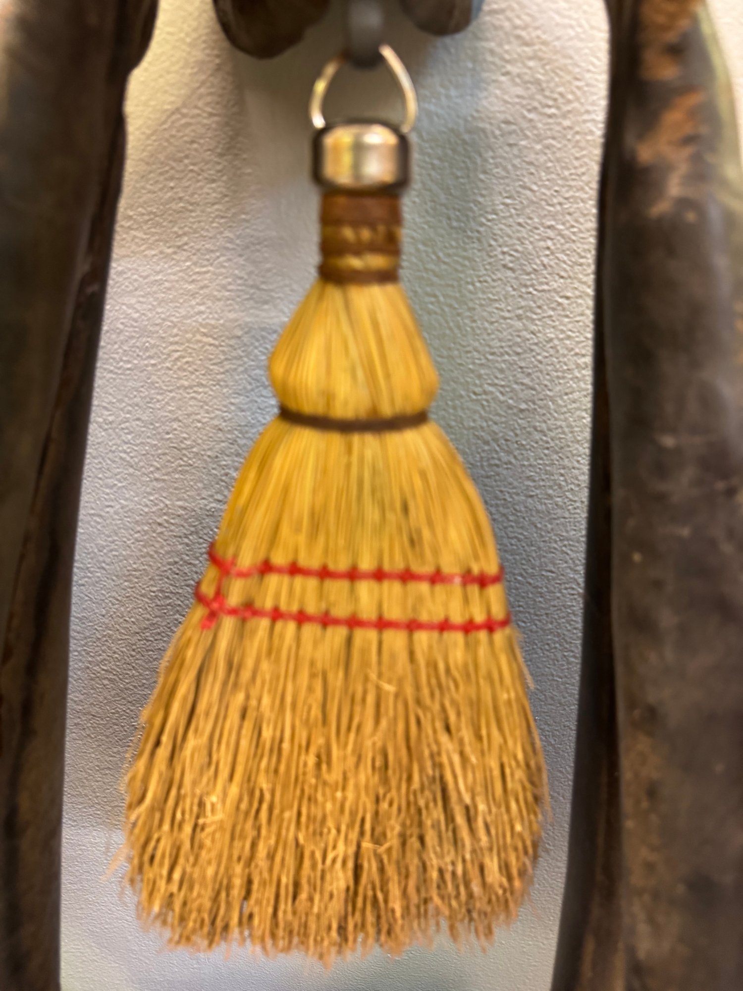 This old leather collar is actually in pretty nice condition, as the leather is still supple. Nice artisan work and is open at top. Here it has been utilized with a little whisk for handy clean ups.