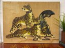 Burlap is mounted on board with brass nails around edges. Paint is thick and raised. Water damaged, but overall condition of paint and is good and still has lots of charm