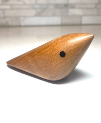Fabulous Danish Modern carved figurine. Large Twirling Bird Polished Wood Sculpture By Jakob Hermann For Warm Nordic. 6 wide x 2 high with set wood eye.