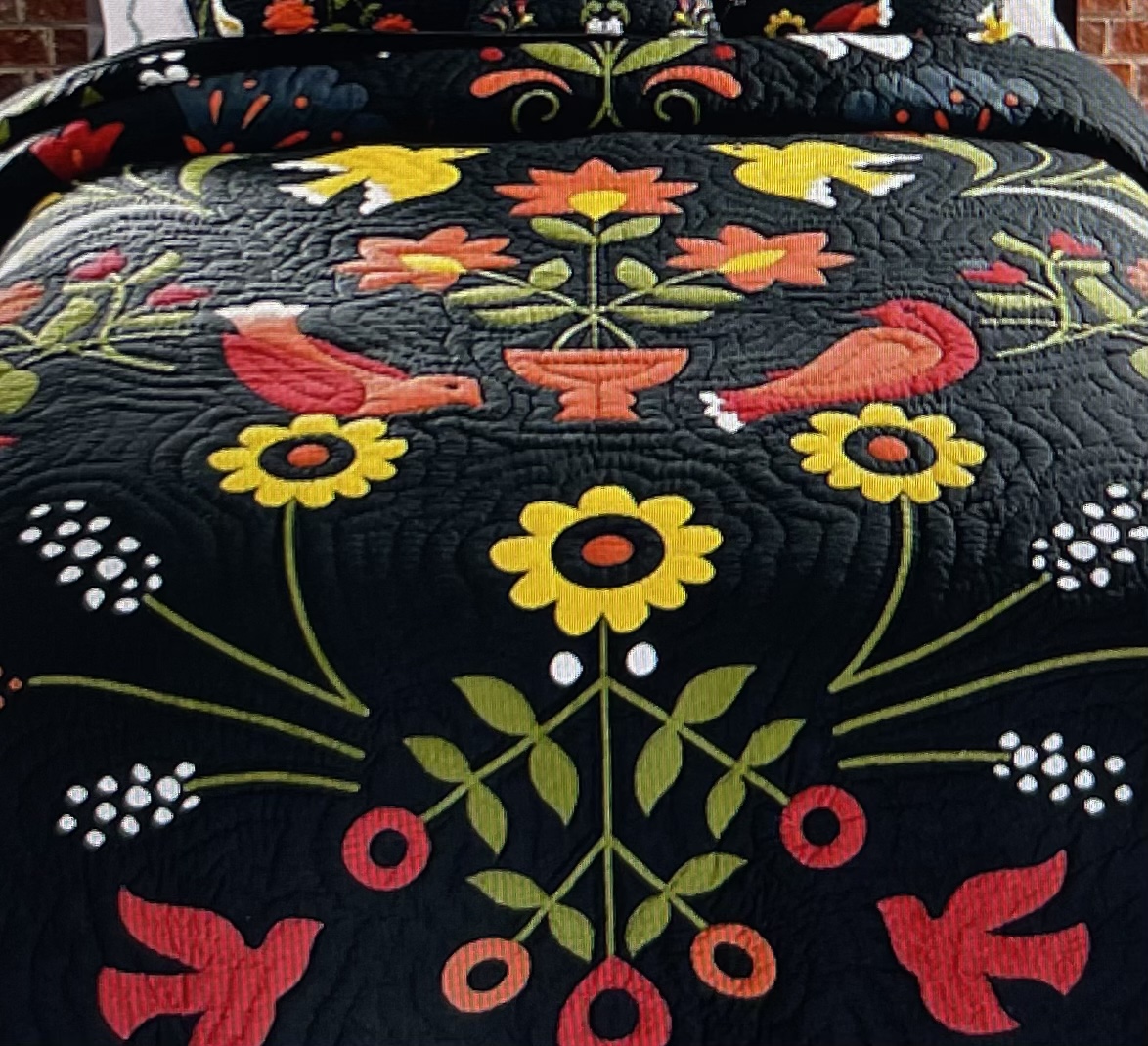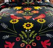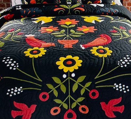 Plow and Hearth Ansley Folk Art Cotton Printed Quilt Set With Full/Queen Quilt And Two Standard Shams. Multi color bird and floral Vine design. Black back ground