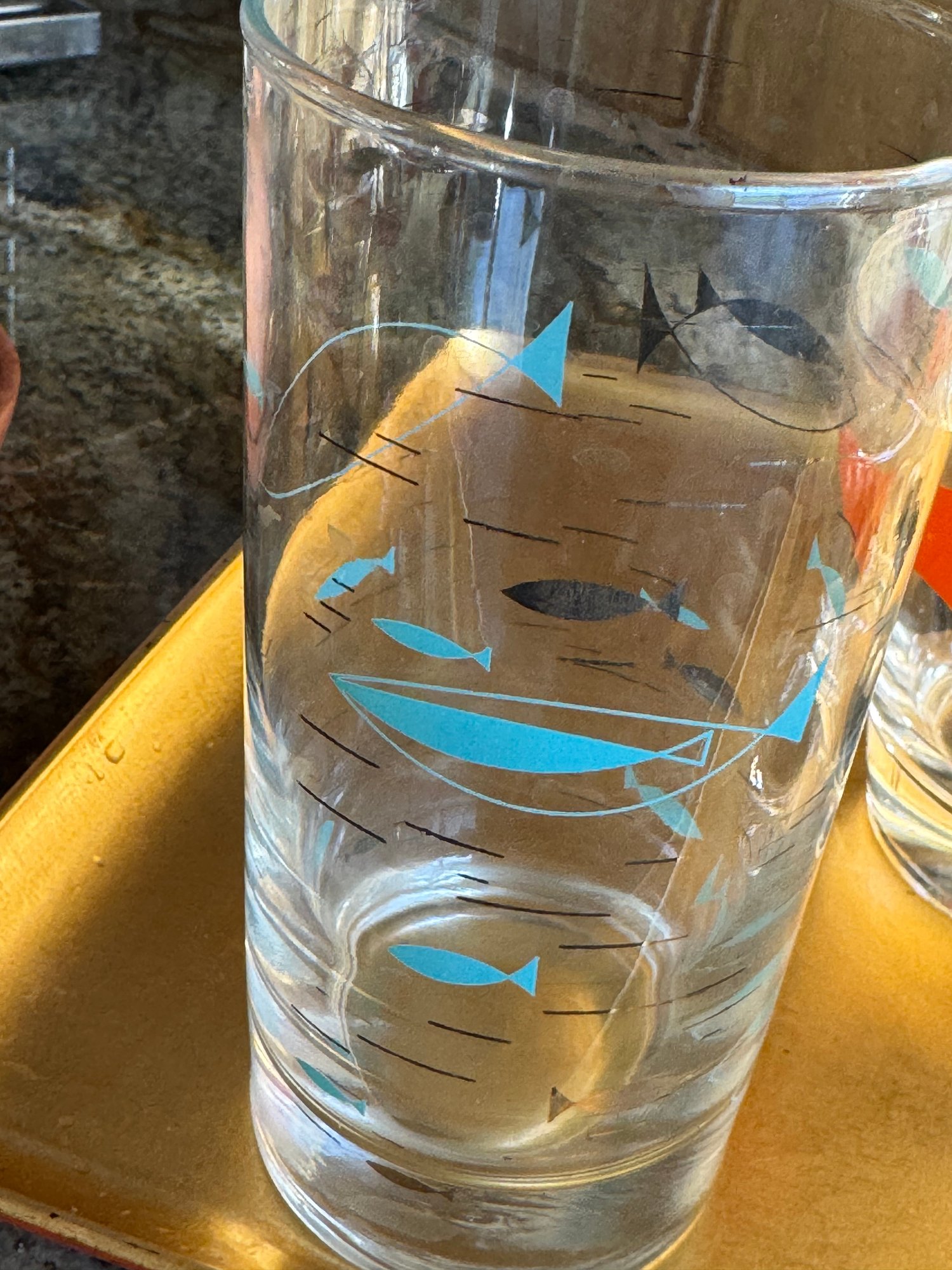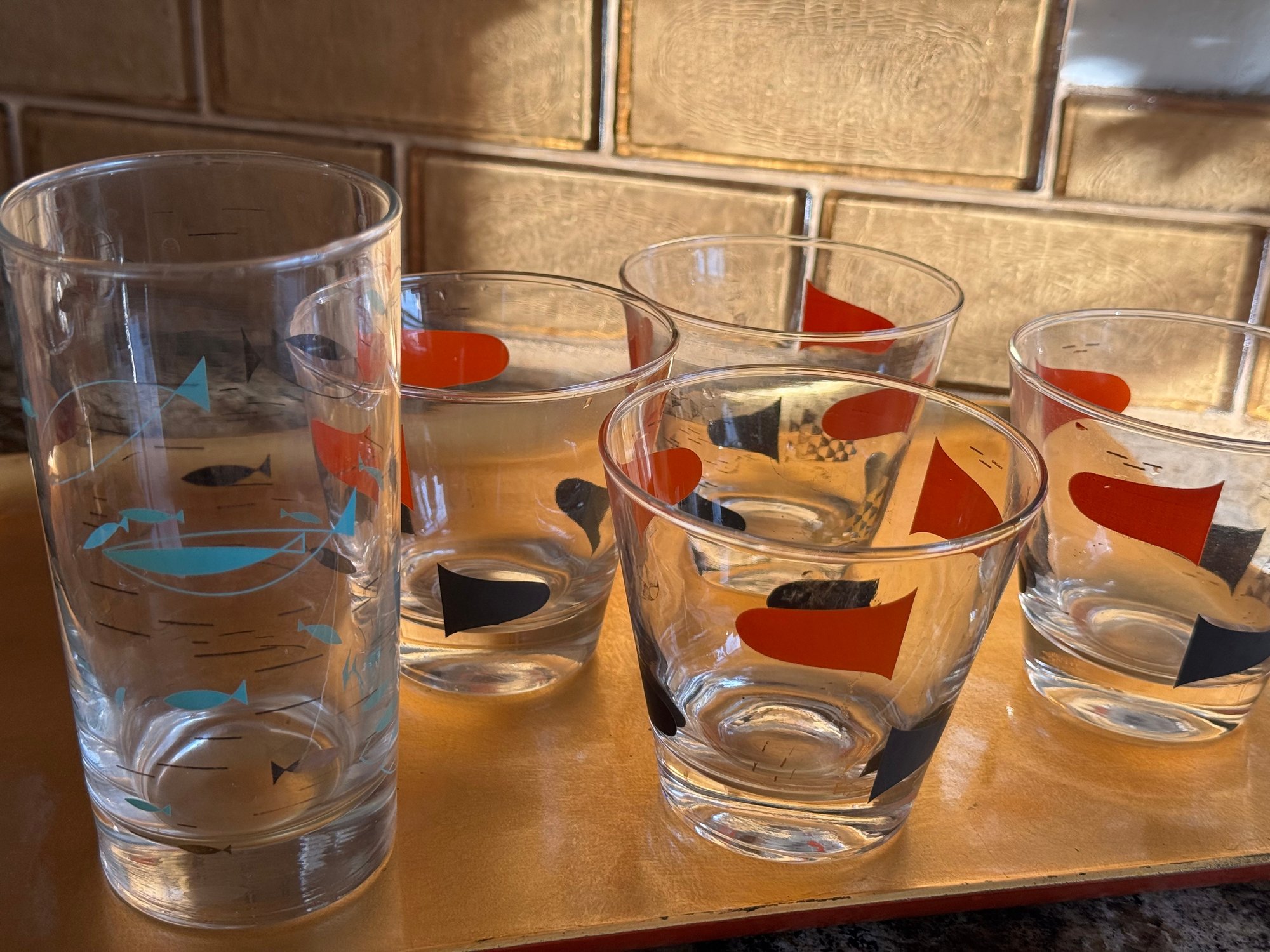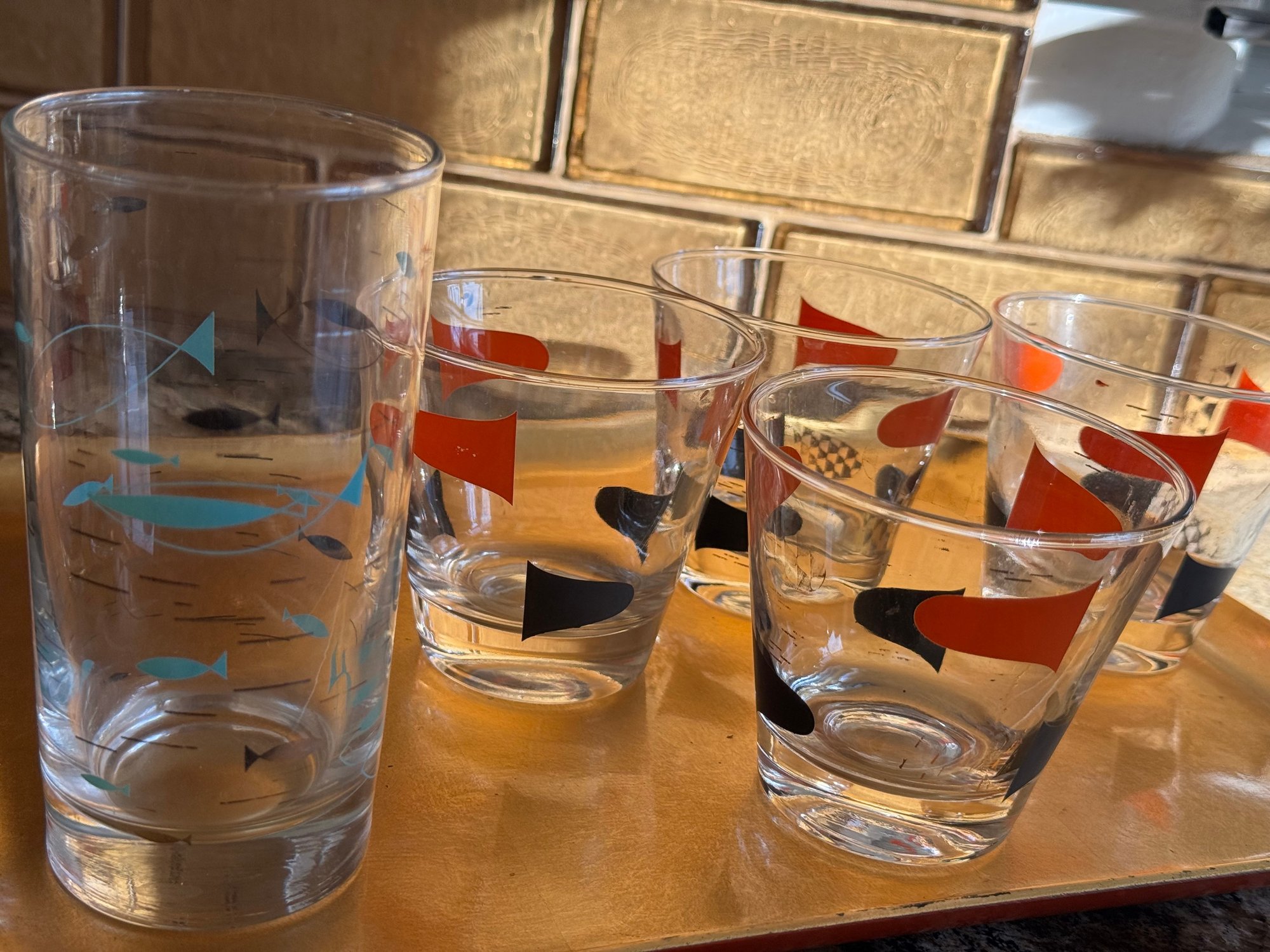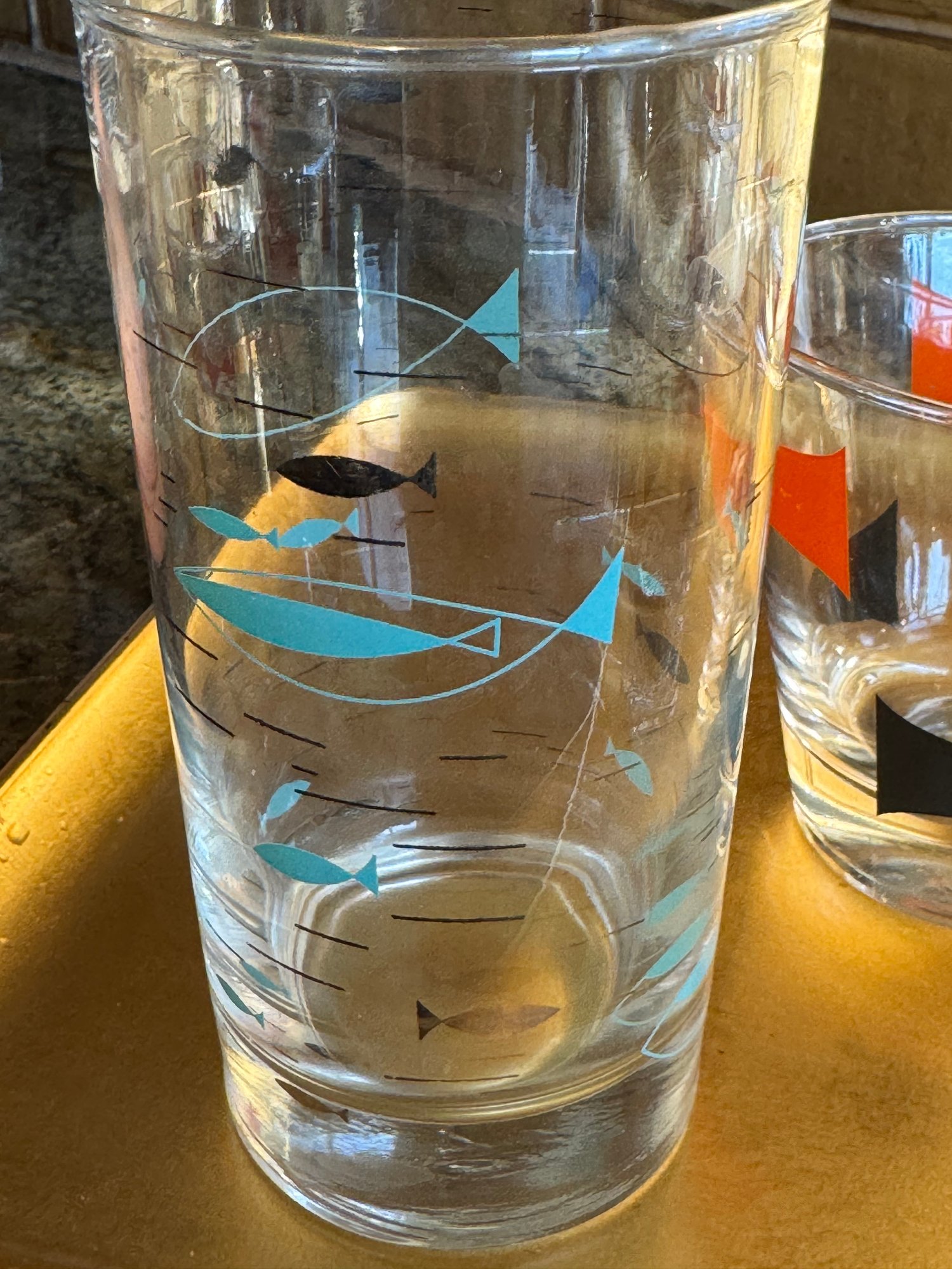 Some definite ware on the classic low ball mid century glasses and a tall and slender fishy themed highball to treat yourself right.