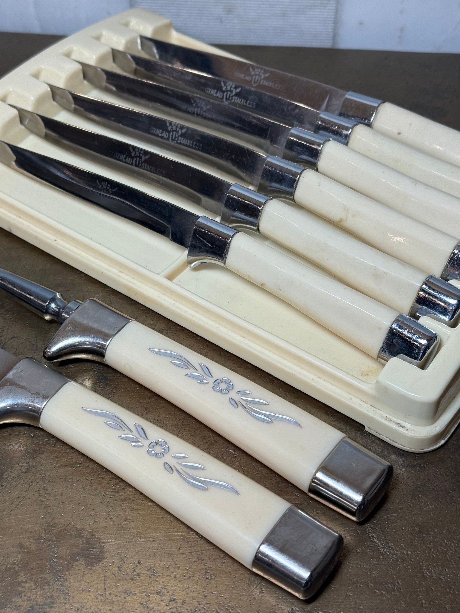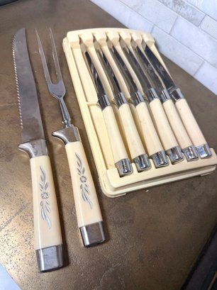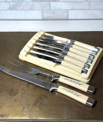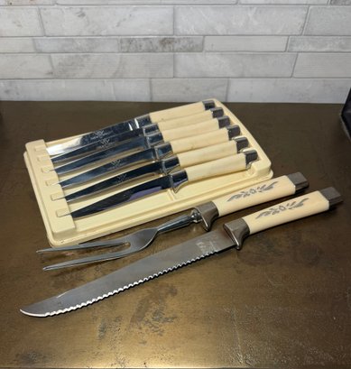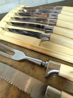 MCM Sheffield Royal Carving Set With 6 Oxhead Stainless Steel Knives In original case. All look brand new, sharp, and unused.