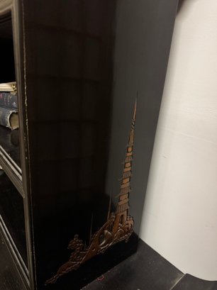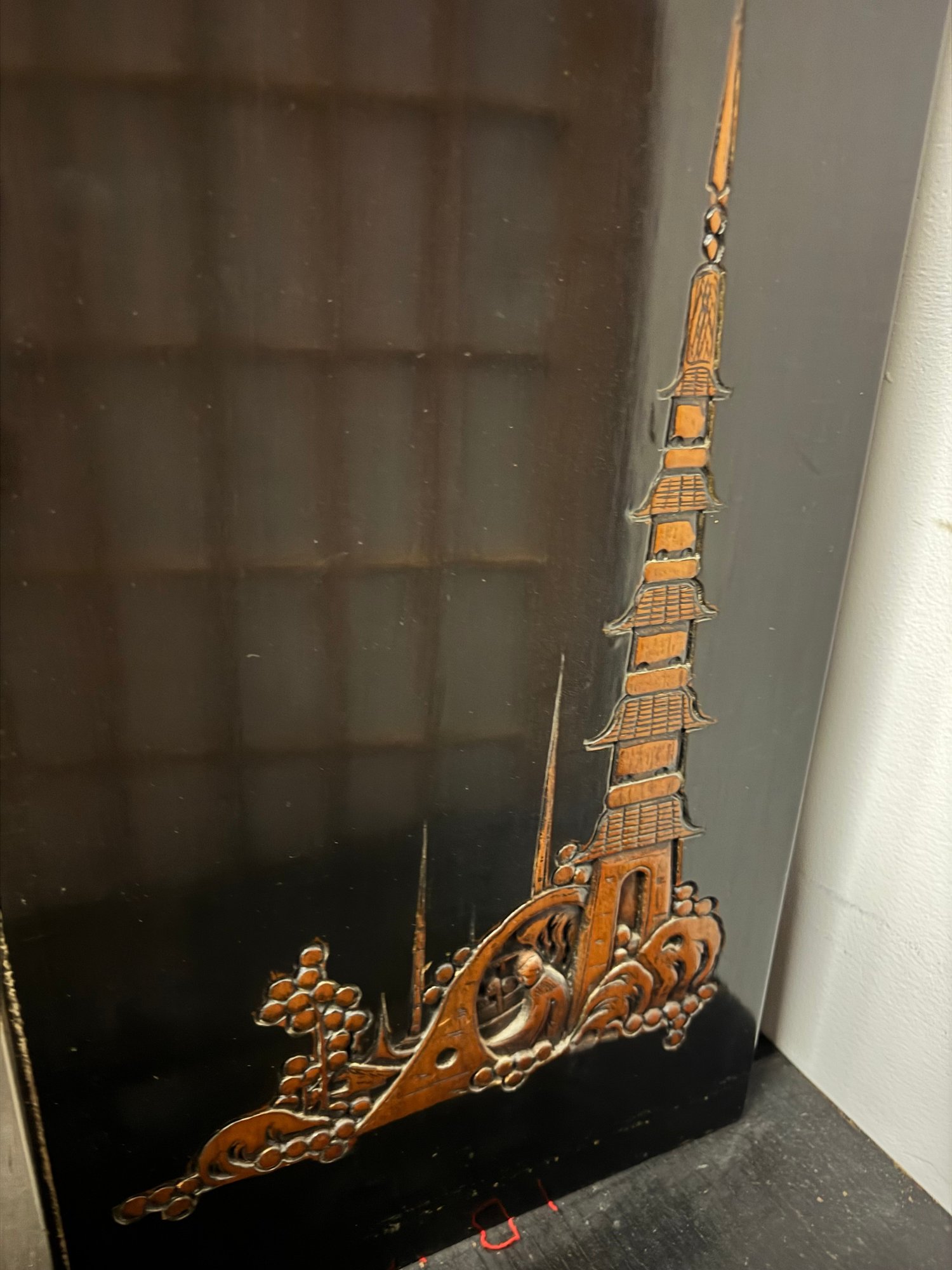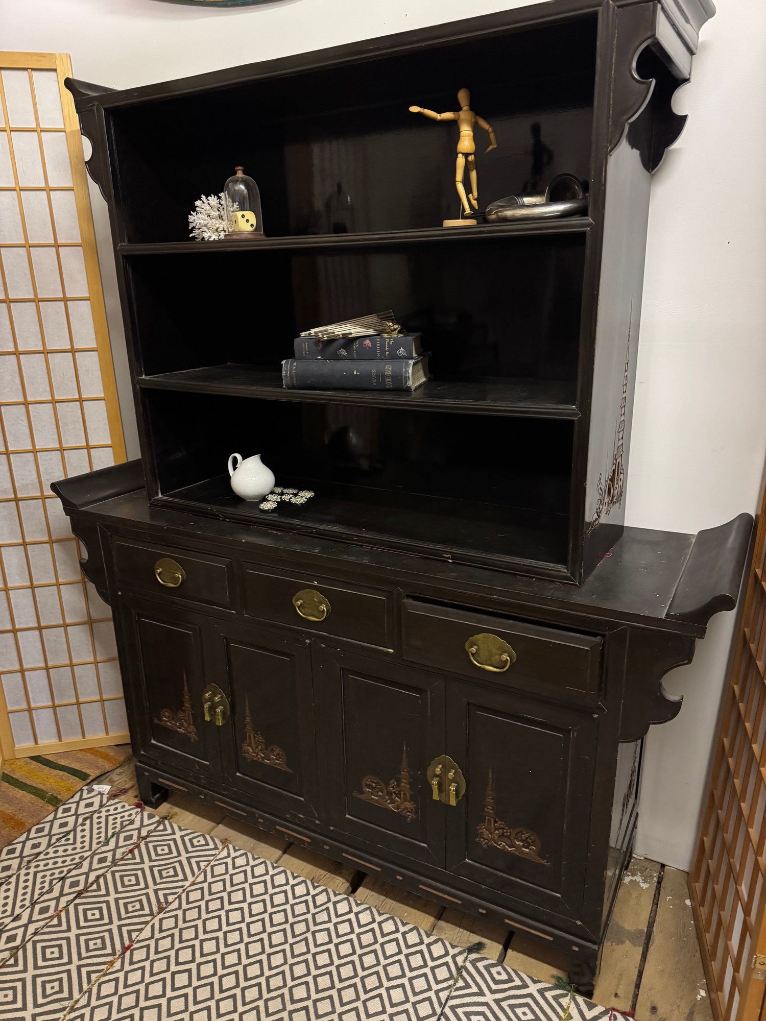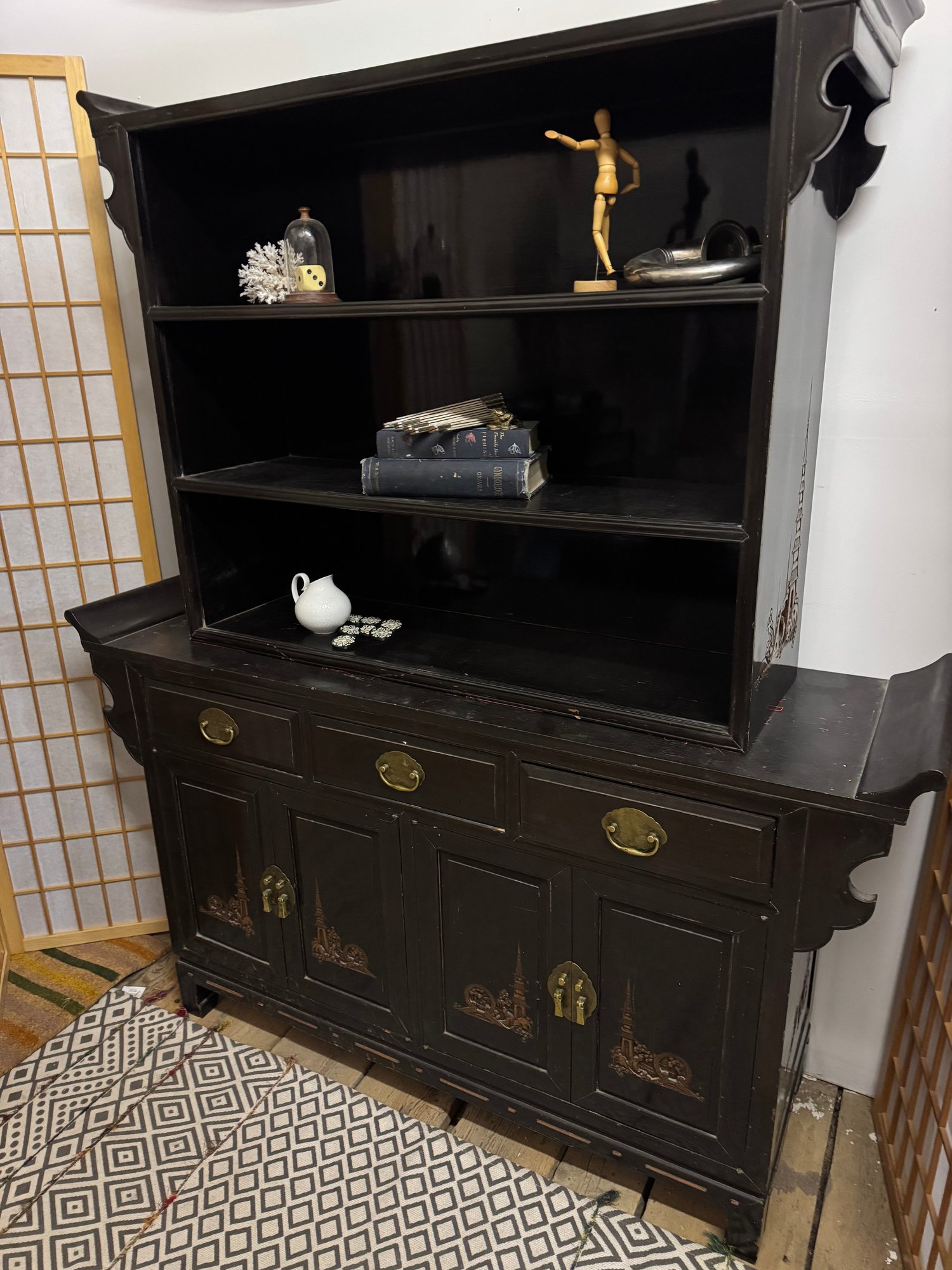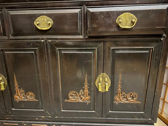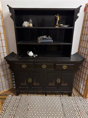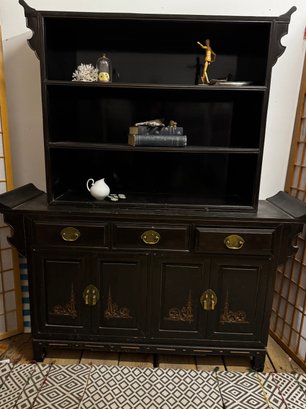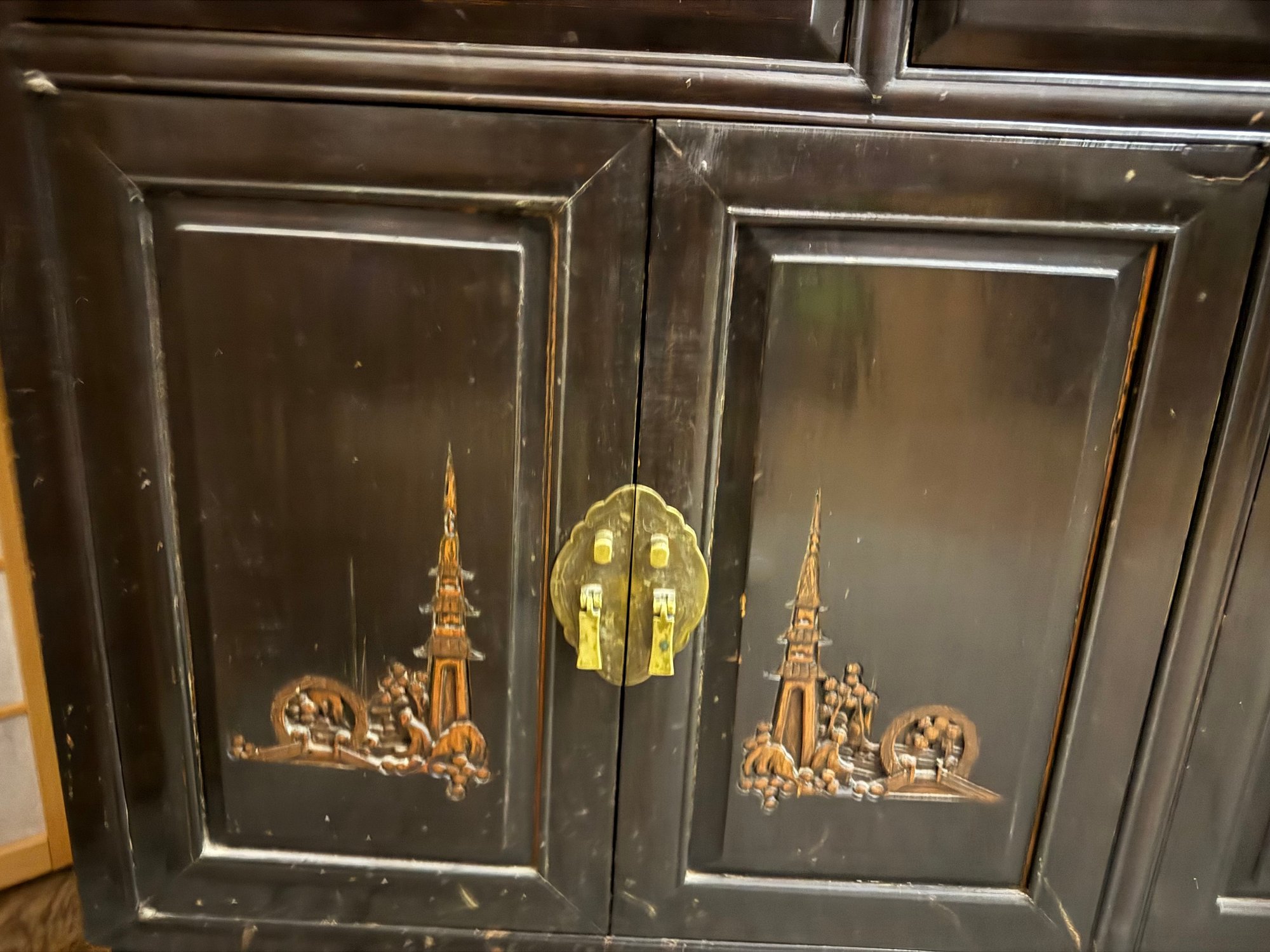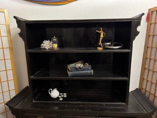 Originally brought to the US from Taiwan in the 1960s, this is a stunning piece with a removable top shelf unit and sturdy console below. The doors and sides show intricate carved decore, see pictures for sizing and best representation. Solid wood, great for display and storage.